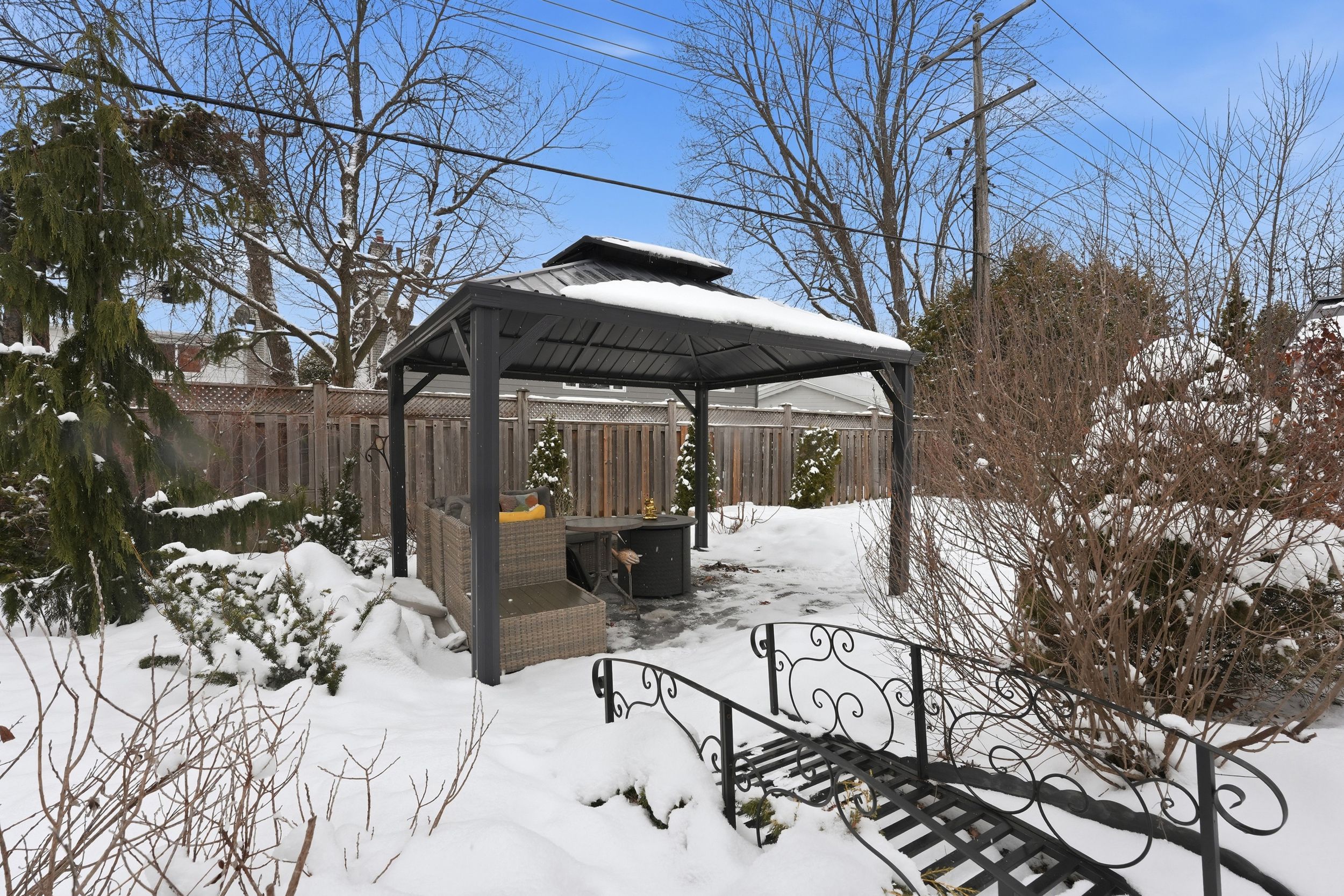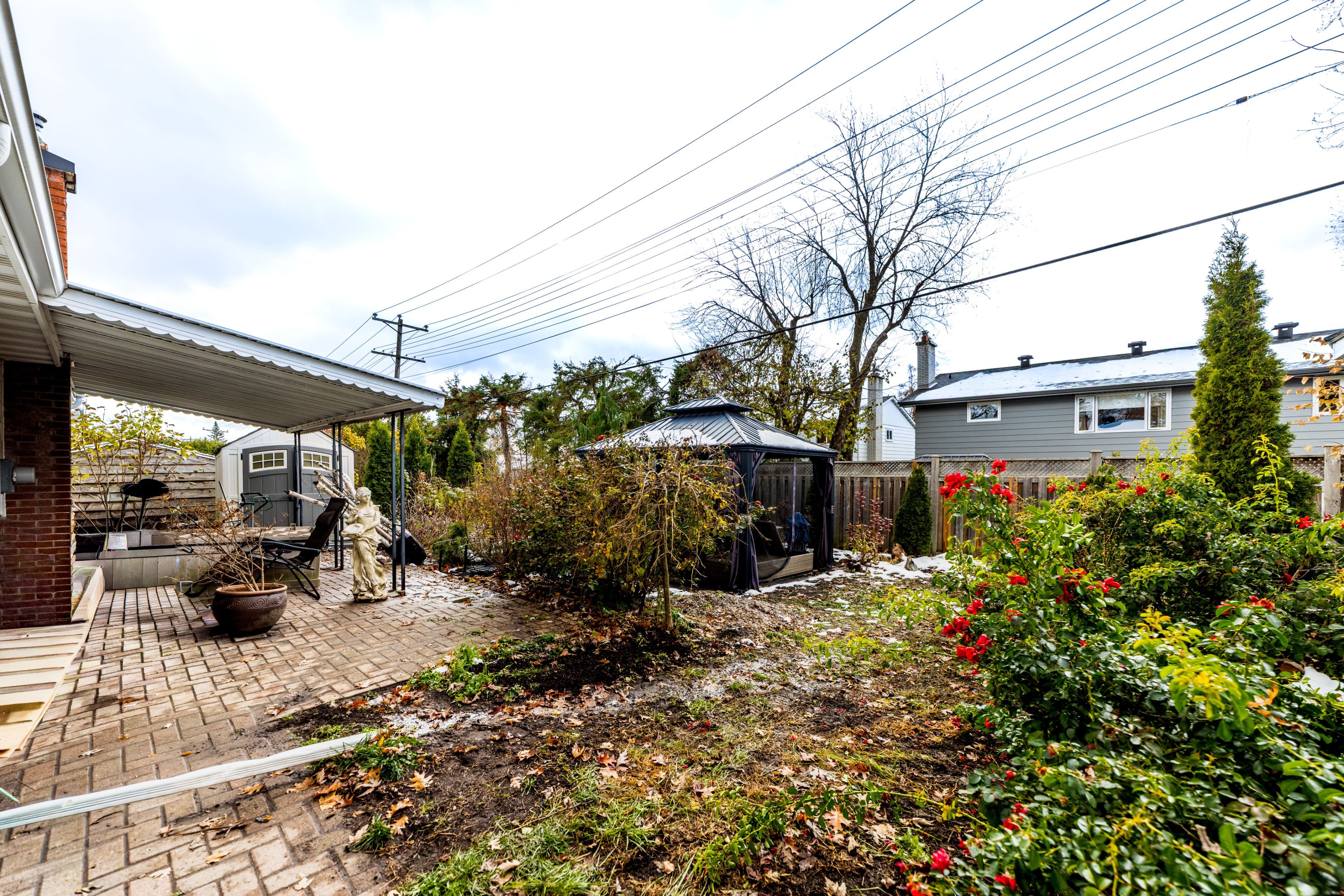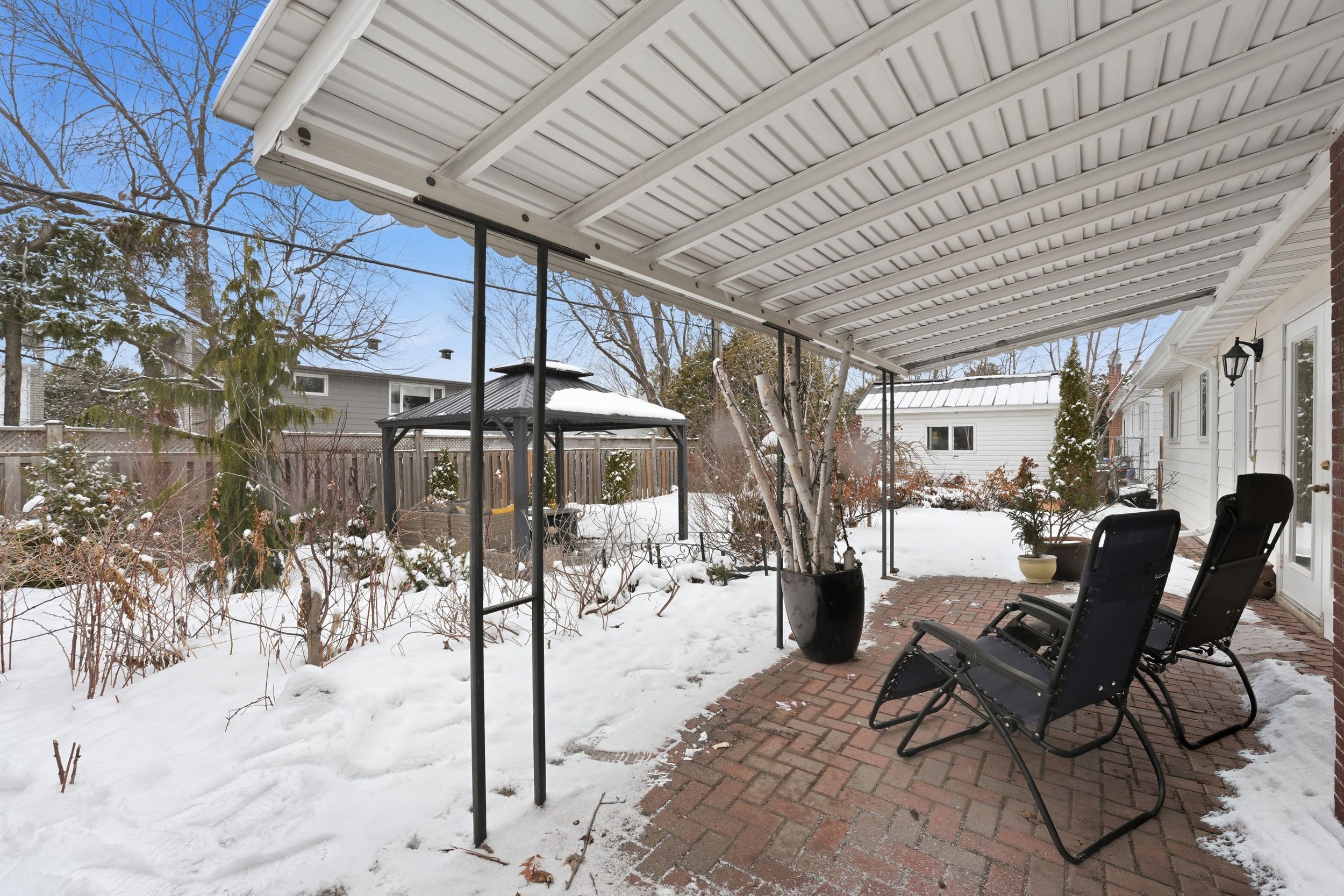 • Private backyard oasis with a covered patio, gazebo, and storage sheds.