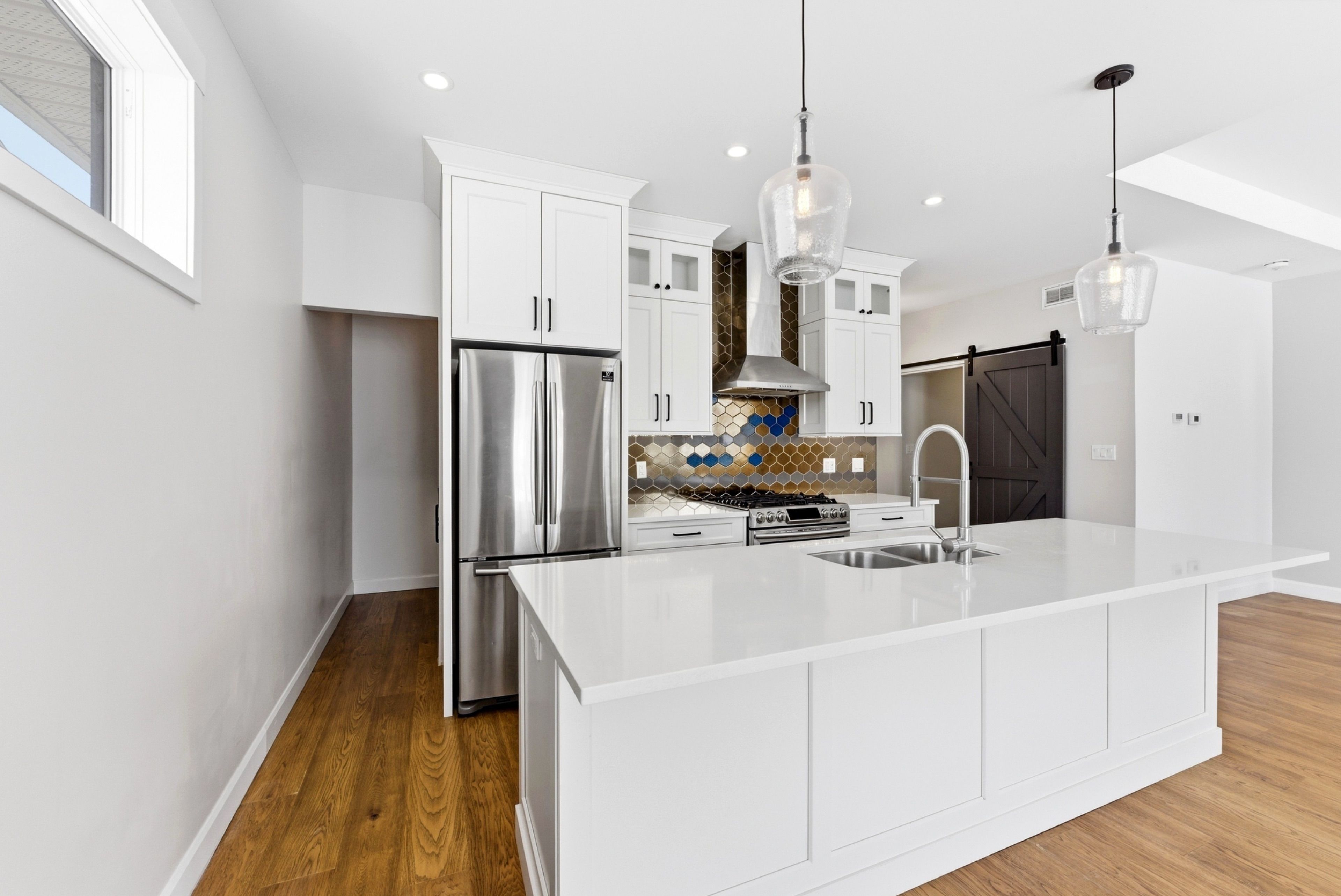 • Stunning kitchen features quartz countertops, custom backsplash, and coffee station.