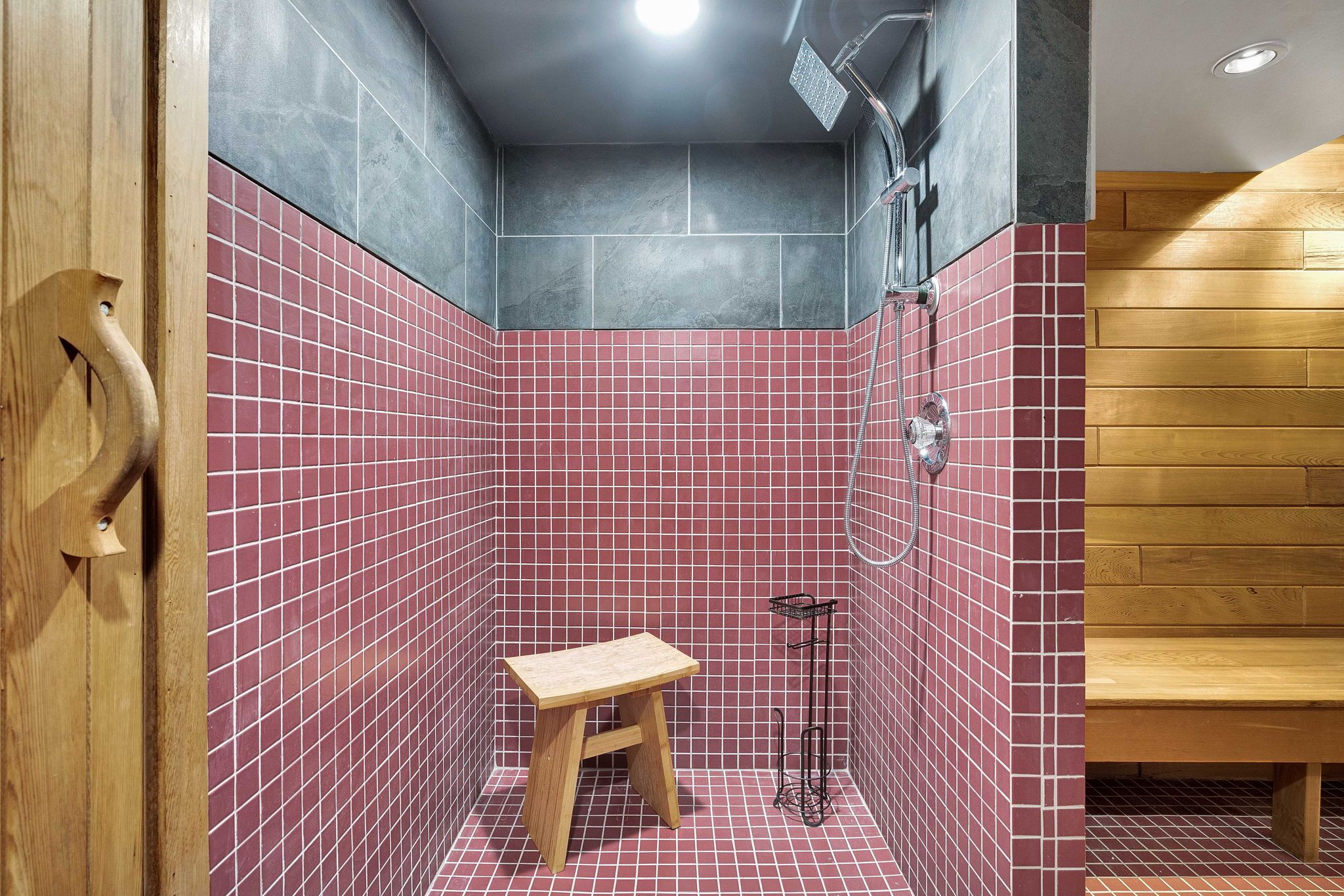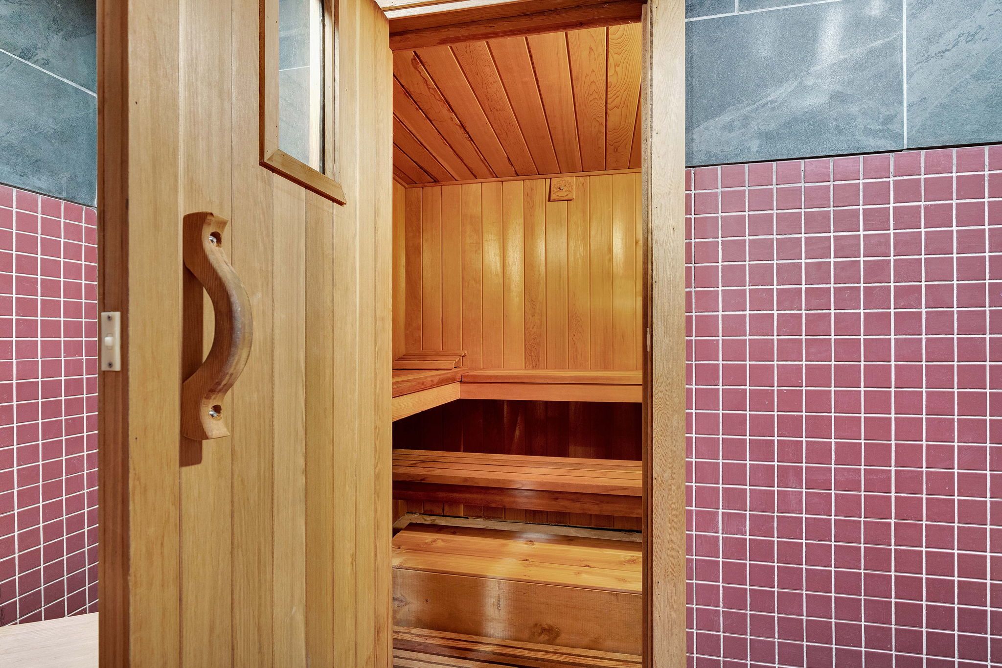 • Finished lower level offers rec room, wet bar, sauna, and flexible spaces.