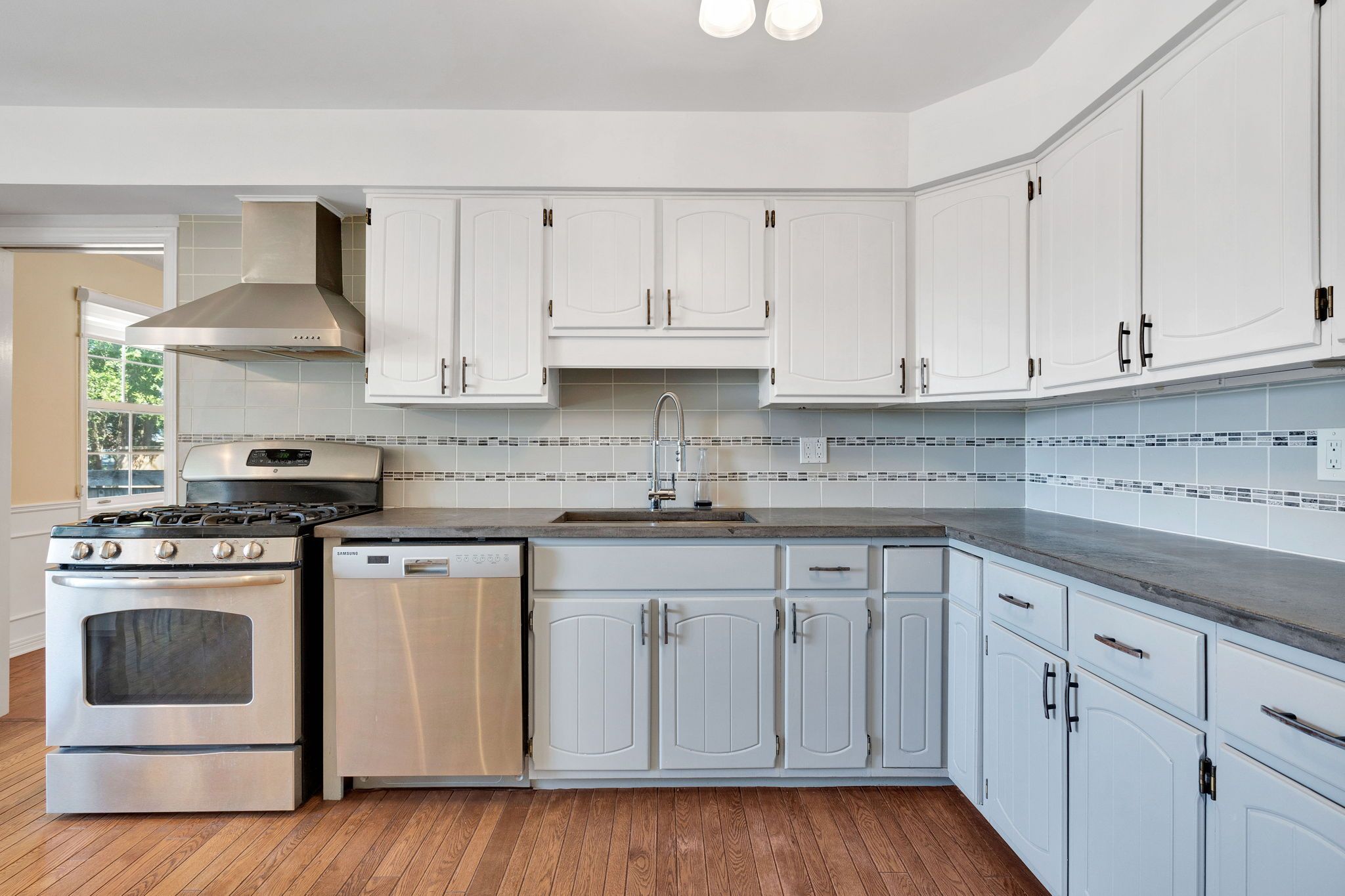 • Bright kitchen features concrete counters and oversized window with backyard views.