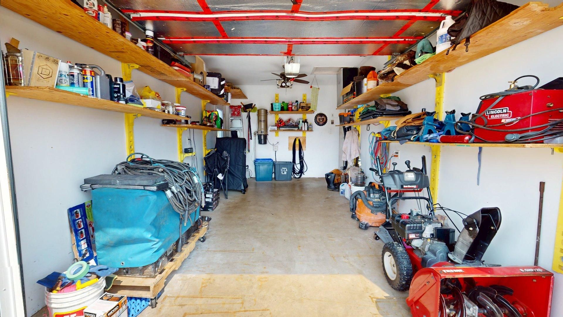 • Garage equipped with modular shelving, ceiling fan, and powerful heater.