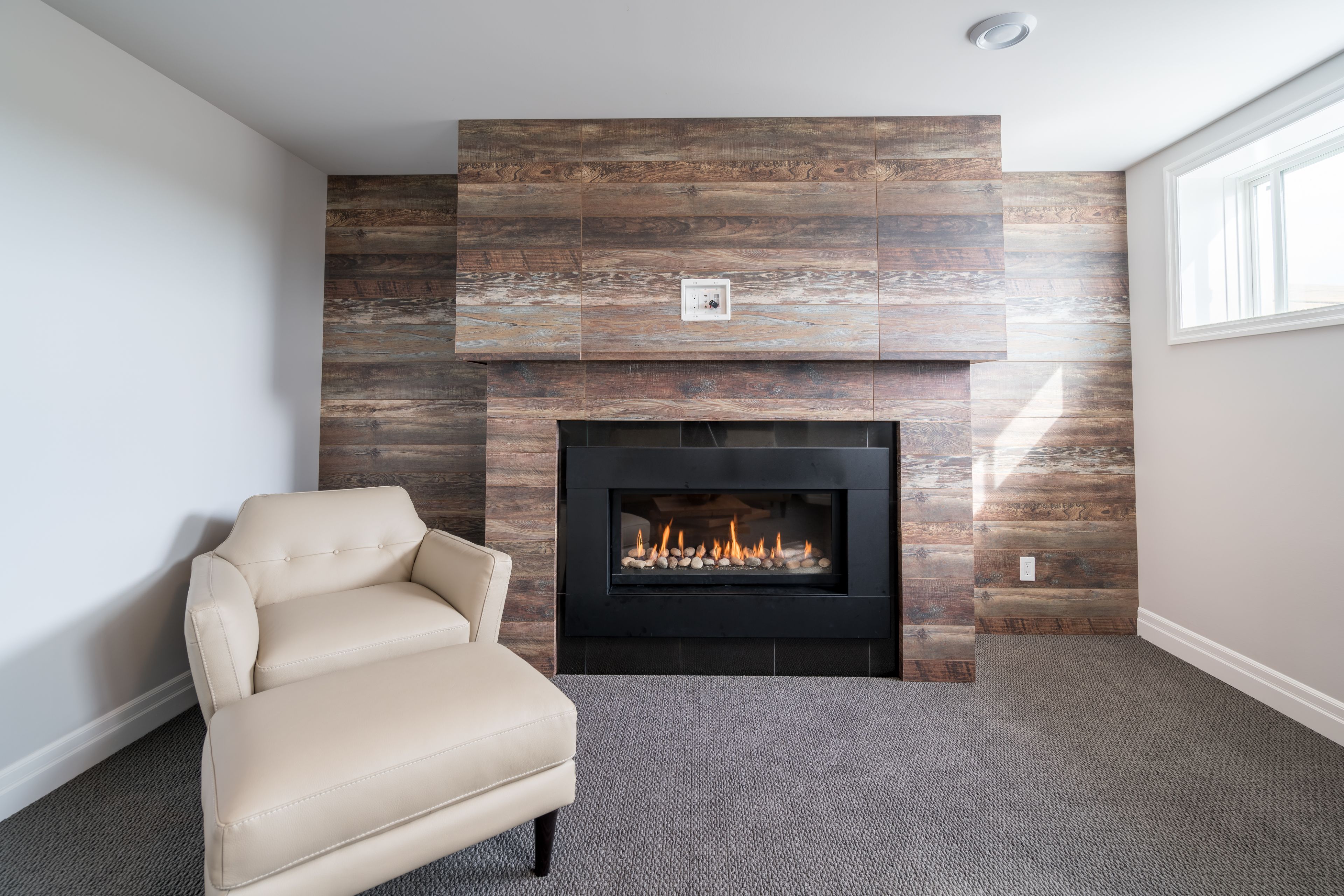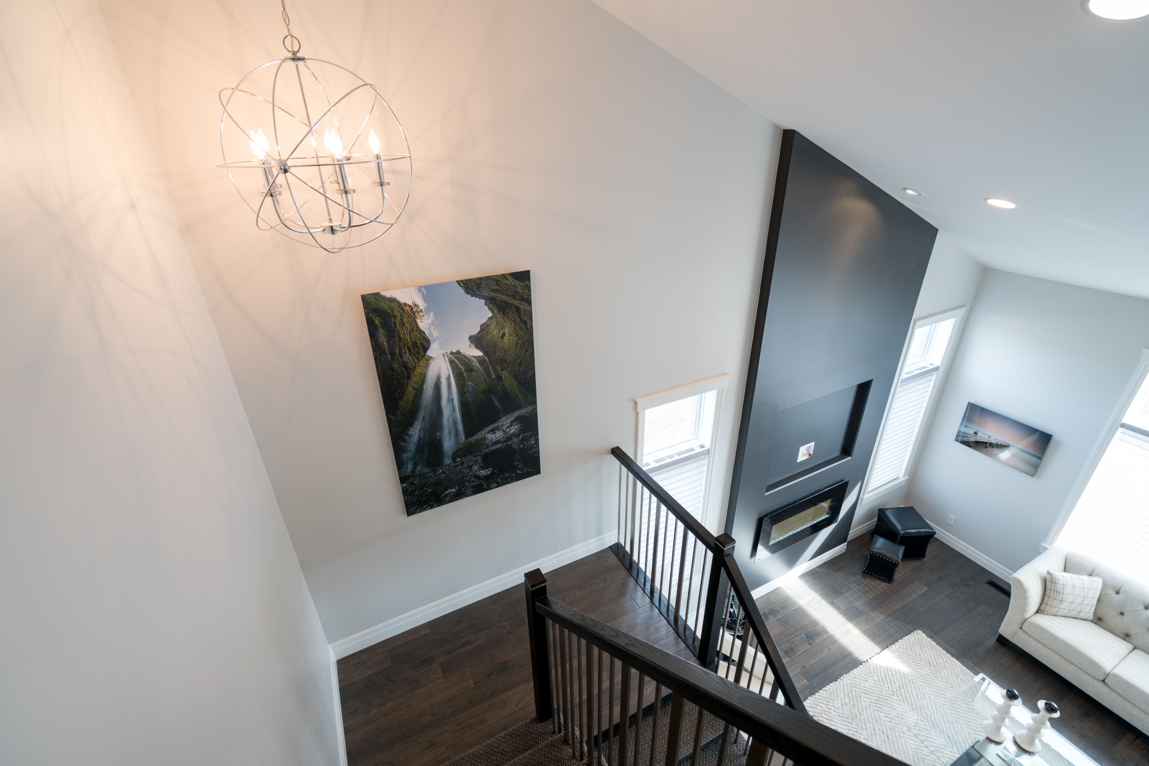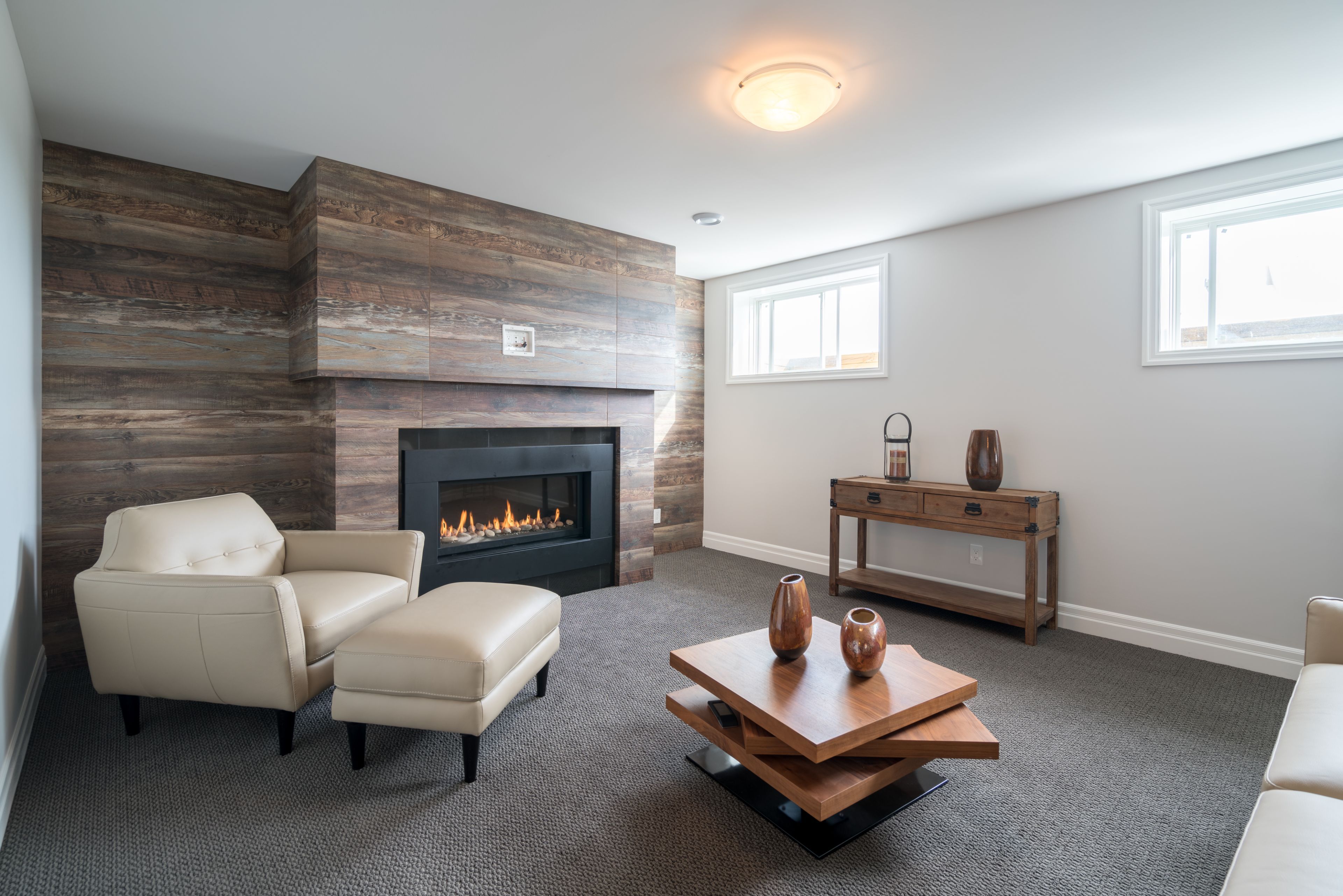 • Great room features soaring vaulted ceilings and an electric fireplace.