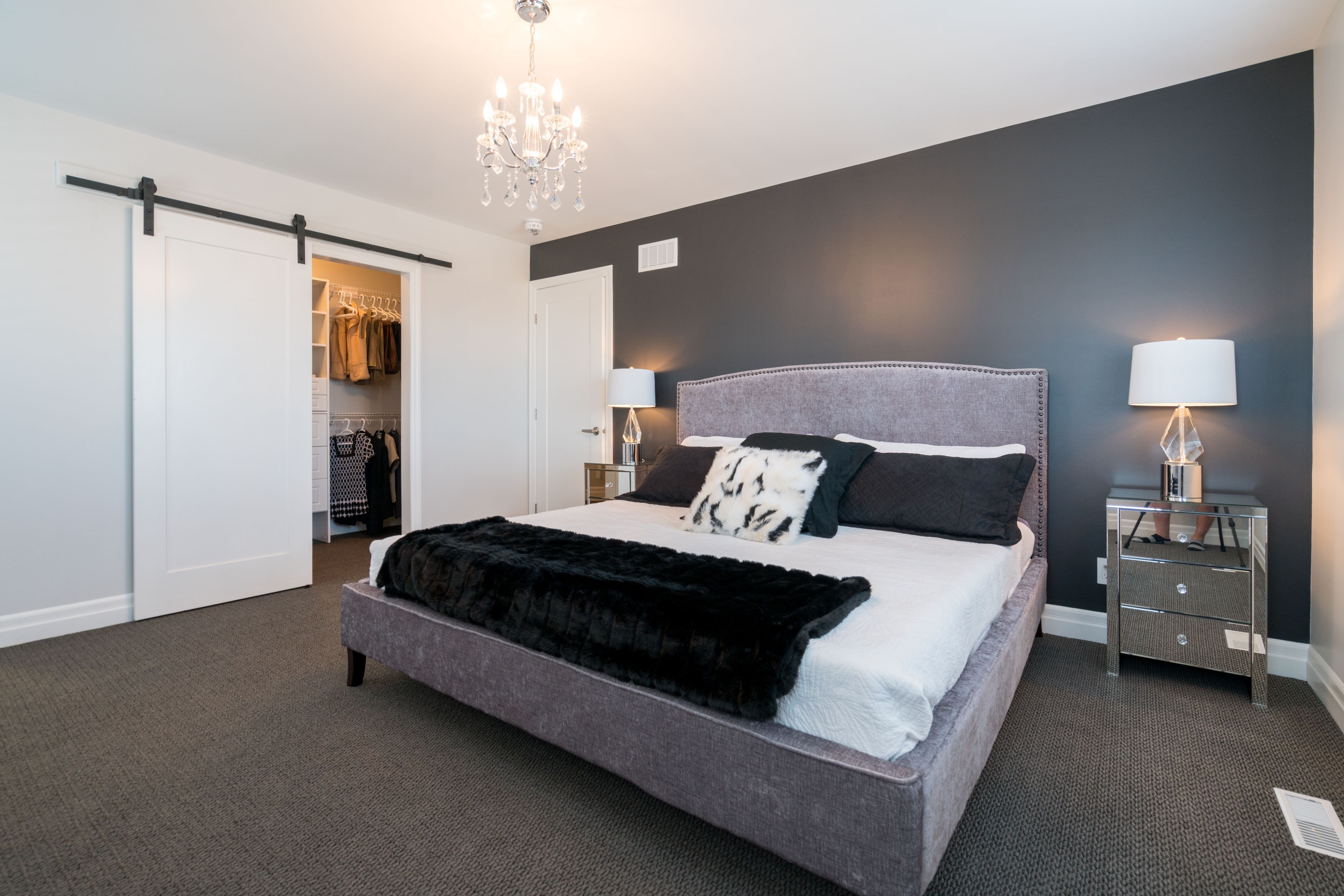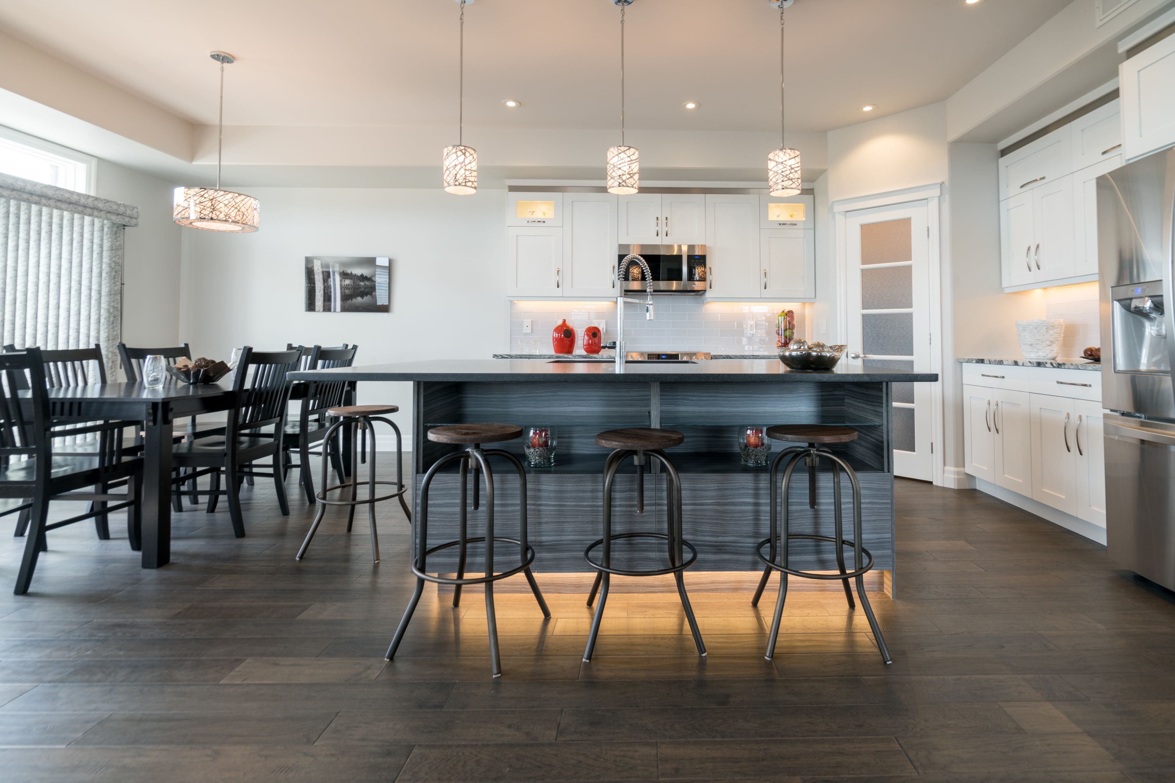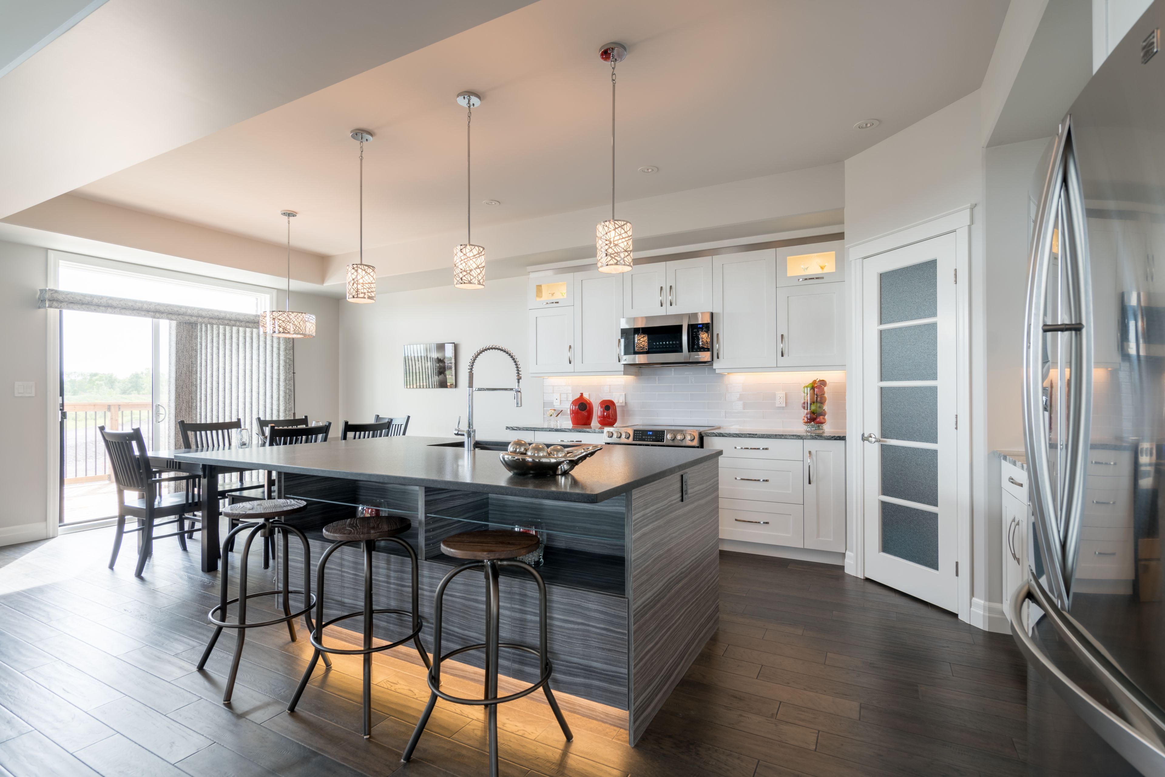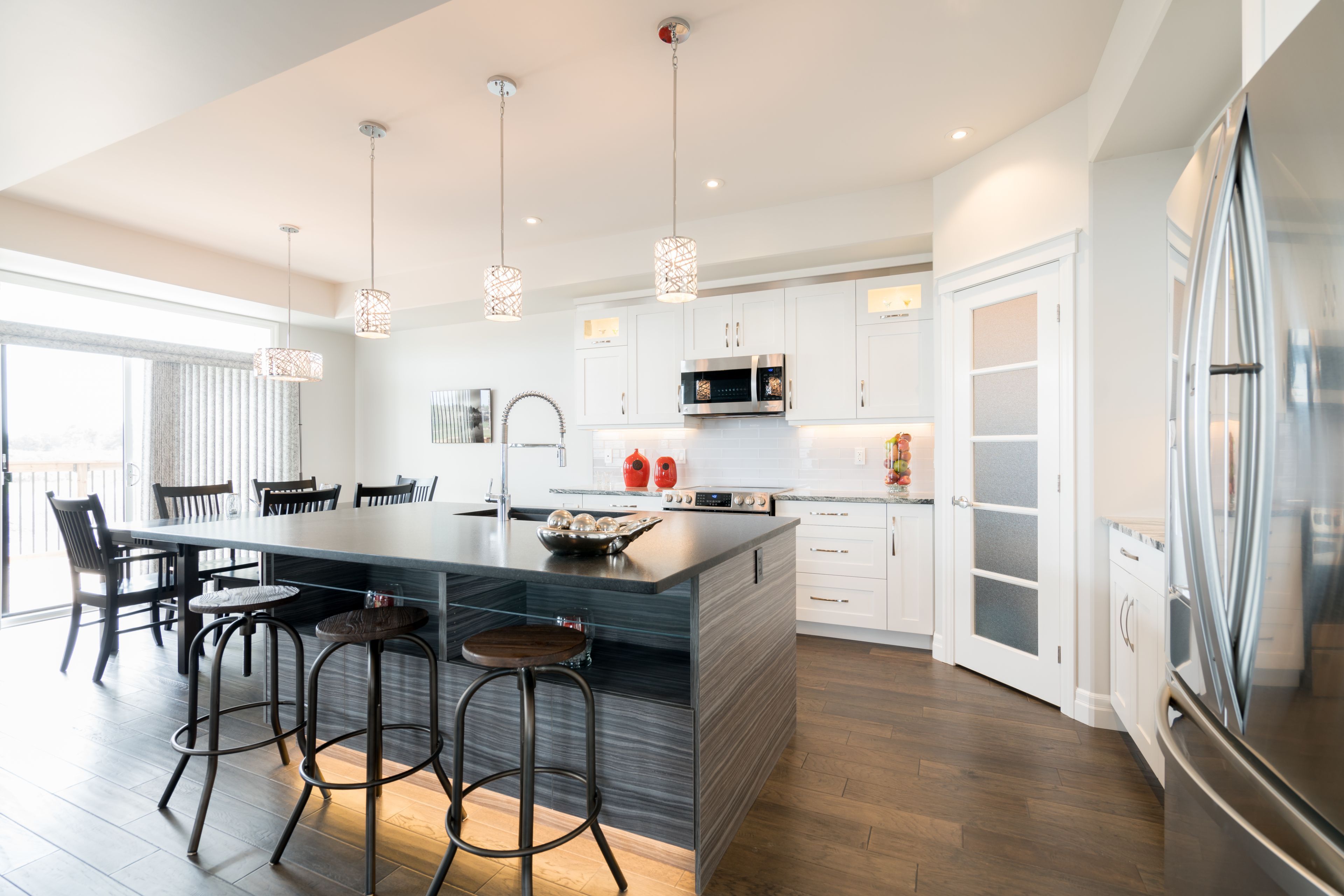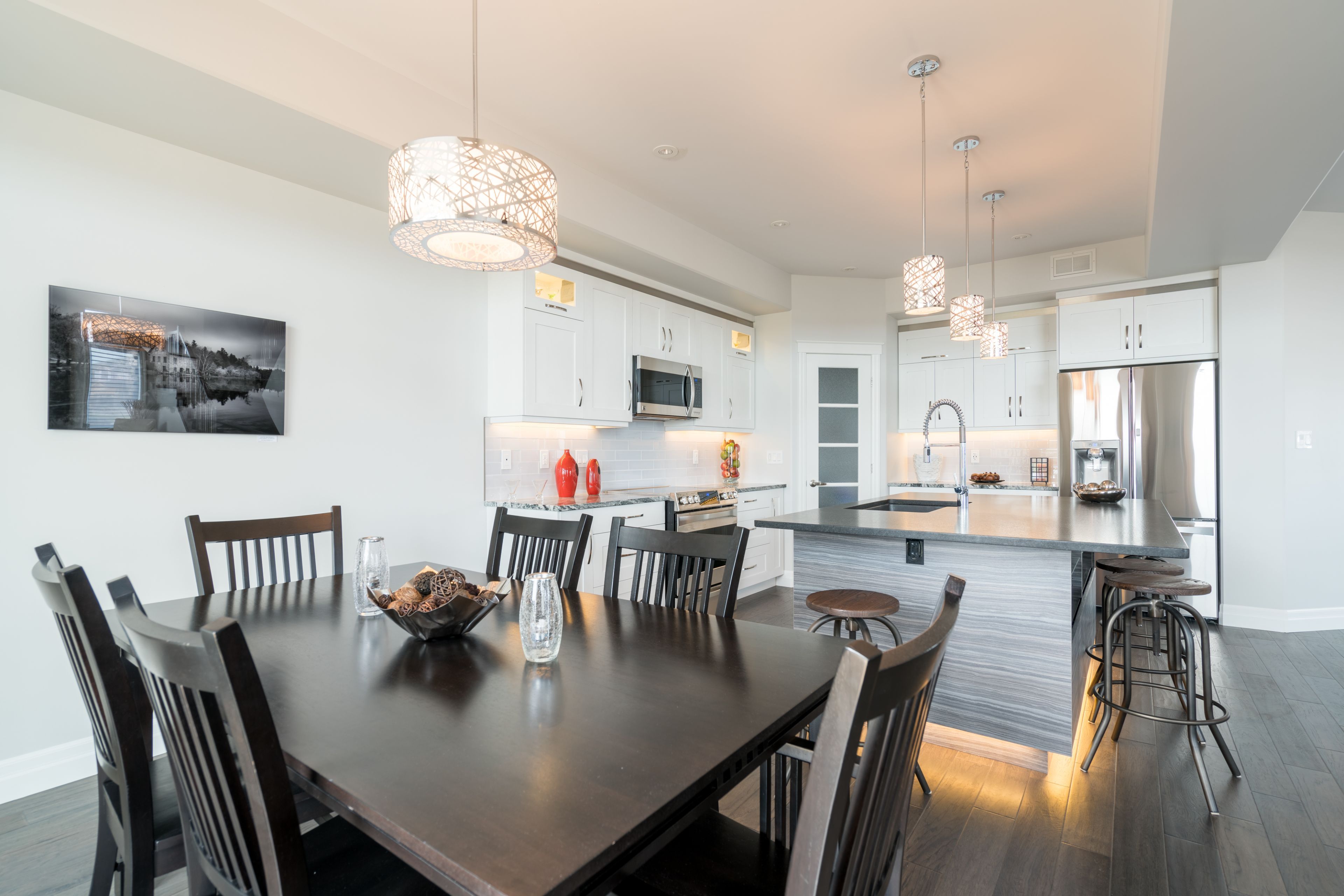• Stylish kitchen equipped with stainless appliances and a large island.