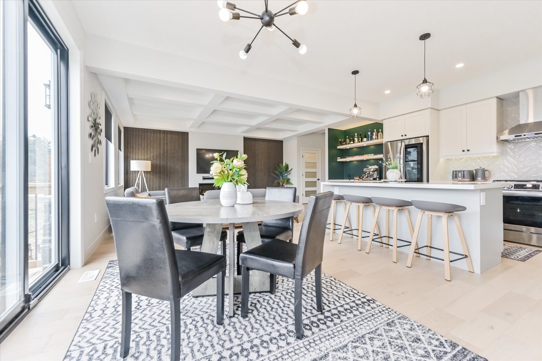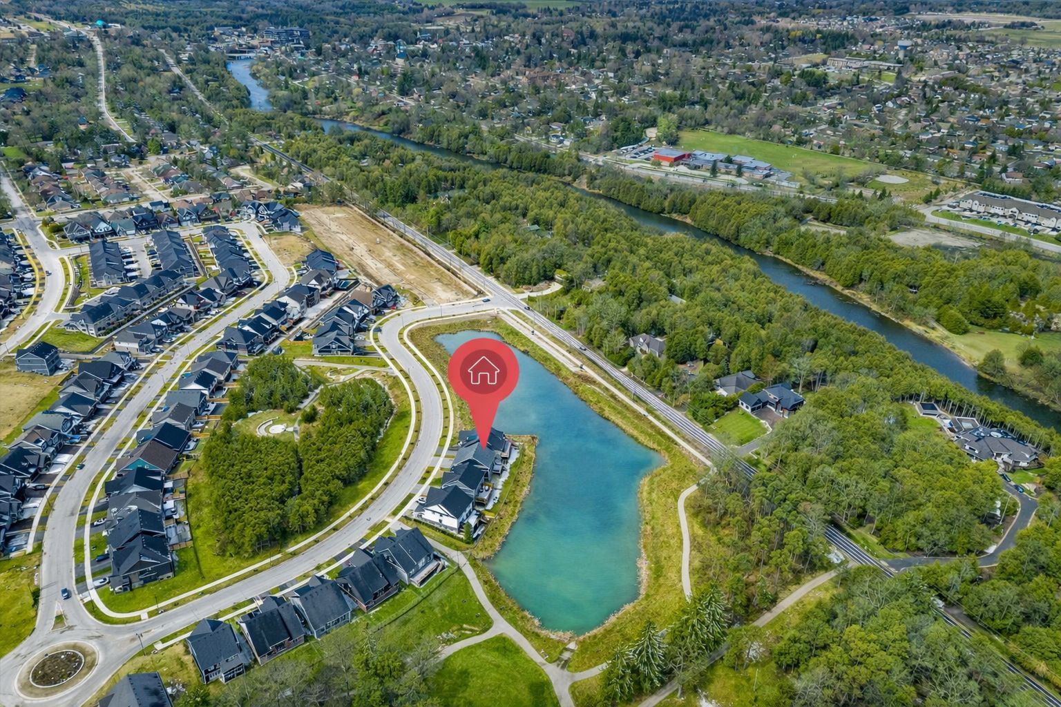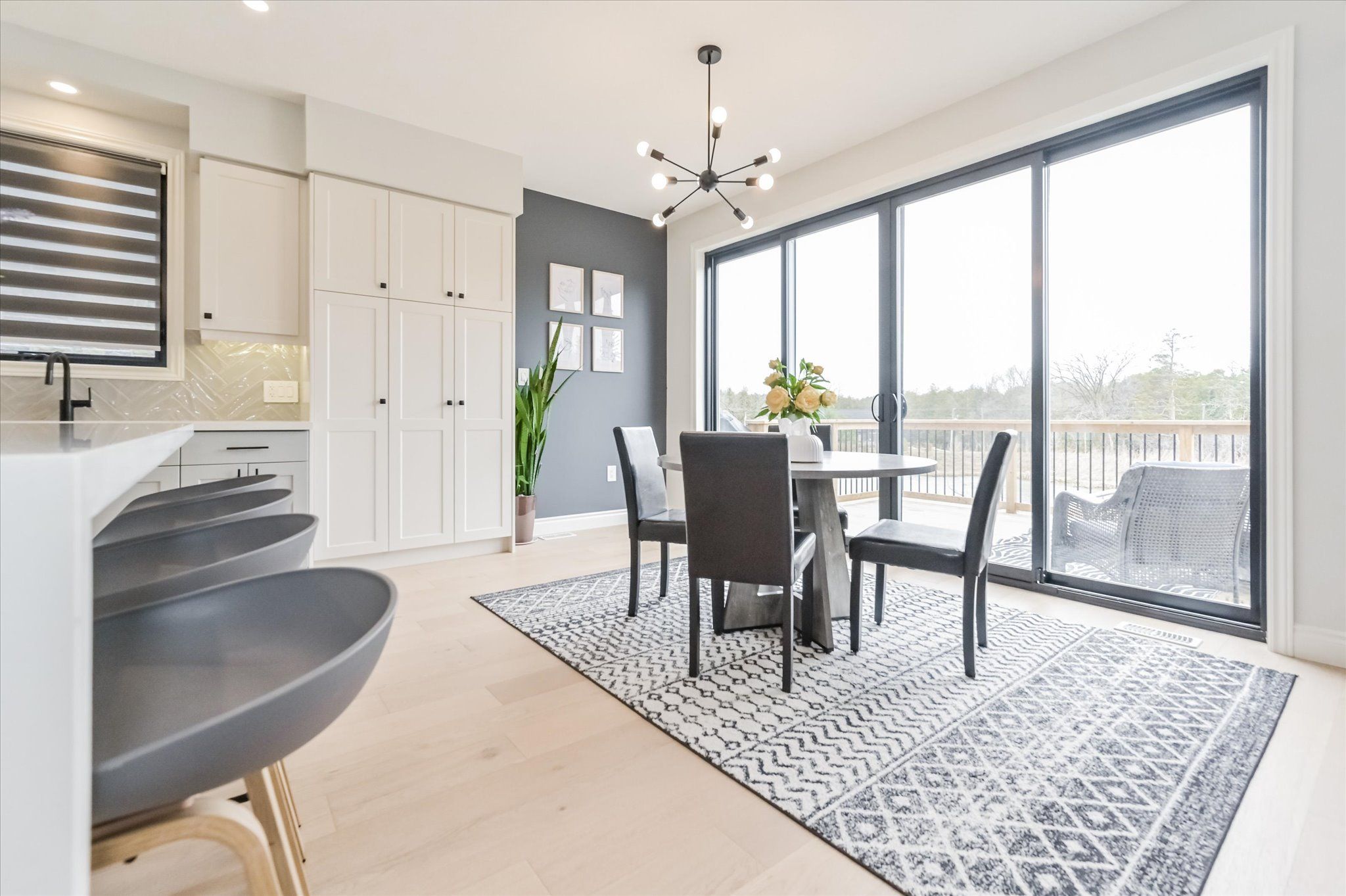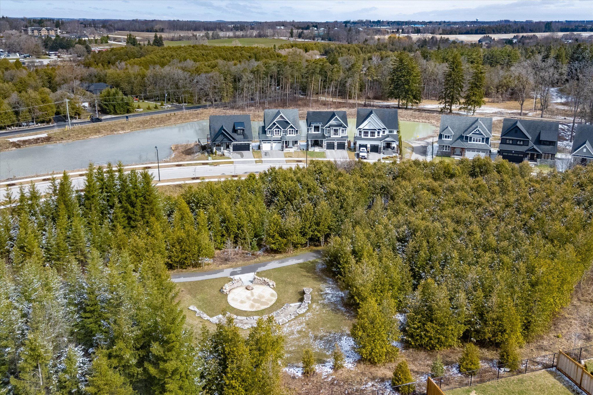 Overlooking a tranquil pond in elora's highly sought-after south river community, this 2023 granite home build offers a seamless blend of modern design and relaxed, nature-inspired living. With 4 bedrooms, 3 full bathrooms and a powder room, this home is thoughtfully laid out for both everyday comfort and stylish entertaining, just a short walk to downtown elora and nearby trails including the trestle bridge trail. Inside, every detail has been carefully considered. The kitchen stands out with a herringbone backsplash, two-tone cabinetry featuring cream uppers and light grey lowers and island, waterfall quartz countertops, sleek black hardware, a gas stove, and a custom coffee bar. The family room is warm and inviting, highlighted by a gas fireplace, walnut slat feature walls, and coffered ceilings that add depth and character. A striking glass staircase leads to the upper level, where a spa-like bathroom features a waterfall shower with niche and glass surround. White oak flooring and black window frames carry a clean, modern feel throughout. The finished walkout basement is bright and functional, offering additional living space with direct access to the backyard and peaceful water views. Complete with a double car garage and refined finishes throughout, this home presents a beautifully finished opportunity in one of elora's most desirable neighbourhoods. Quick closing available.