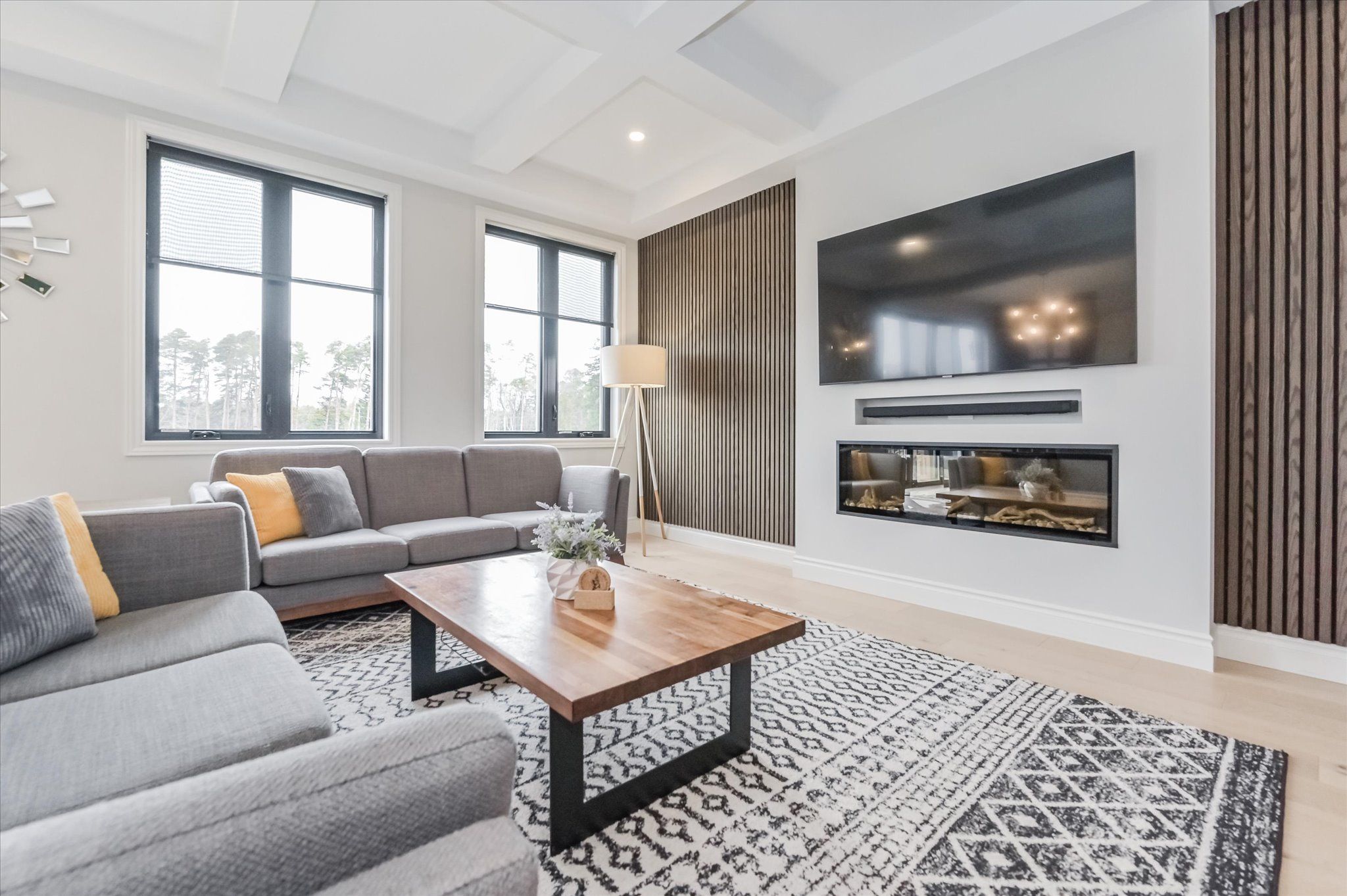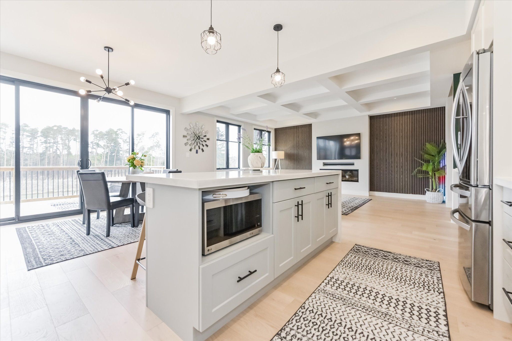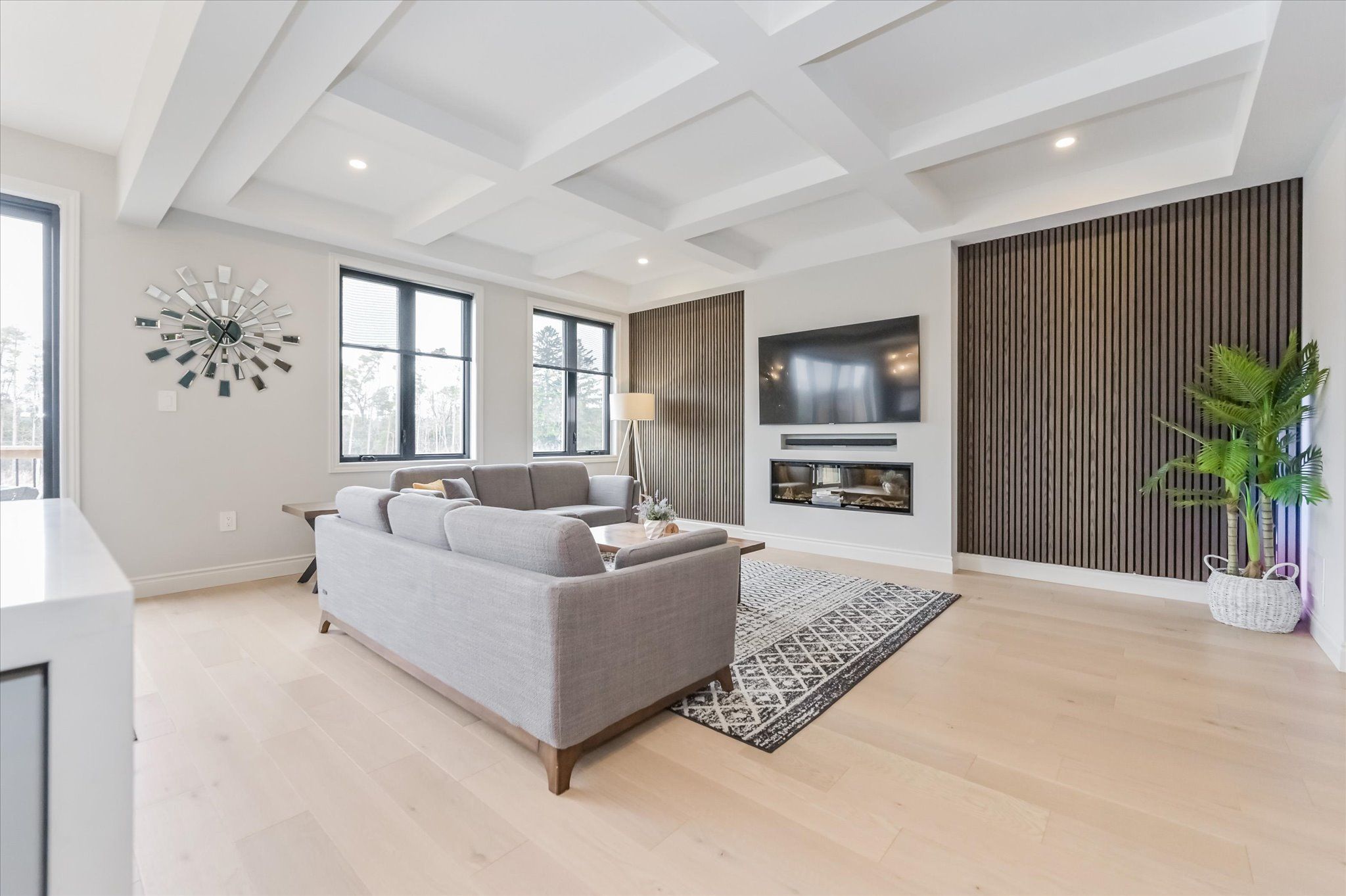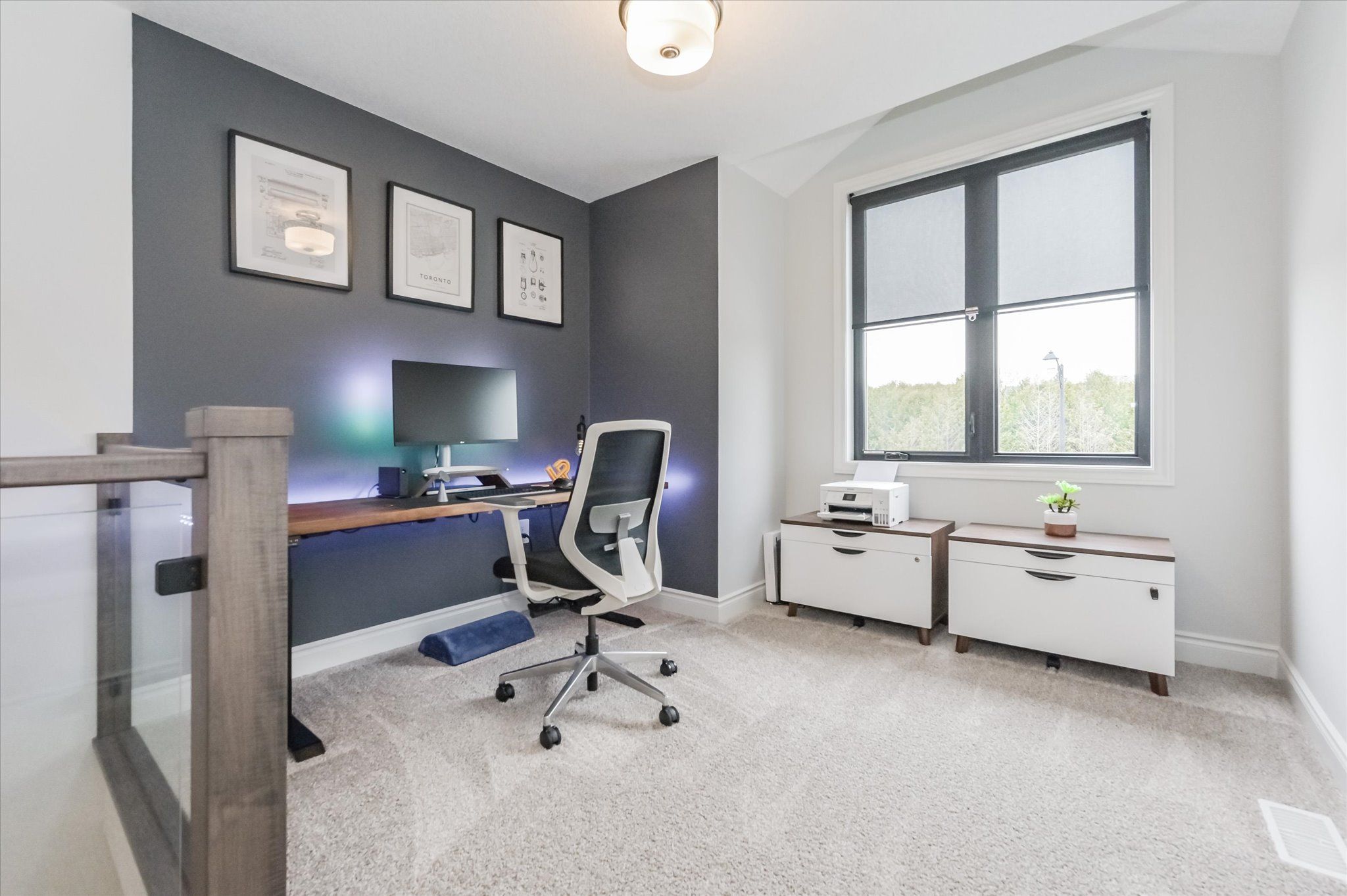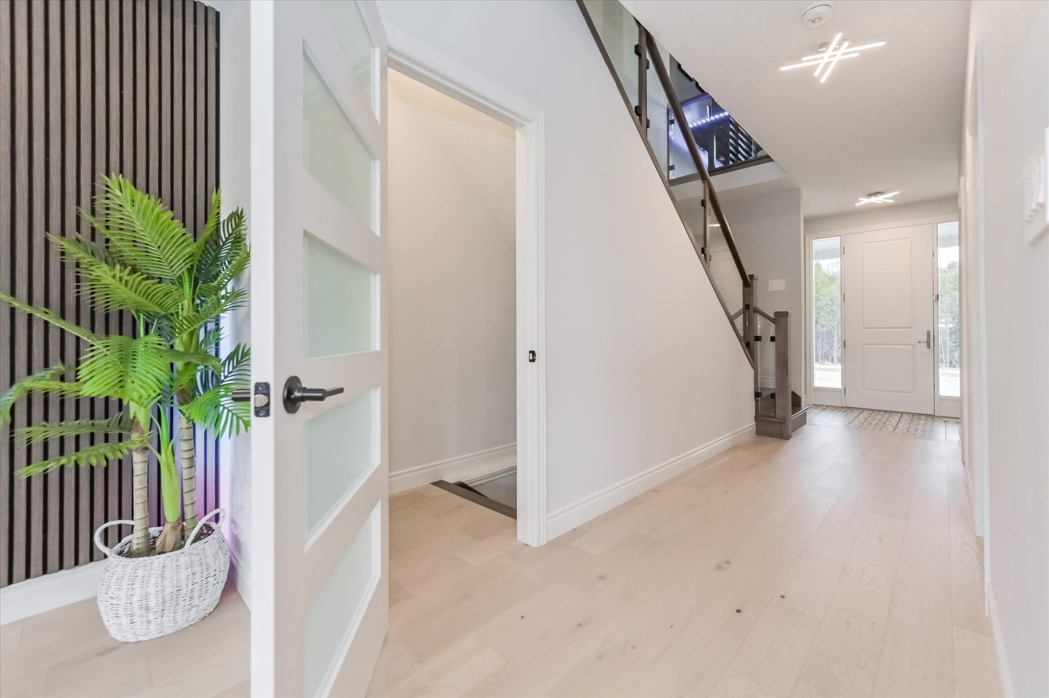 Overlooking a tranquil pond in elora's highly sought-after south river community, this 2023 granite home build offers a seamless blend of modern design and relaxed, nature-inspired living. With 4 bedrooms, 3 full bathrooms and a powder room, this home is thoughtfully laid out for both everyday comfort and stylish entertaining, just a short walk to downtown elora and nearby trails including the trestle bridge trail. Inside, every detail has been carefully considered. The kitchen stands out with a herringbone backsplash, two-tone cabinetry featuring cream uppers and light grey lowers and island, waterfall quartz countertops, sleek black hardware, a gas stove, and a custom coffee bar. The family room is warm and inviting, highlighted by a gas fireplace, walnut slat feature walls, and coffered ceilings that add depth and character. A striking glass staircase leads to the upper level, where a spa-like bathroom features a waterfall shower with niche and glass surround. White oak flooring and black window frames carry a clean, modern feel throughout. The finished walkout basement is bright and functional, offering additional living space with direct access to the backyard and peaceful water views. Complete with a double car garage and refined finishes throughout, this home presents a beautifully finished opportunity in one of elora's most desirable neighbourhoods. Quick closing available.