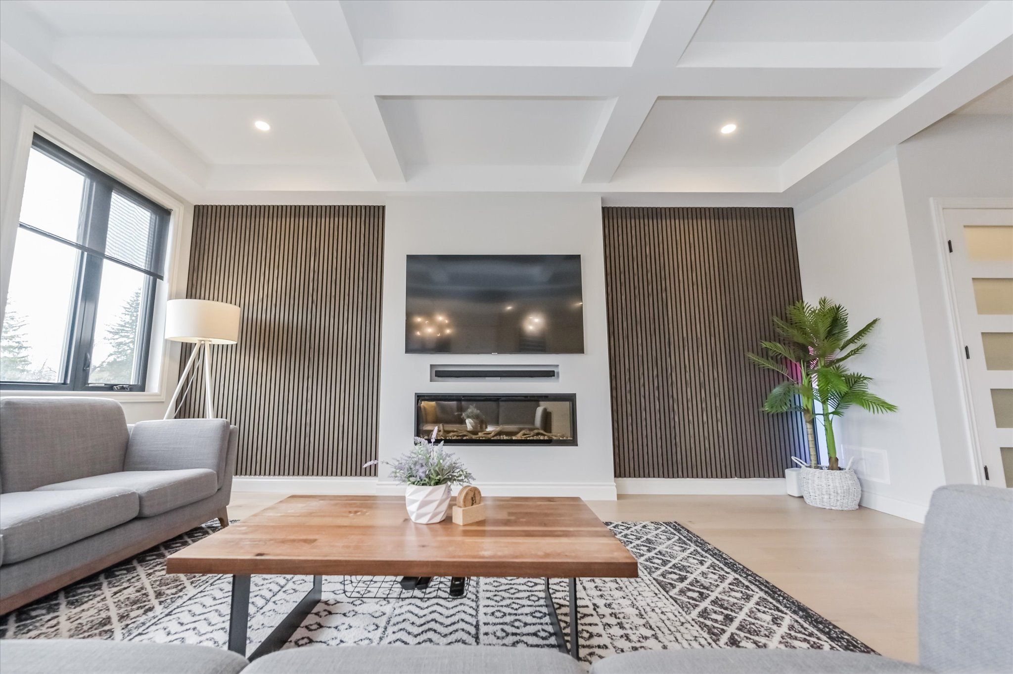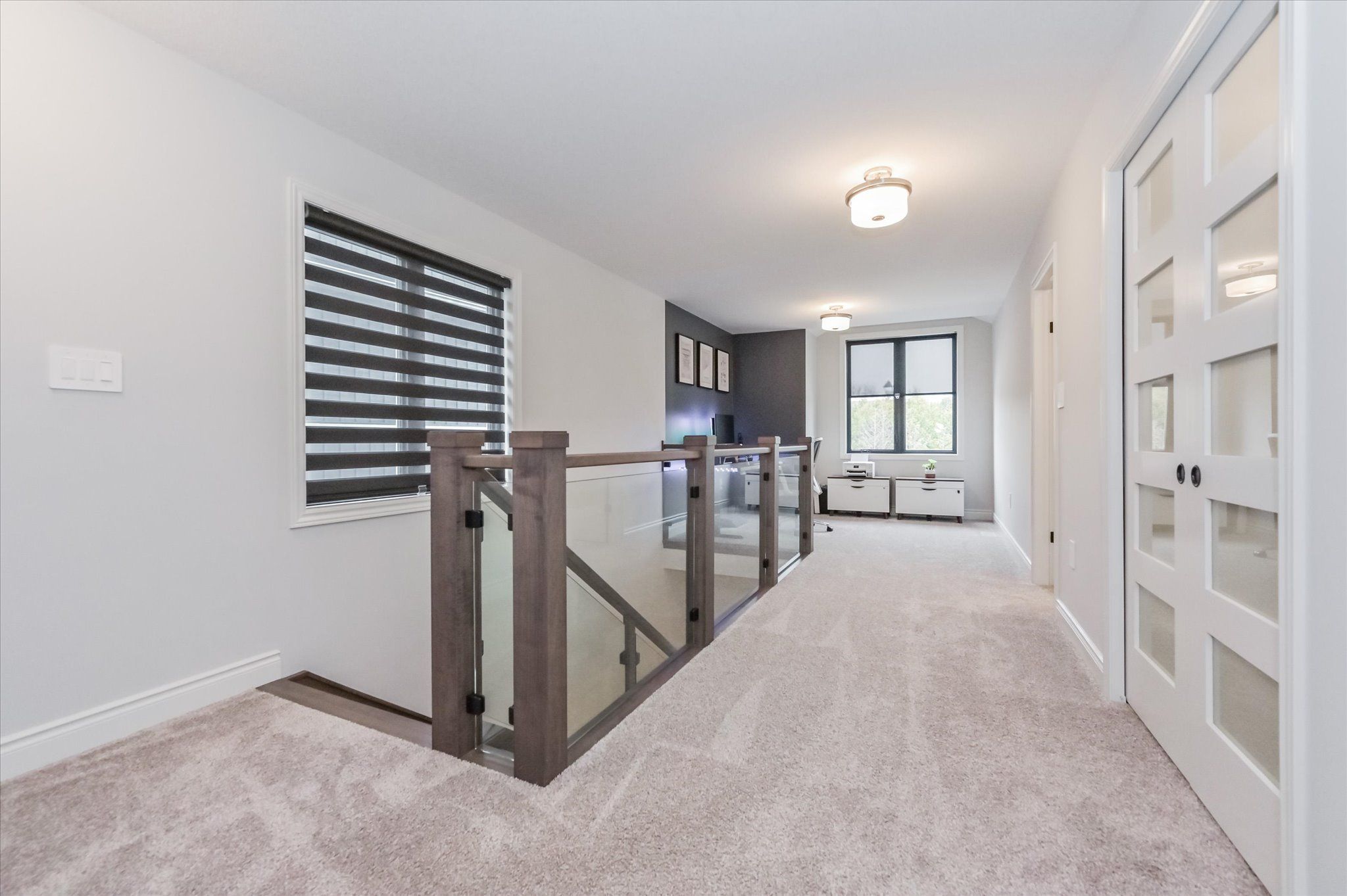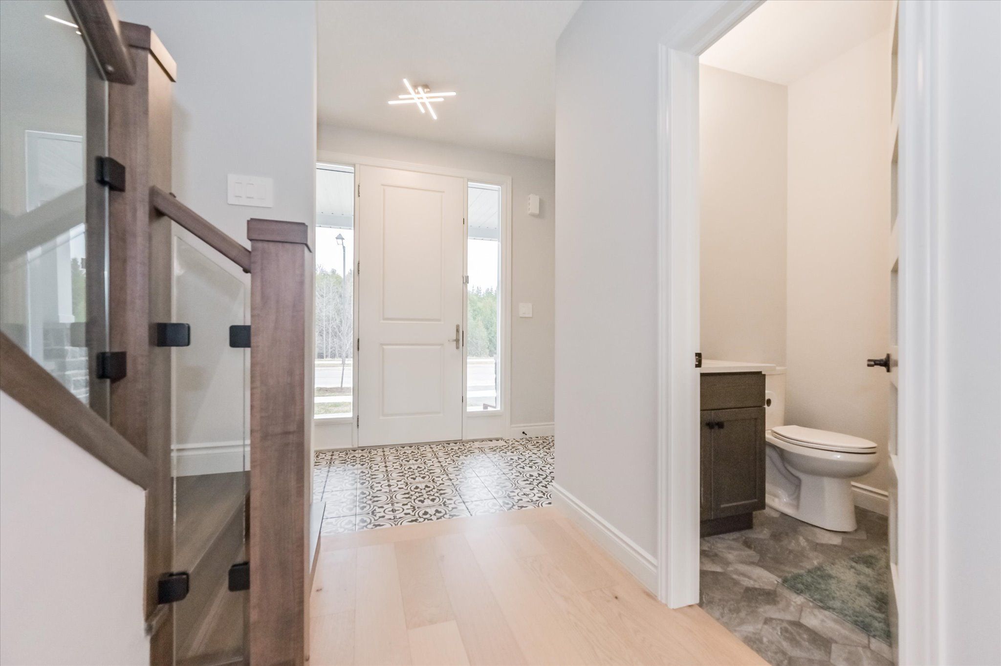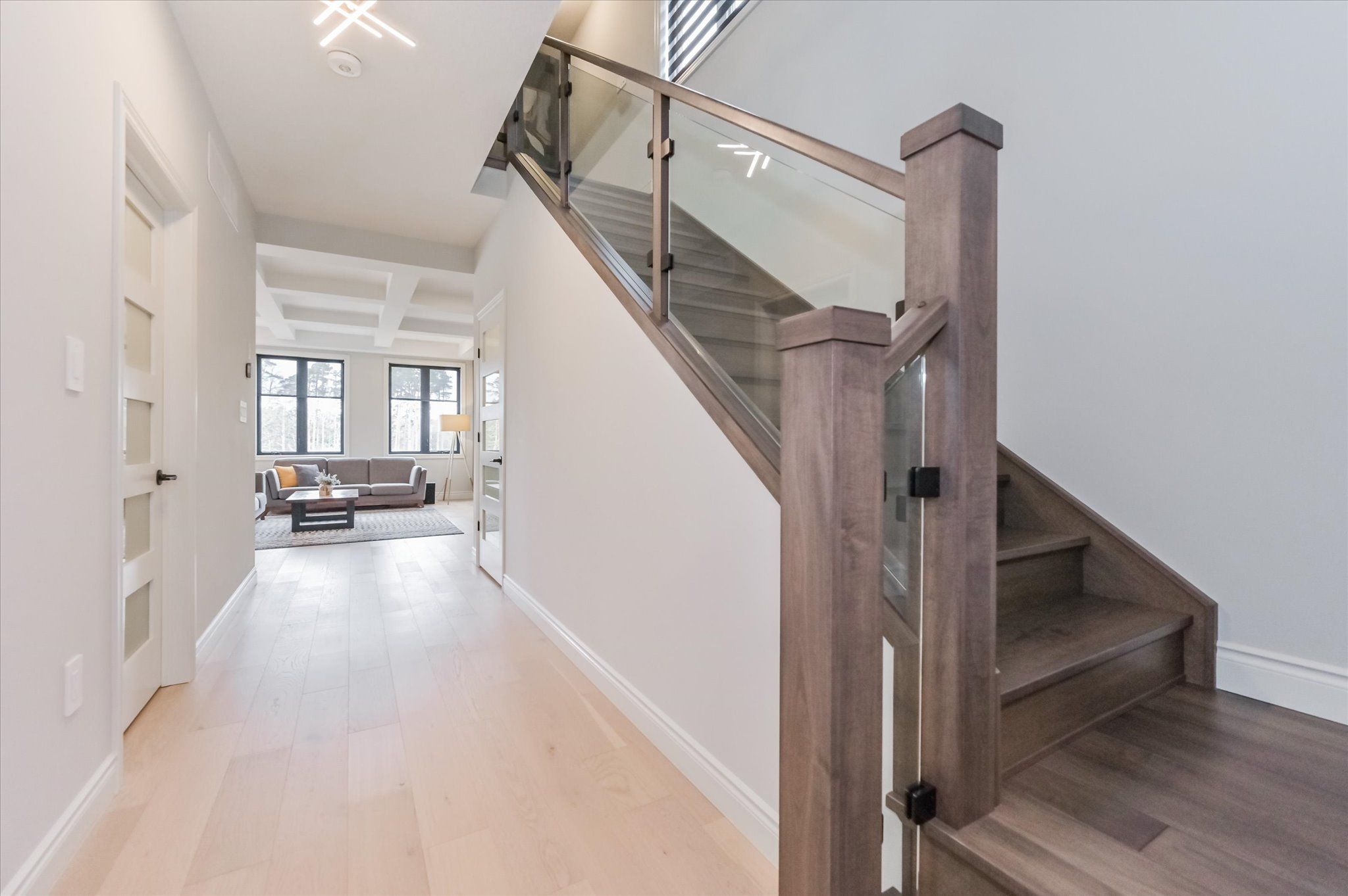 Overlooking a tranquil pond in elora's highly sought-after south river community, this 2023 granite home build offers a seamless blend of modern design and relaxed, nature-inspired living. With 4 bedrooms, 3 full bathrooms and a powder room, this home is thoughtfully laid out for both everyday comfort and stylish entertaining, just a short walk to downtown elora and nearby trails including the trestle bridge trail. Inside, every detail has been carefully considered. The kitchen stands out with a herringbone backsplash, two-tone cabinetry featuring cream uppers and light grey lowers and island, waterfall quartz countertops, sleek black hardware, a gas stove, and a custom coffee bar. The family room is warm and inviting, highlighted by a gas fireplace, walnut slat feature walls, and coffered ceilings that add depth and character. A striking glass staircase leads to the upper level, where a spa-like bathroom features a waterfall shower with niche and glass surround. White oak flooring and black window frames carry a clean, modern feel throughout. The finished walkout basement is bright and functional, offering additional living space with direct access to the backyard and peaceful water views. Complete with a double car garage and refined finishes throughout, this home presents a beautifully finished opportunity in one of elora's most desirable neighbourhoods. Quick closing available.