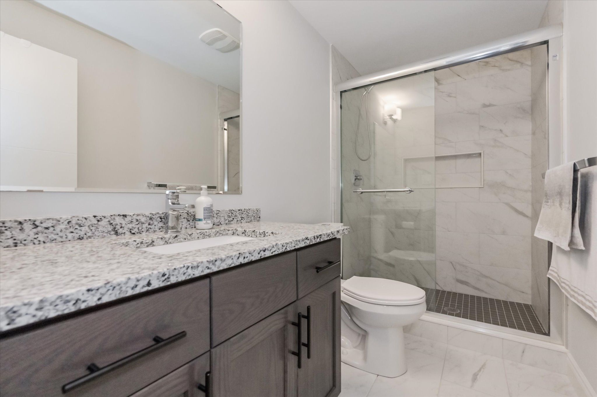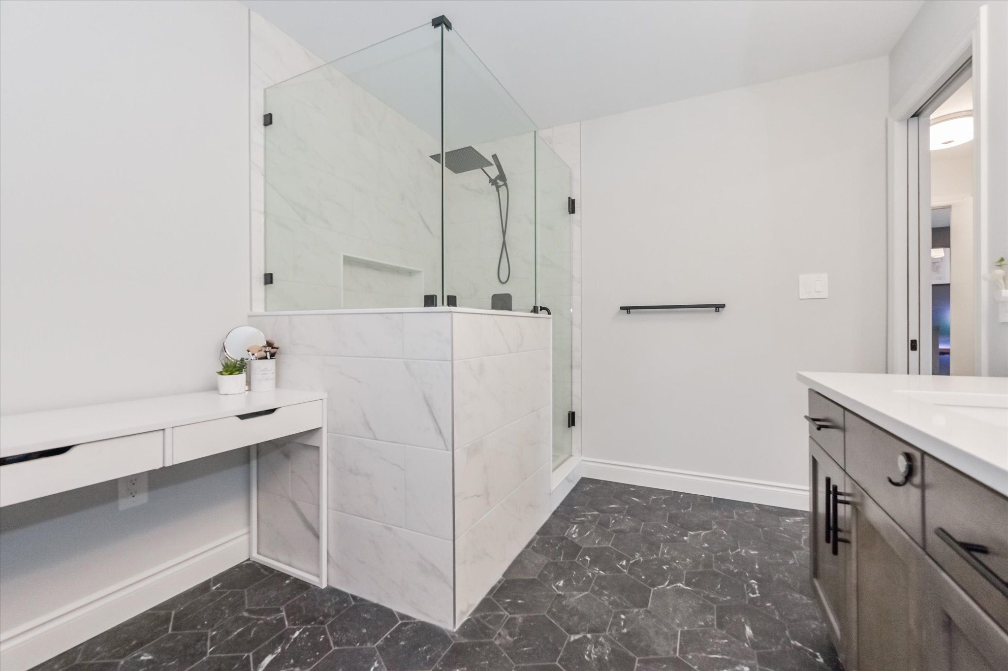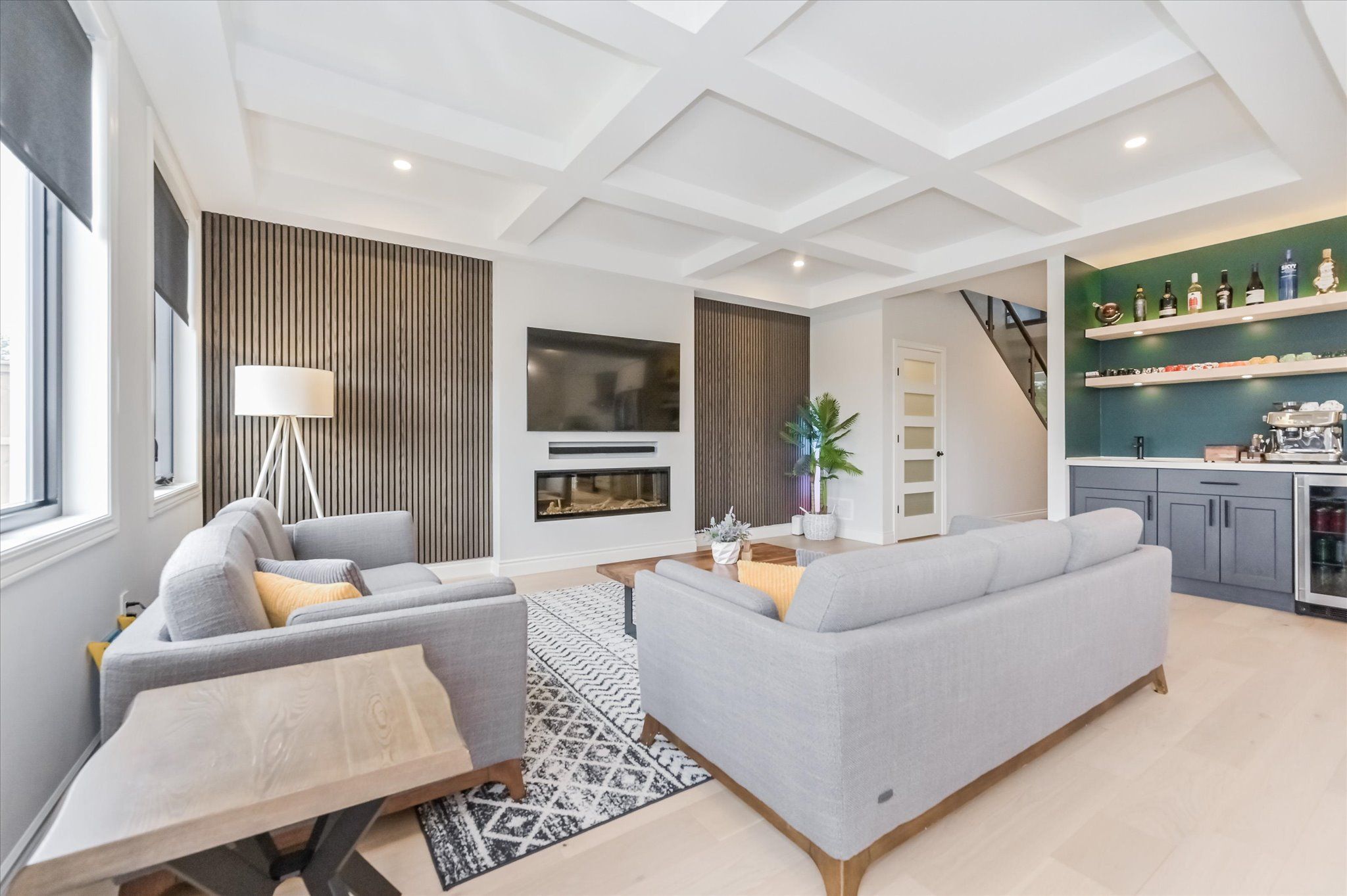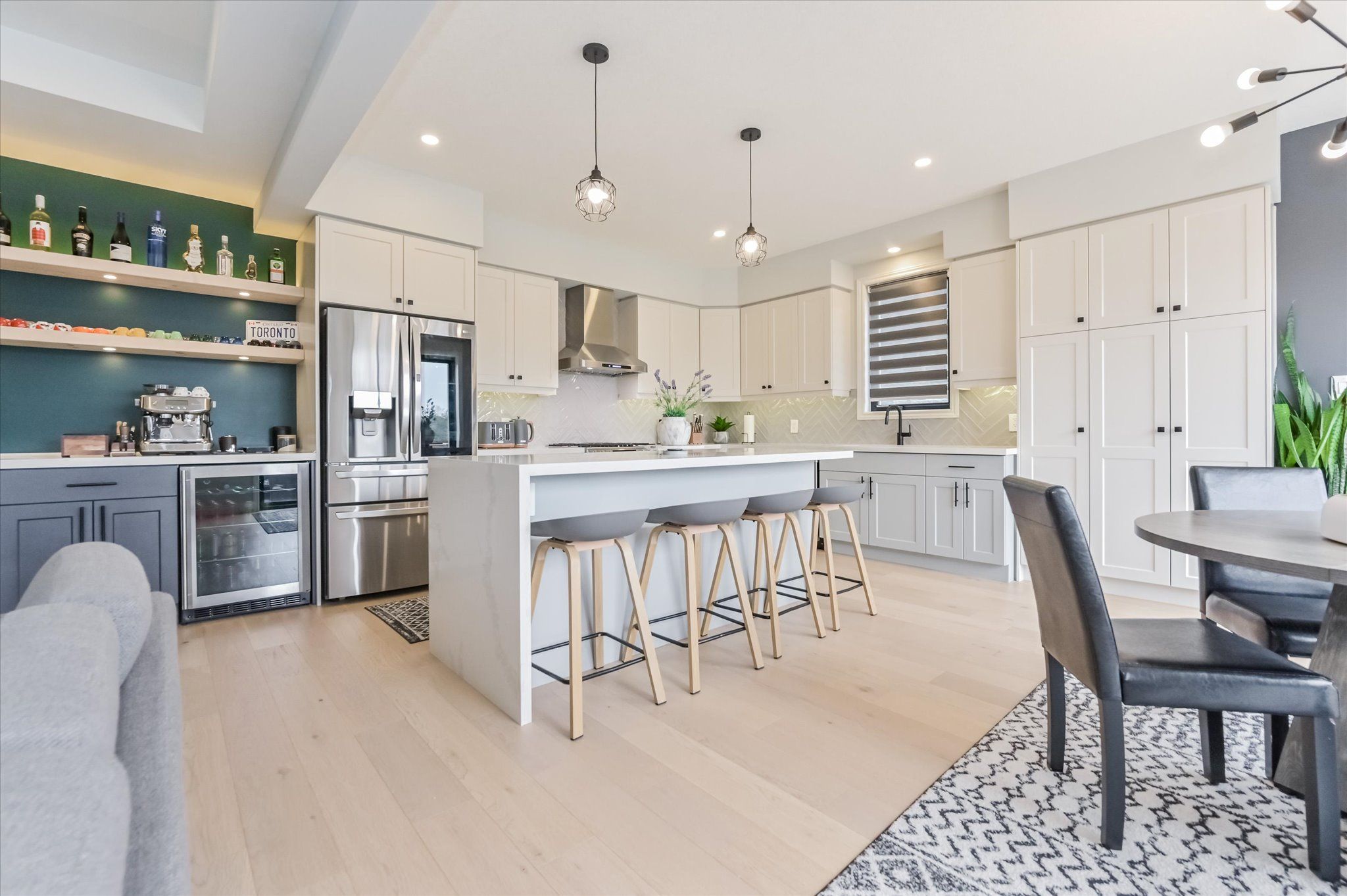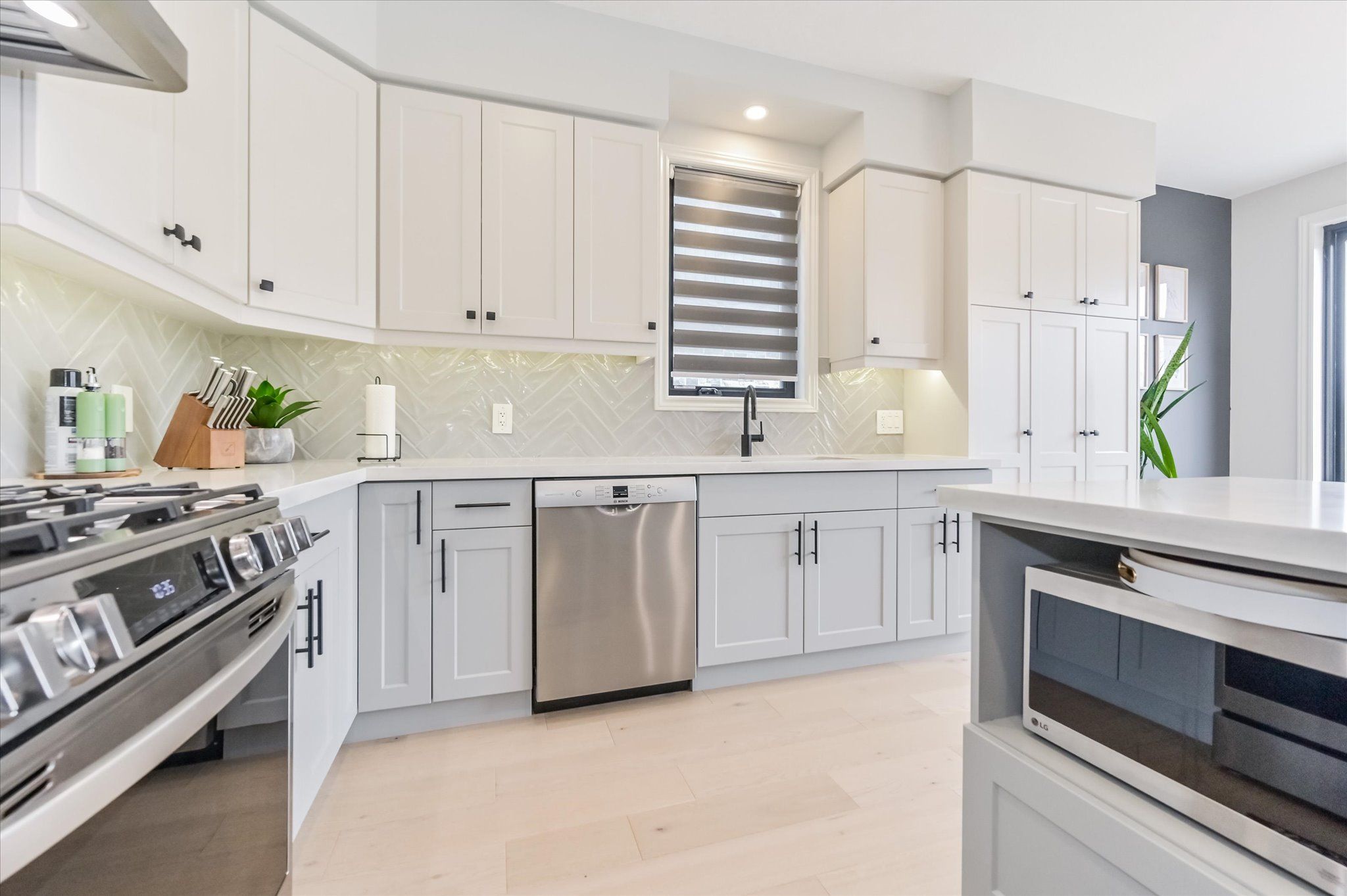 • Modern kitchen features quartz countertops, gas stove, and custom coffee bar.