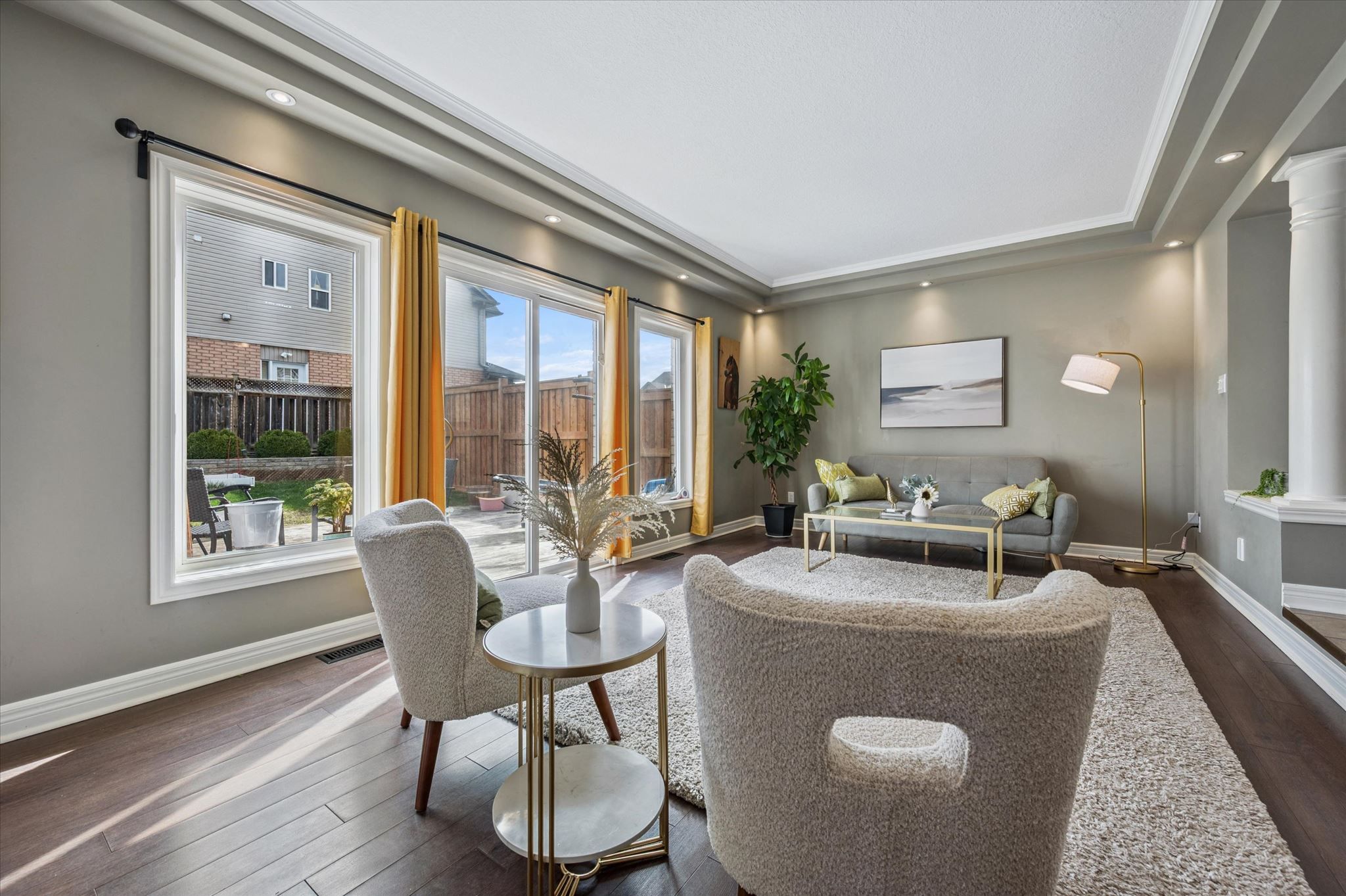• Bright living room with large windows and sliding door to backyard deck.
