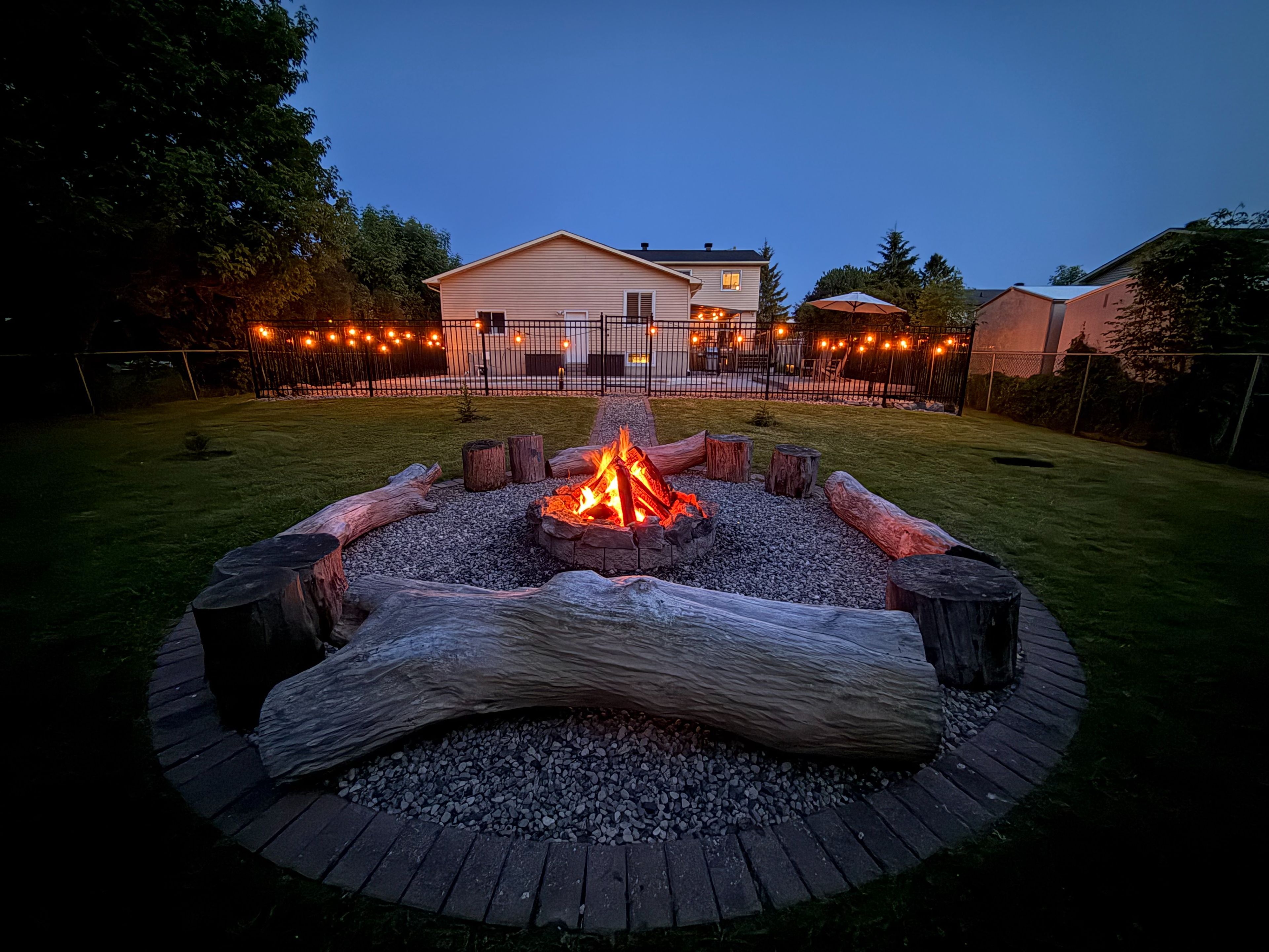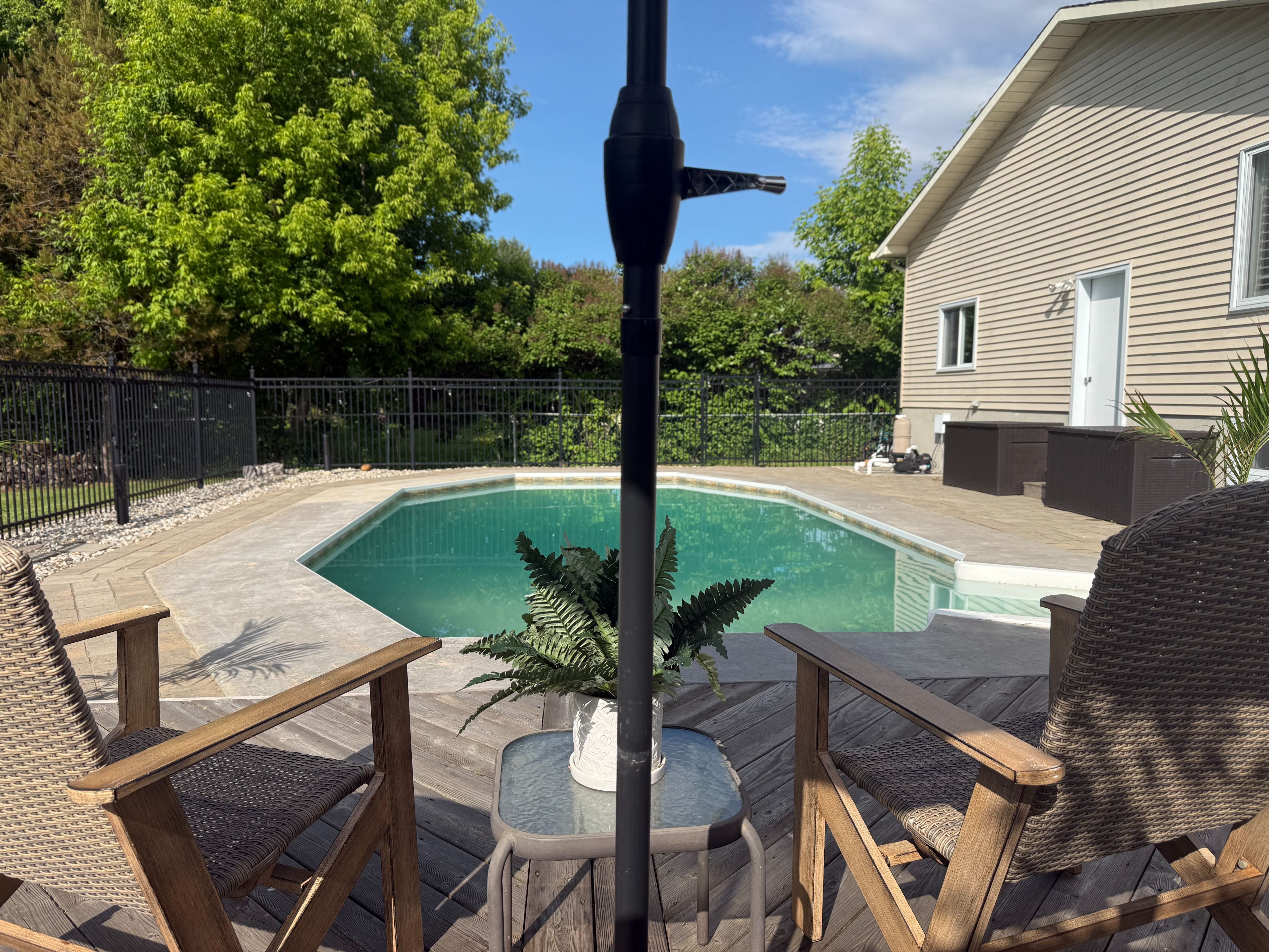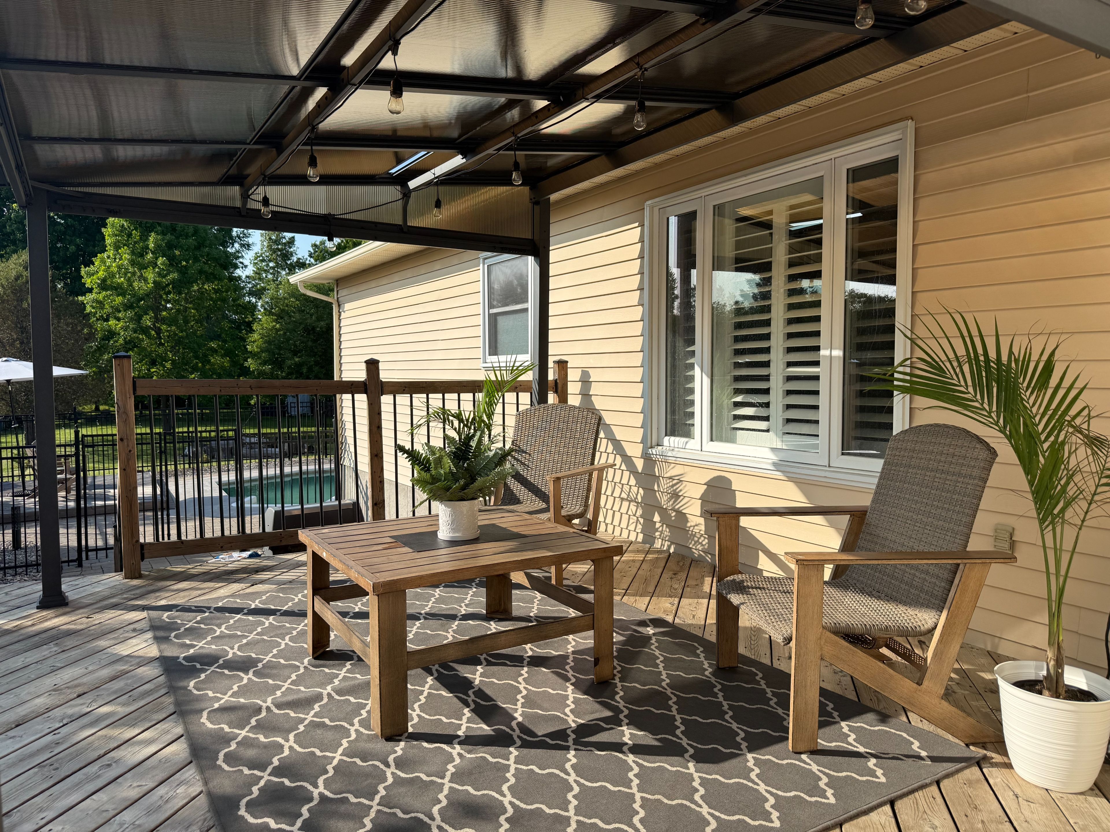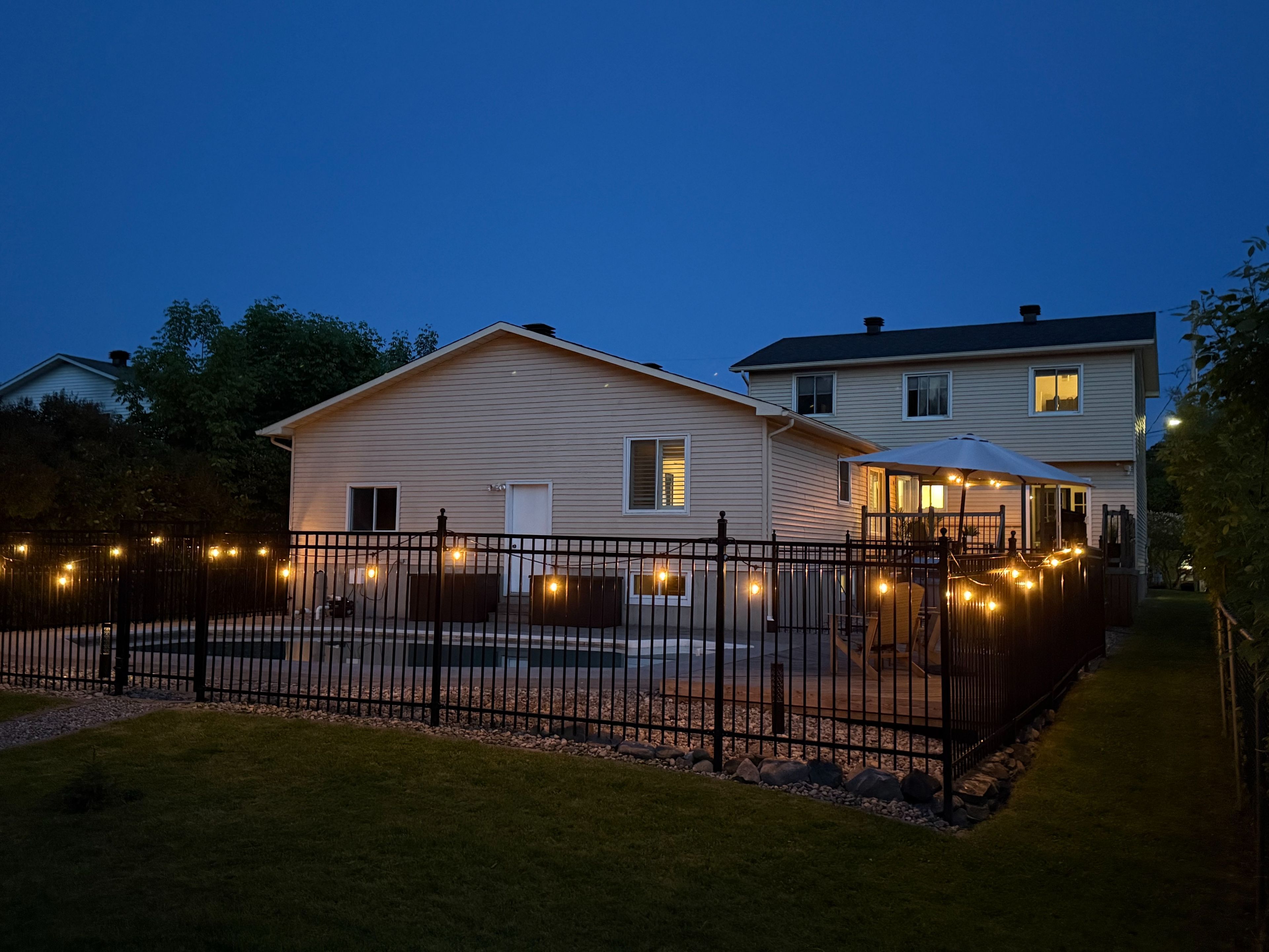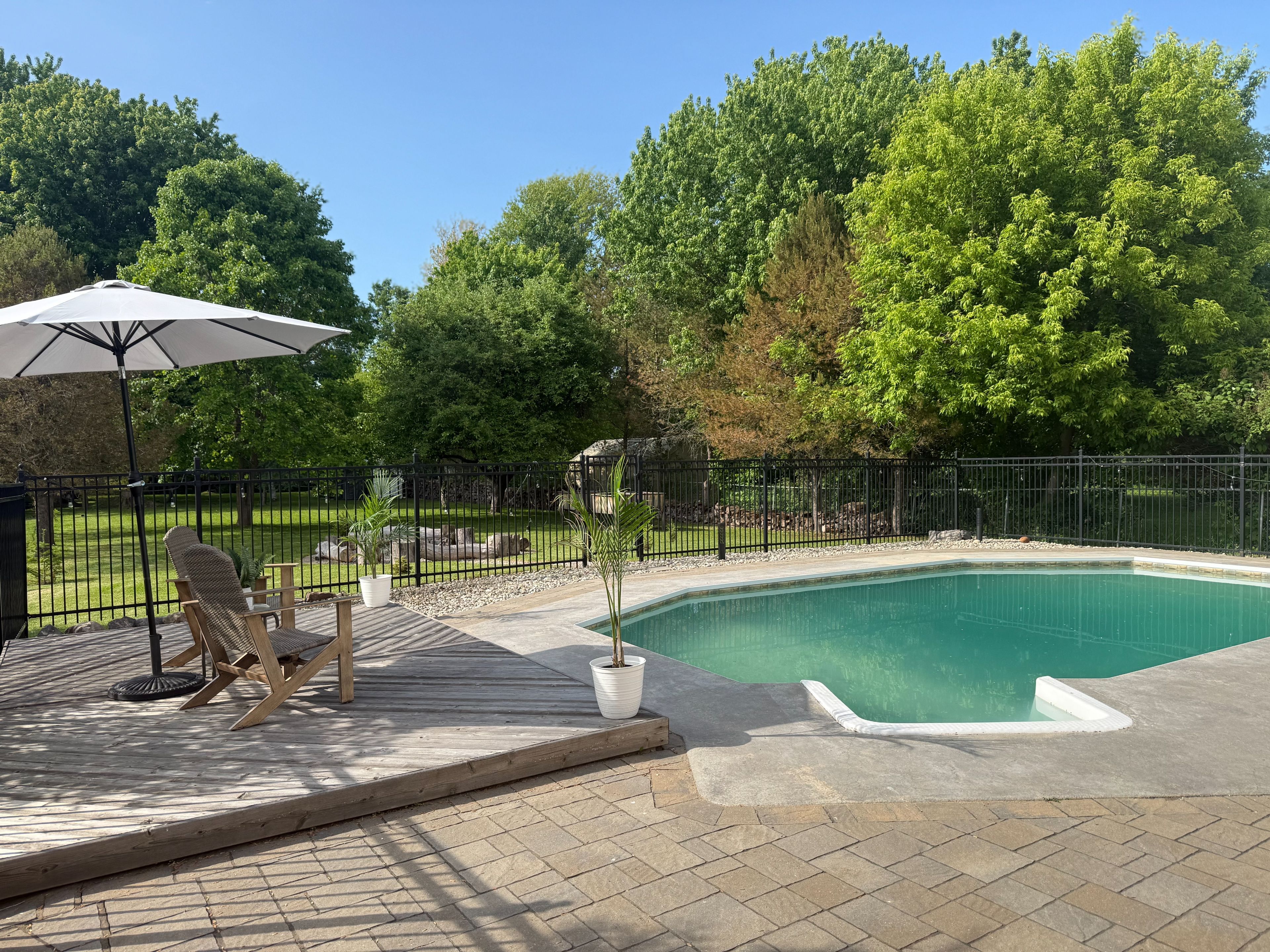 • Large backyard oasis with an in-ground pool and mature trees.