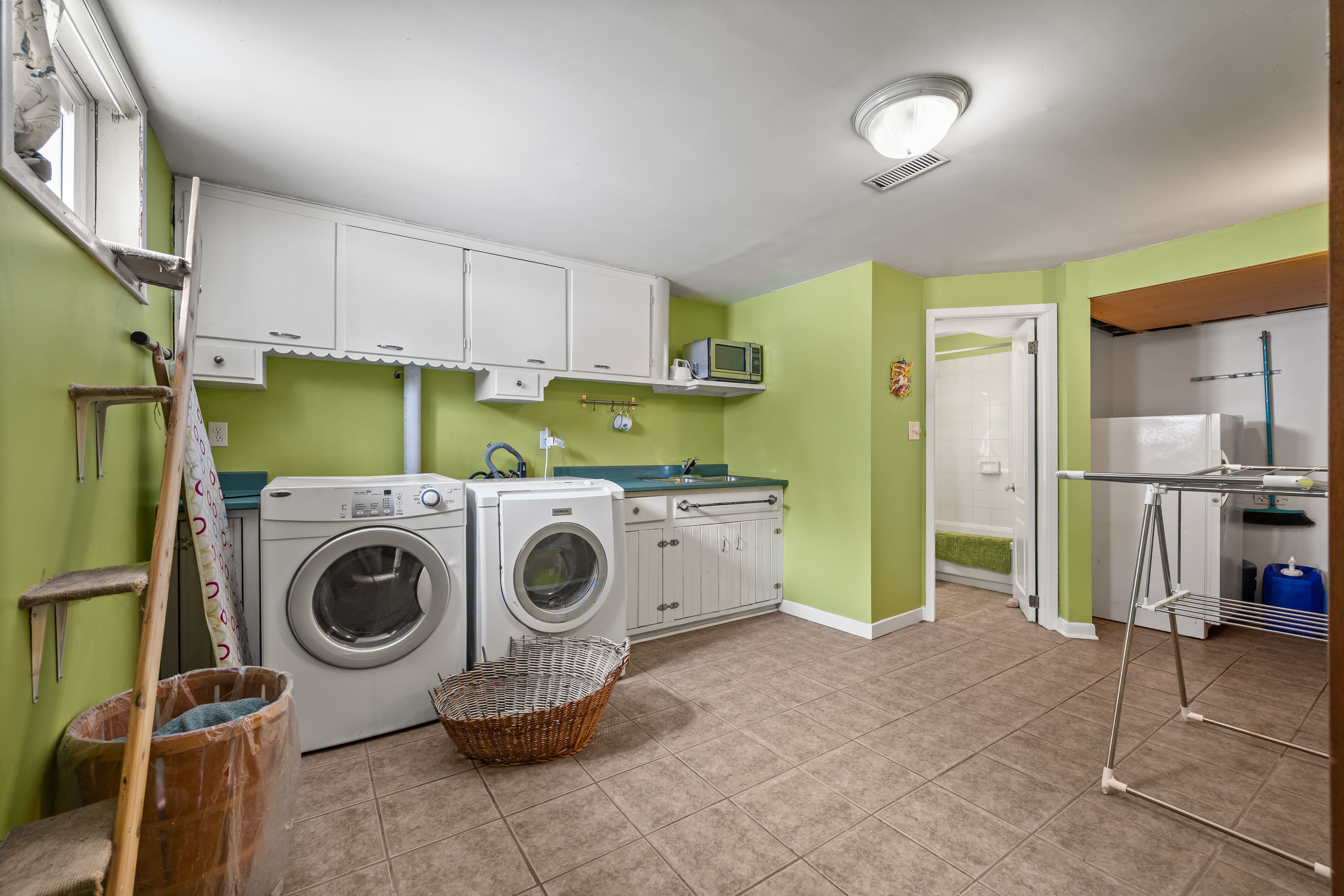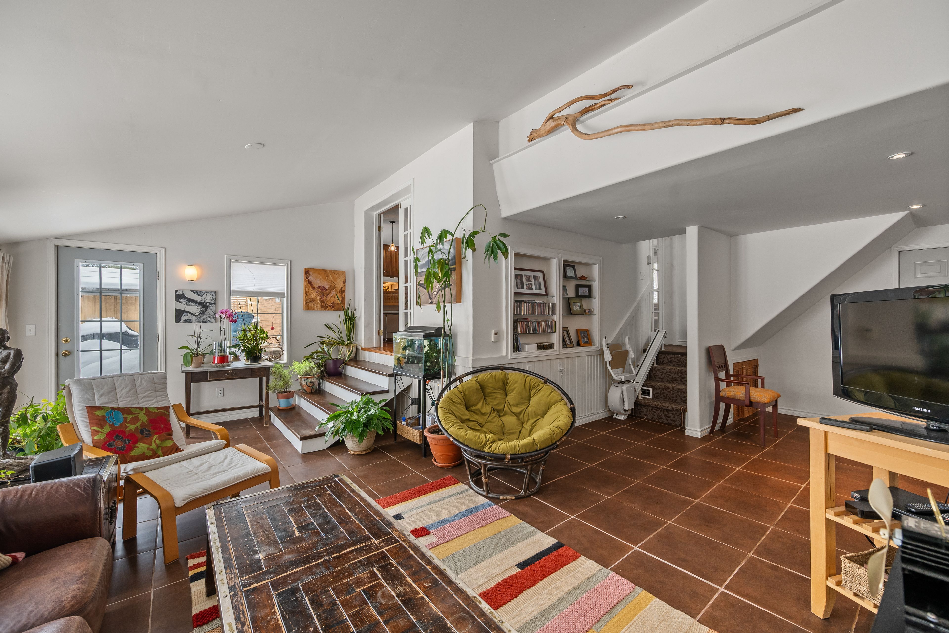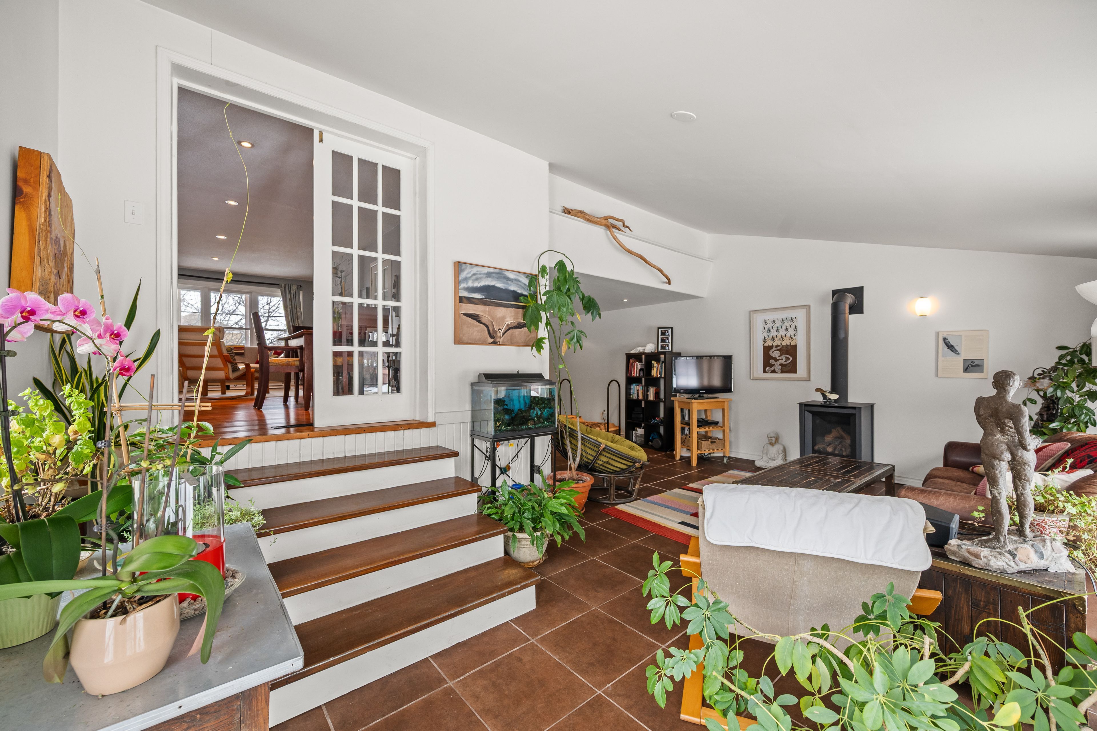 • Sunroom with heated floors offers year-round relaxation overlooking the backyard.