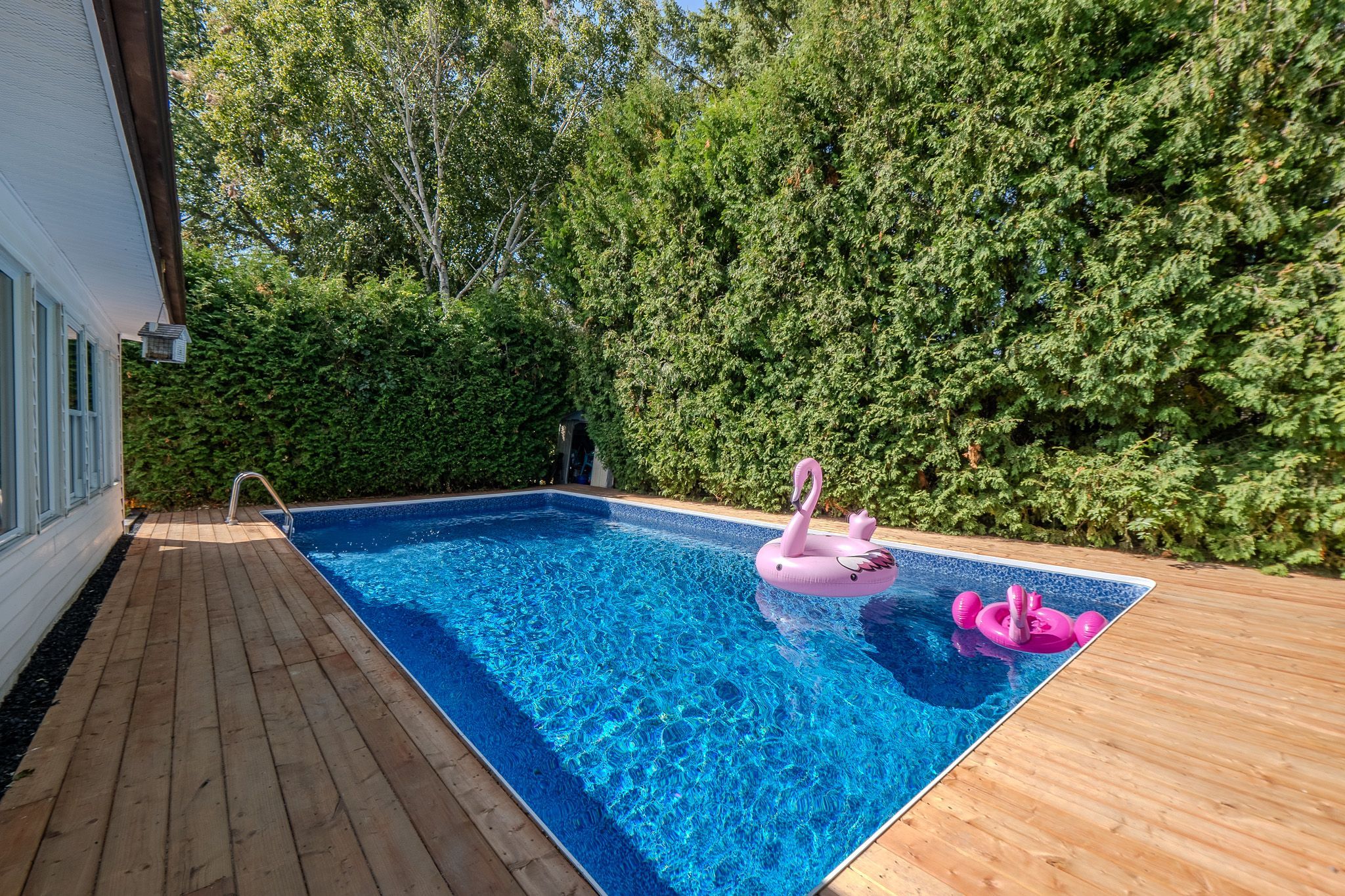 • Private backyard oasis featuring a large in-ground pool.