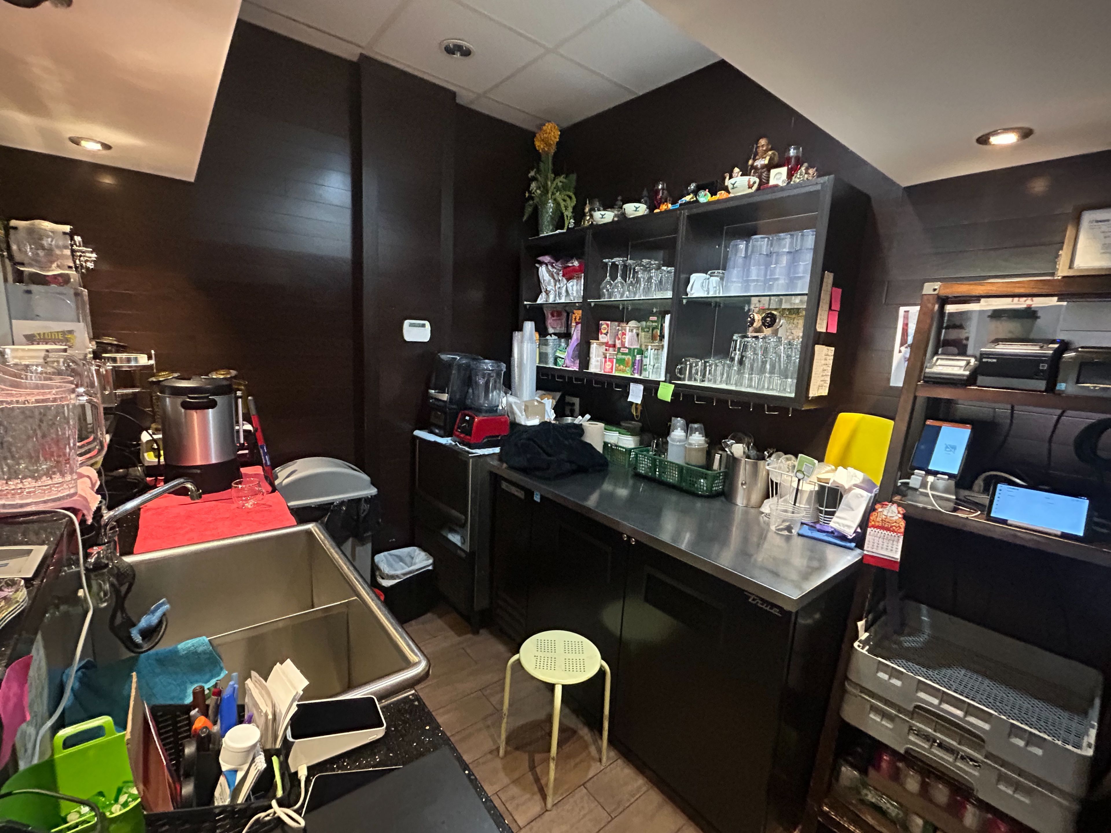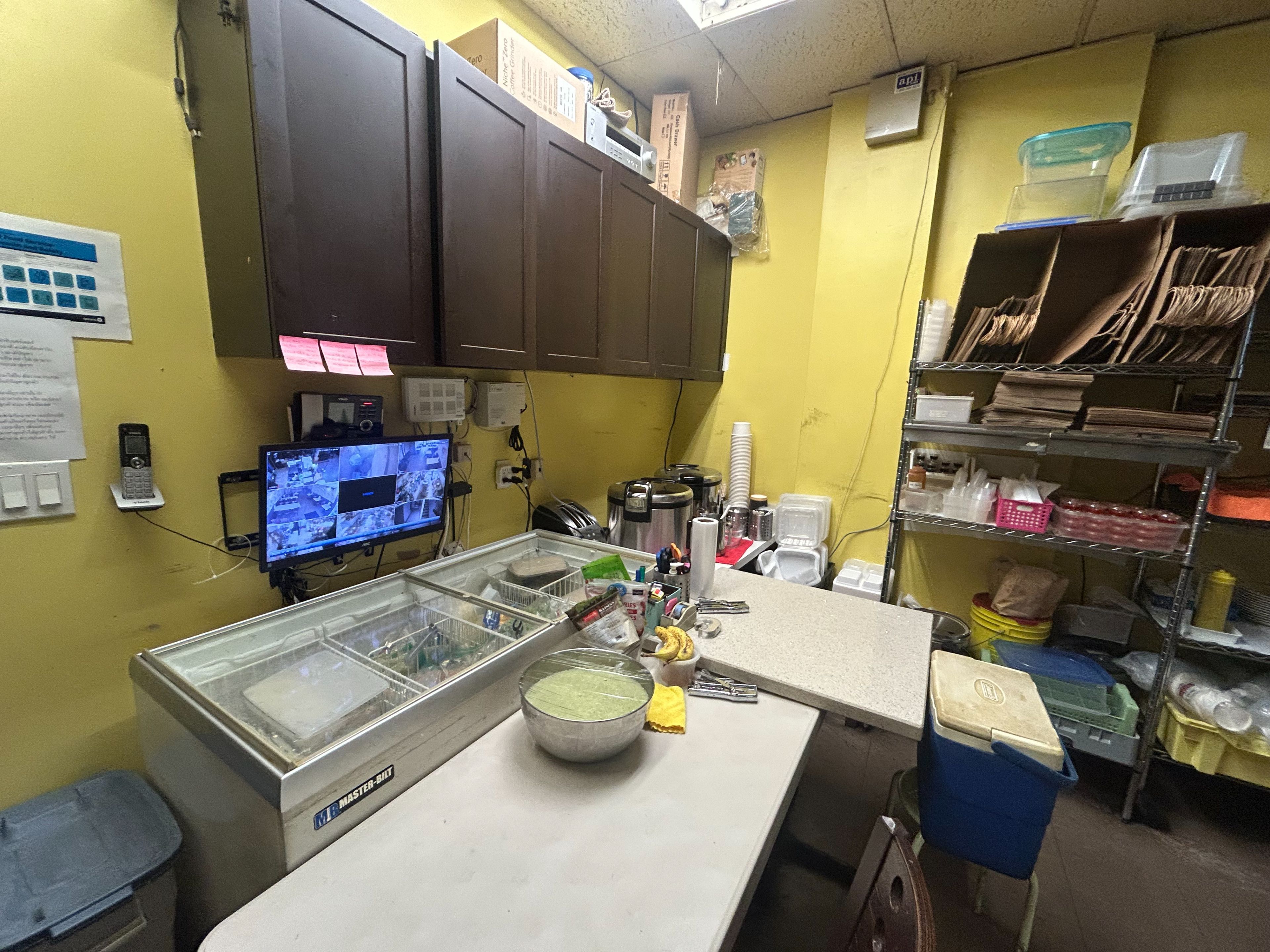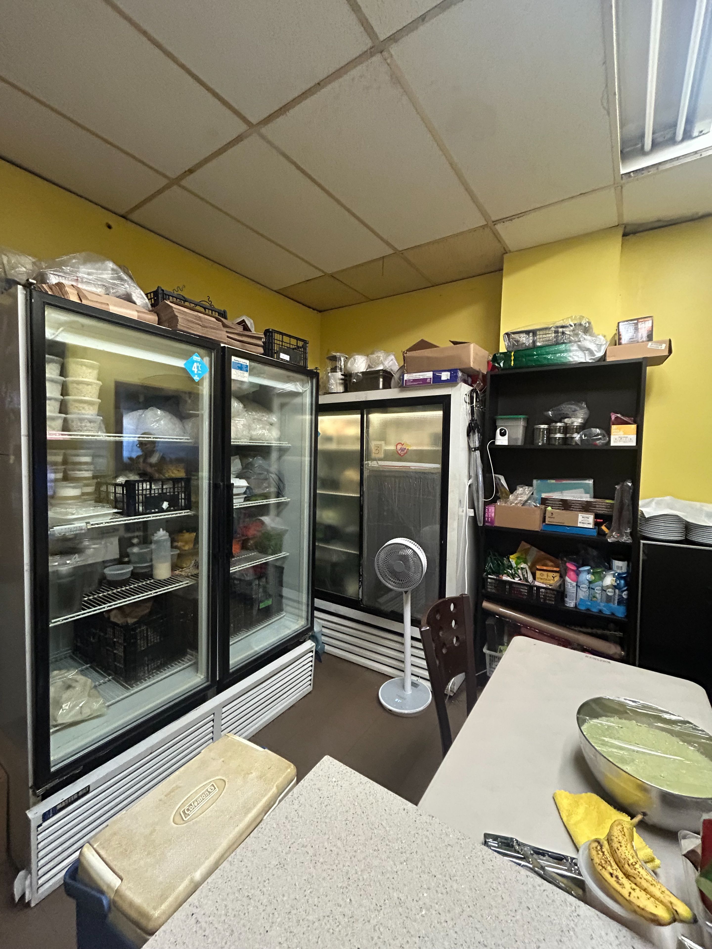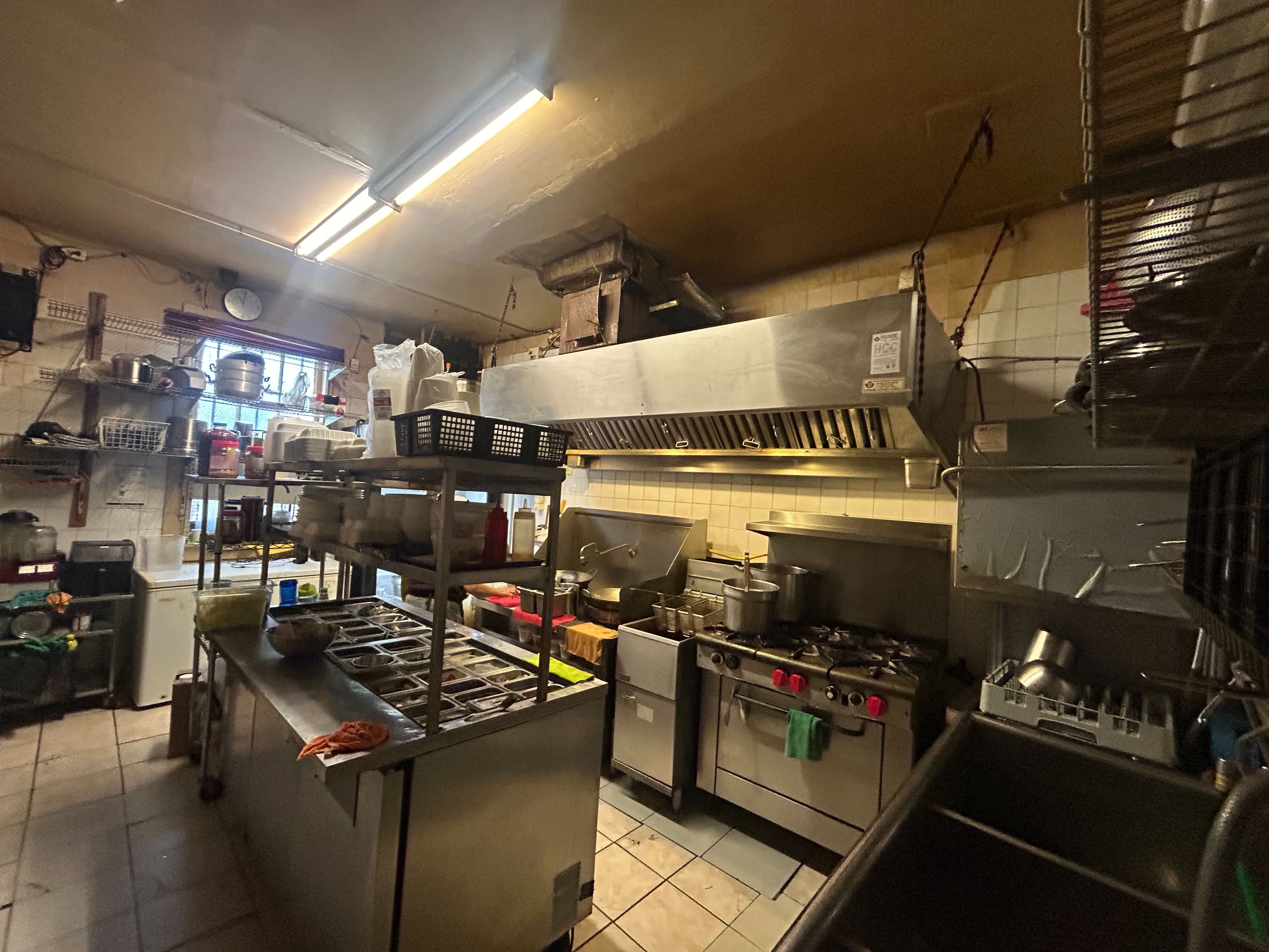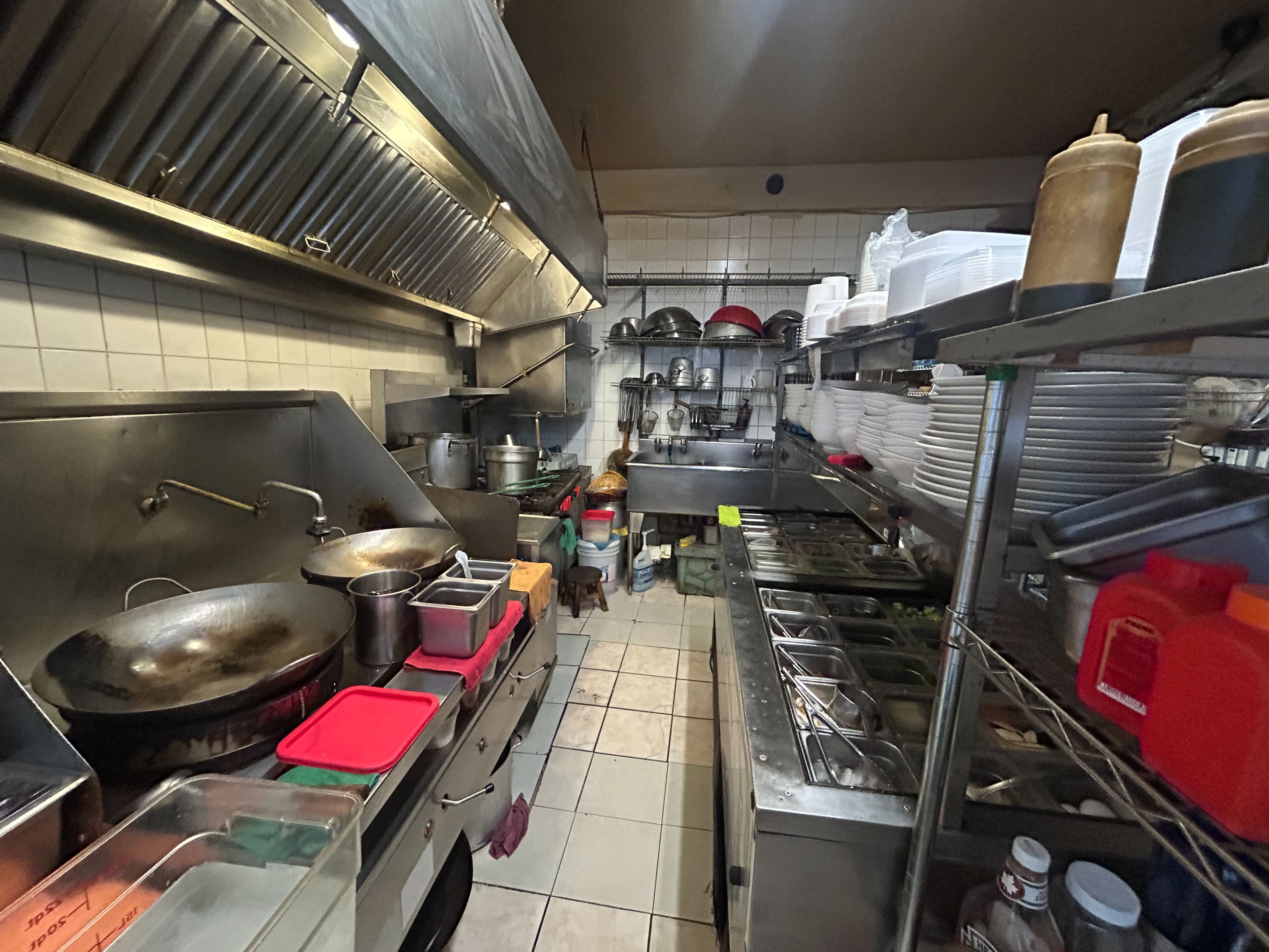 • Large kitchen featuring a 9-foot exhaust hood and fire suppression.
