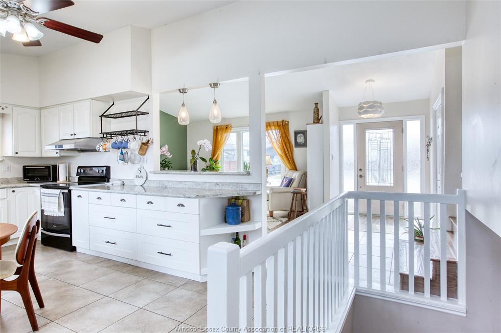• Well-maintained four-level home with modern kitchen and backyard view.
