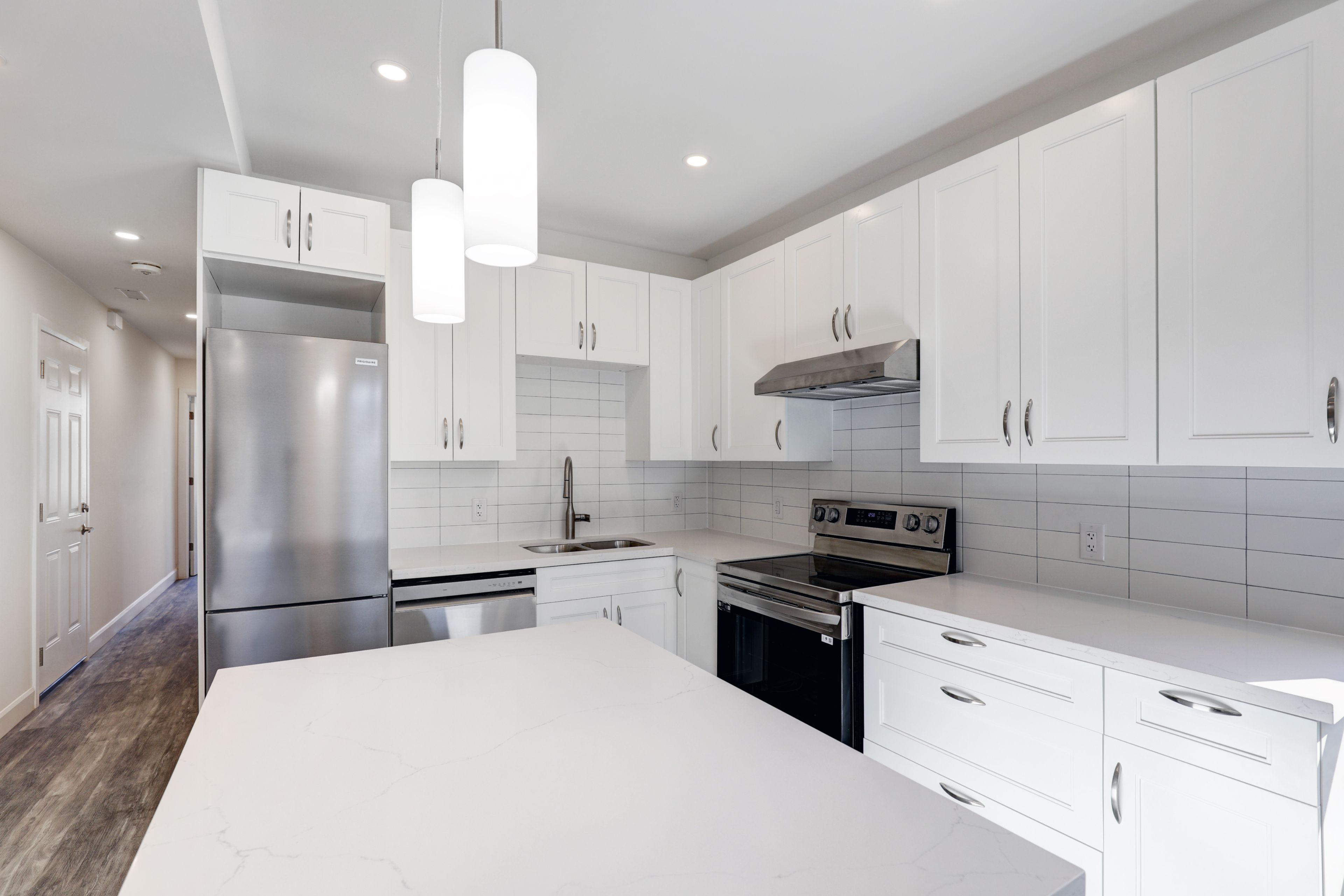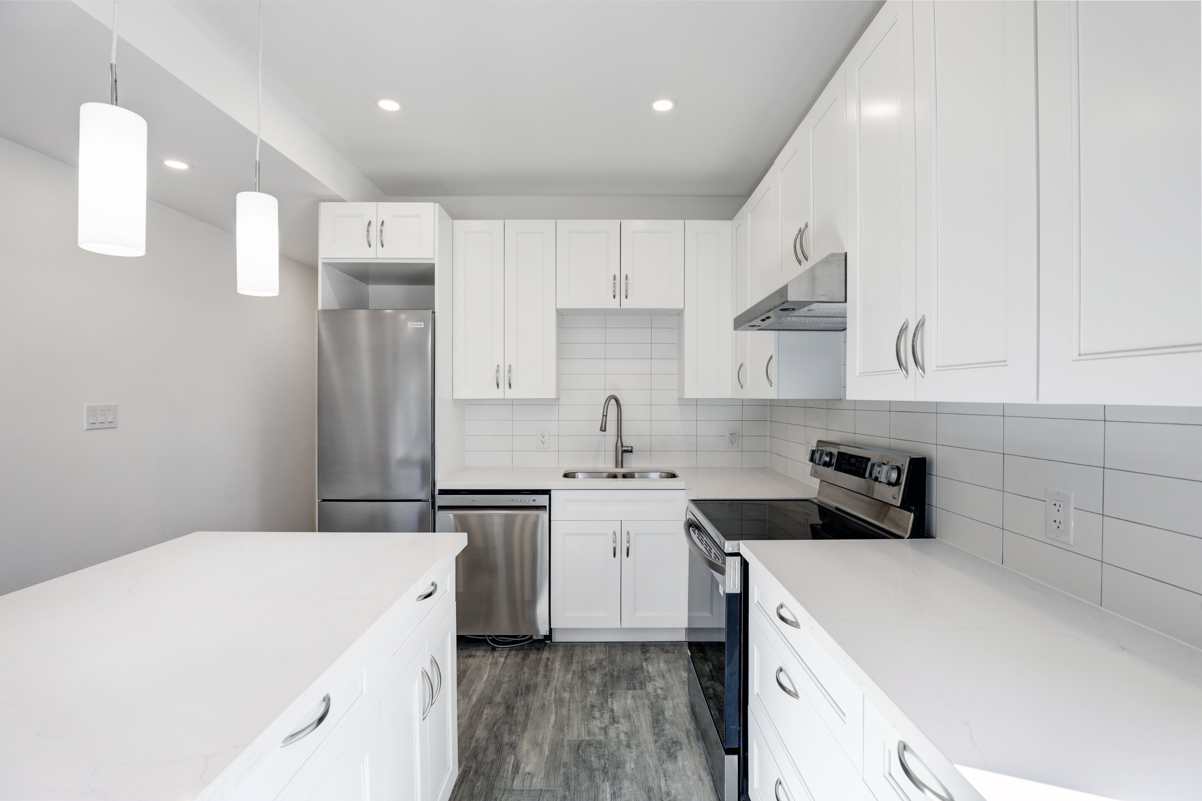 • Modern kitchen with stainless steel appliances and stone countertops.