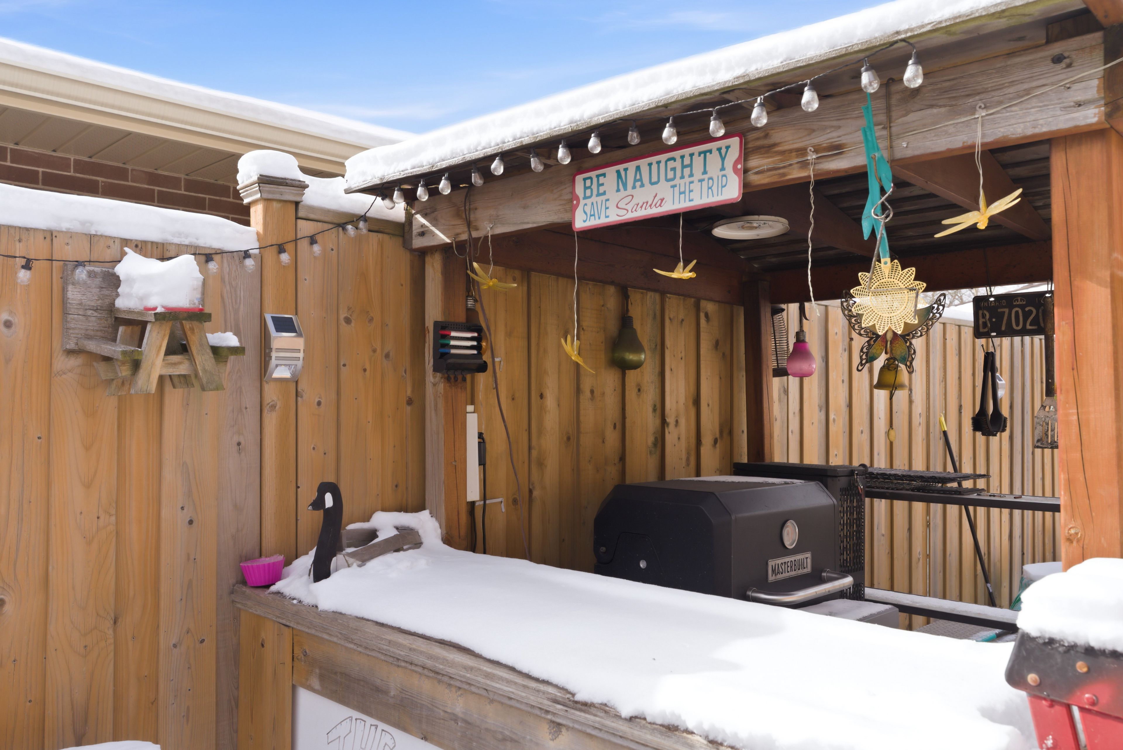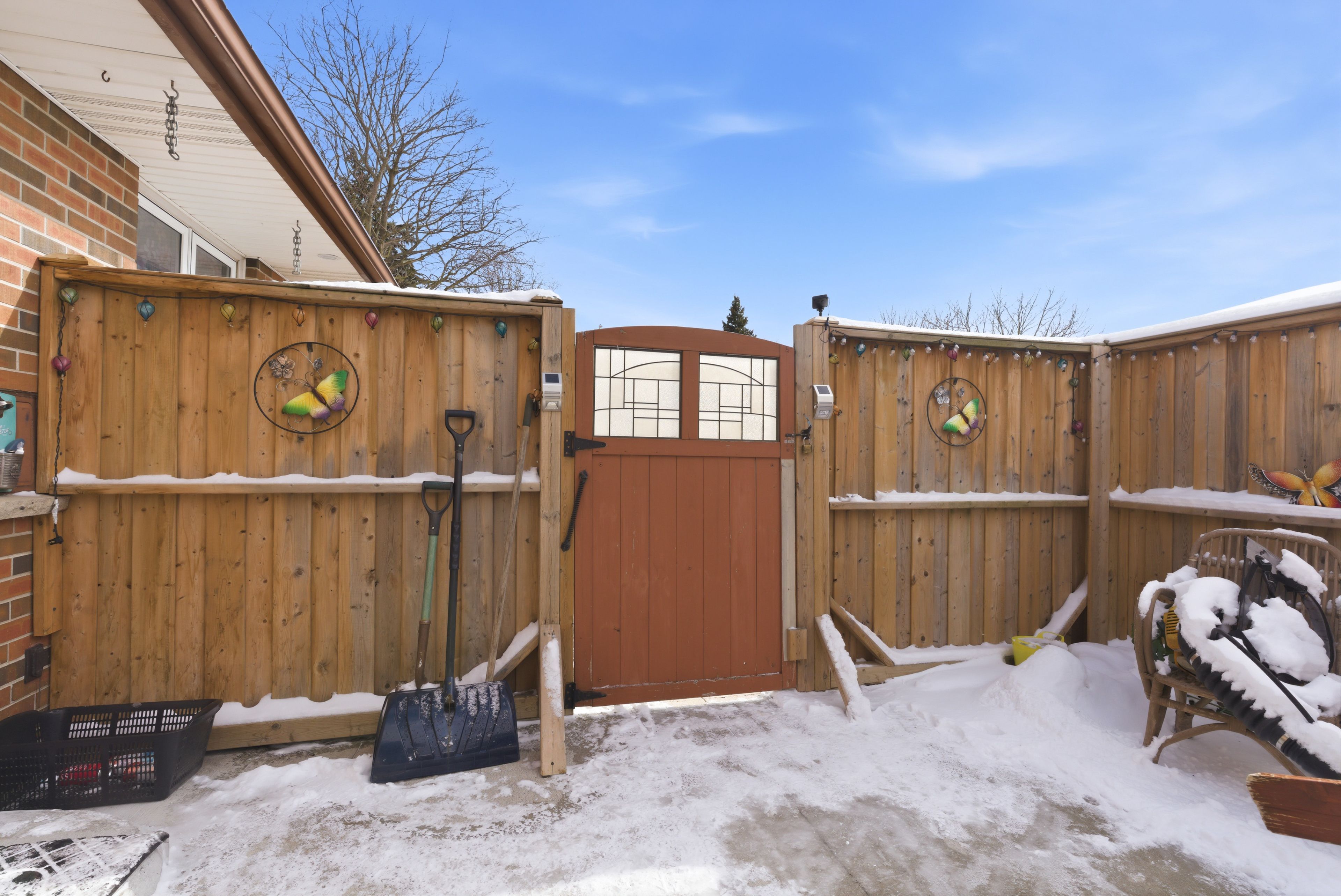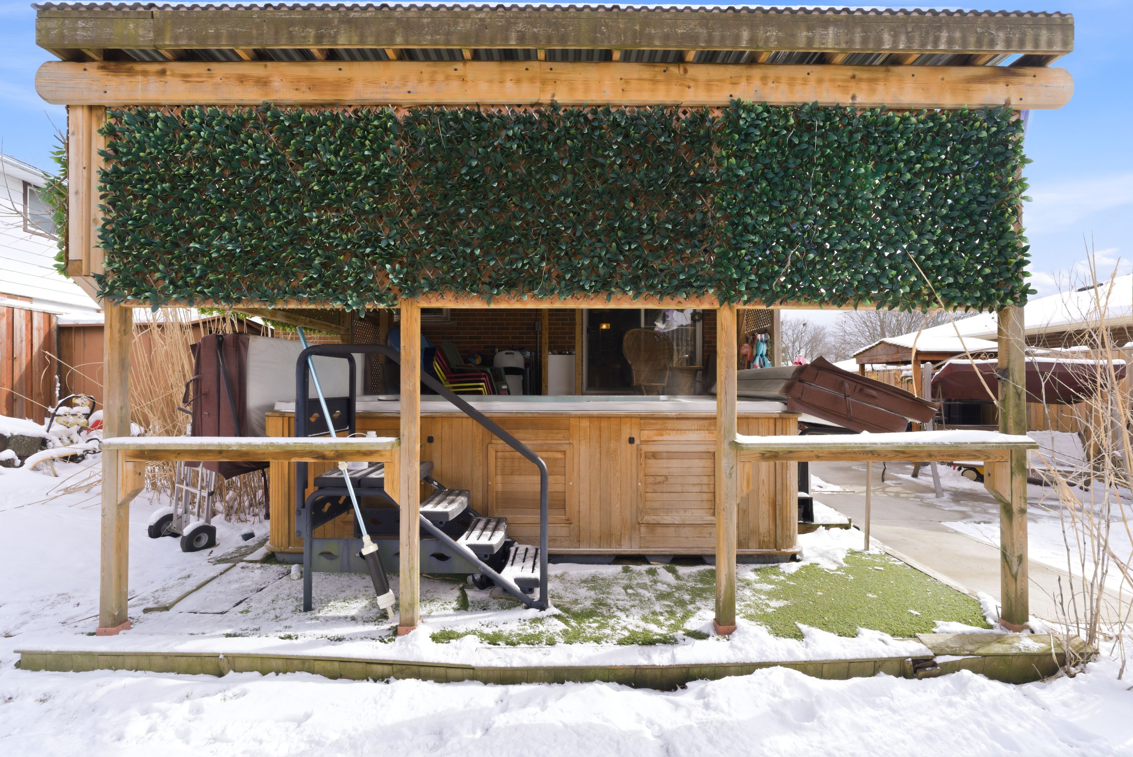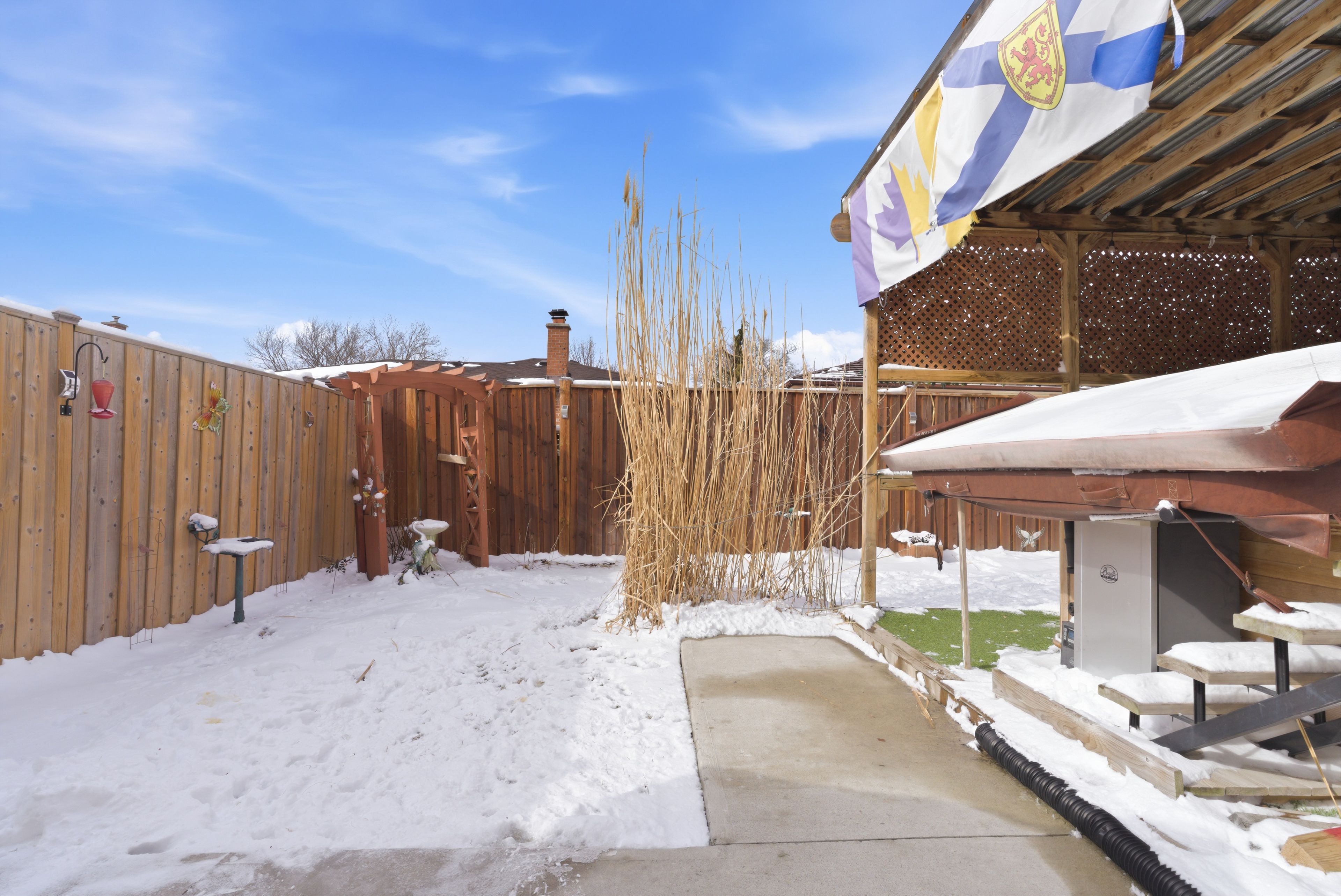 • Fully fenced yard with a swim spa and garden shed.