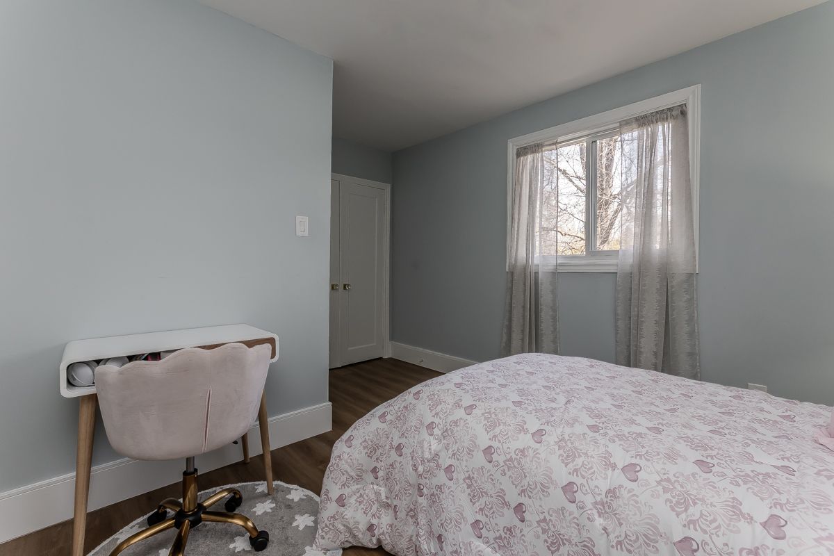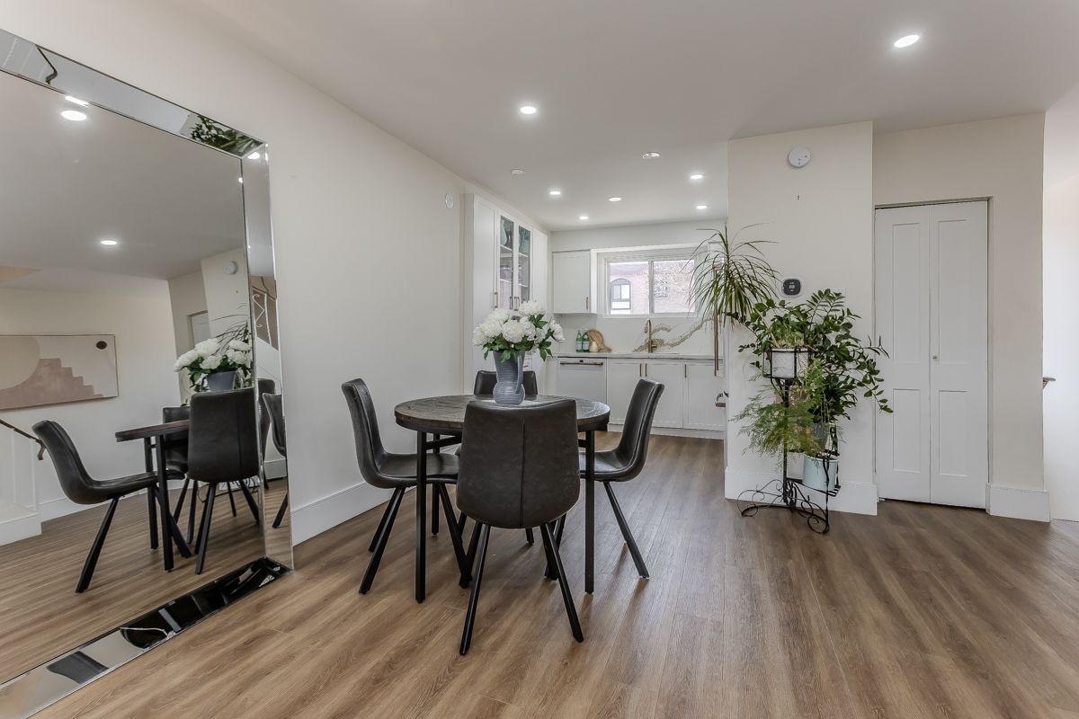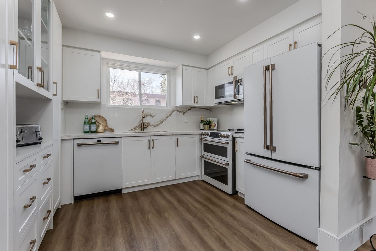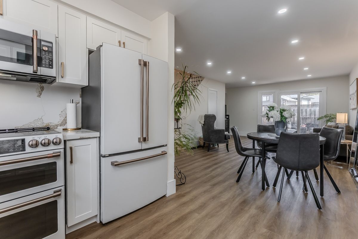 Welcome to this beautifully updated townhome offering the perfect blend of comfort, style, and location-ideal for new families seeking a vibrant lifestyle. Set in a highly desirable, family-friendly neighbourhood, you're just a short walk to the lake, downtown, parks, and everyday amenities, with easy access to major highways for effortless commuting. From the moment you arrive, the home impresses with charming curb appeal, an inviting front walkway, and landscaped gardens with a retaining wall. With parking for up to three cars, convenience is built right in. Inside, the main level features a bright, open-concept layout with luxury vinyl flooring throughout, enhanced by newer interior doors, trim, and dimmable pot lights that create a warm and modern feel. The fully renovated kitchen is a standout, showcasing stylish finishes, quartz countertops and backsplash, custom cabinetry, and a built-in coffee bar with pot and pan drawers-perfect for both everyday living and entertaining. The dining area flows seamlessly into the spacious living room, complete with a walkout to the backyard. Step outside to your own private retreat. The fully fenced backyard offers mature trees for added privacy, a stamped concrete patio, and maintenance-free turf-perfect for relaxing, entertaining, or enjoying time with family. A convenient 2-piece powder room completes this level. Upstairs, hardwood continues throughout, leading to two generously sized bedrooms and a beautifully renovated 4-piece bathroom featuring contemporary large slab marble tile, a dual sink vanity, led mirror, and a walk-in glass shower with bench seating. A move-in ready home in an unbeatable lifestyle location-this is one you won't want to miss.