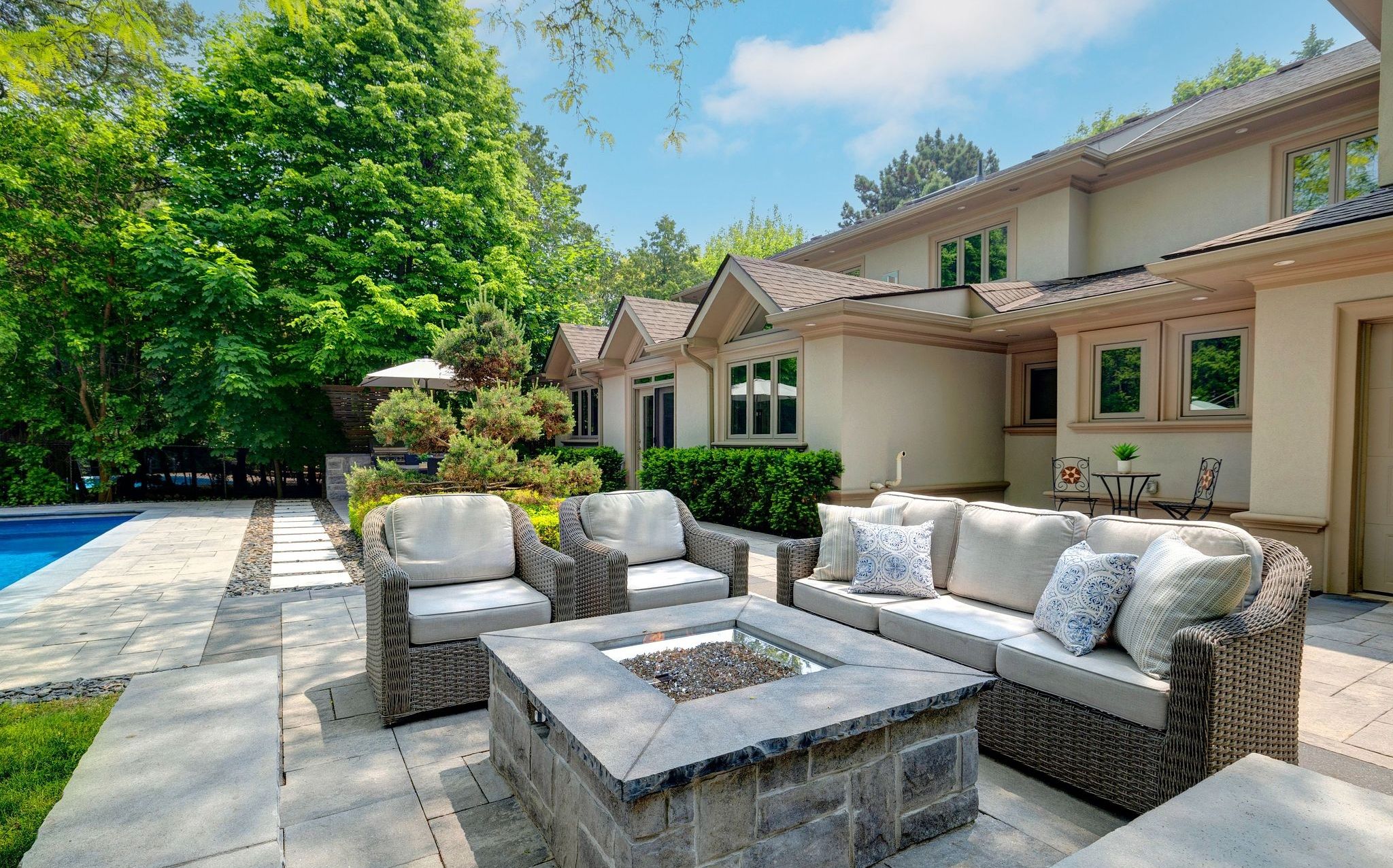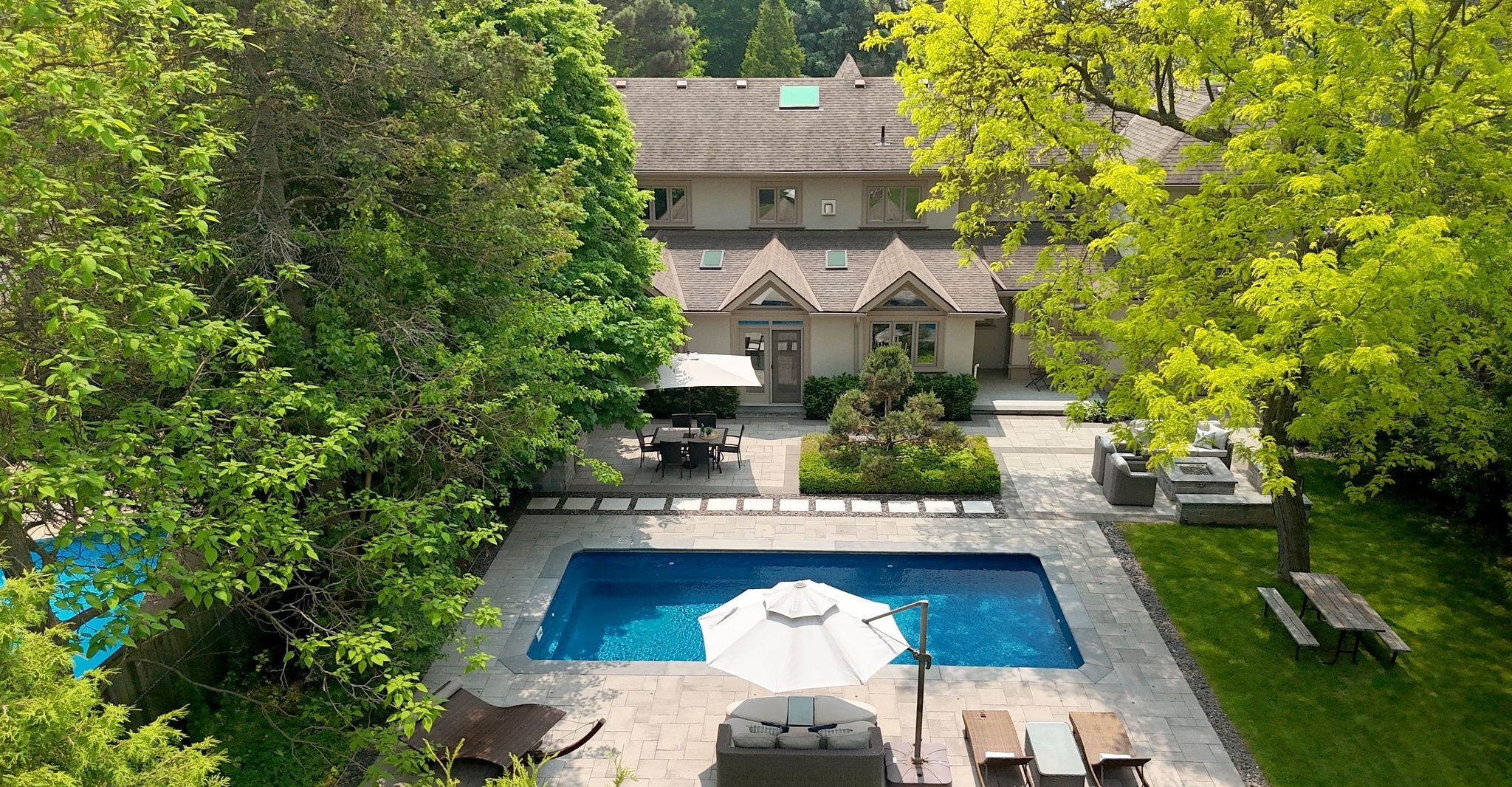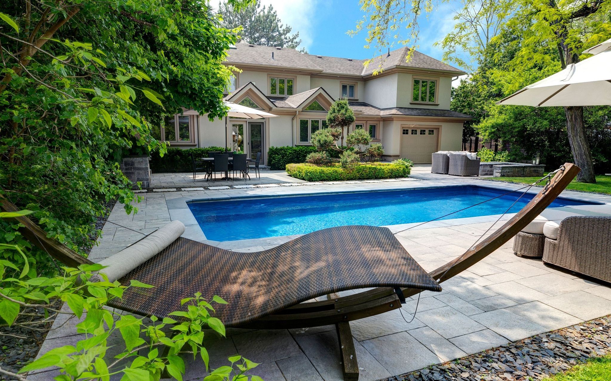 • Private backyard oasis with salt-water pool and multiple entertaining areas.