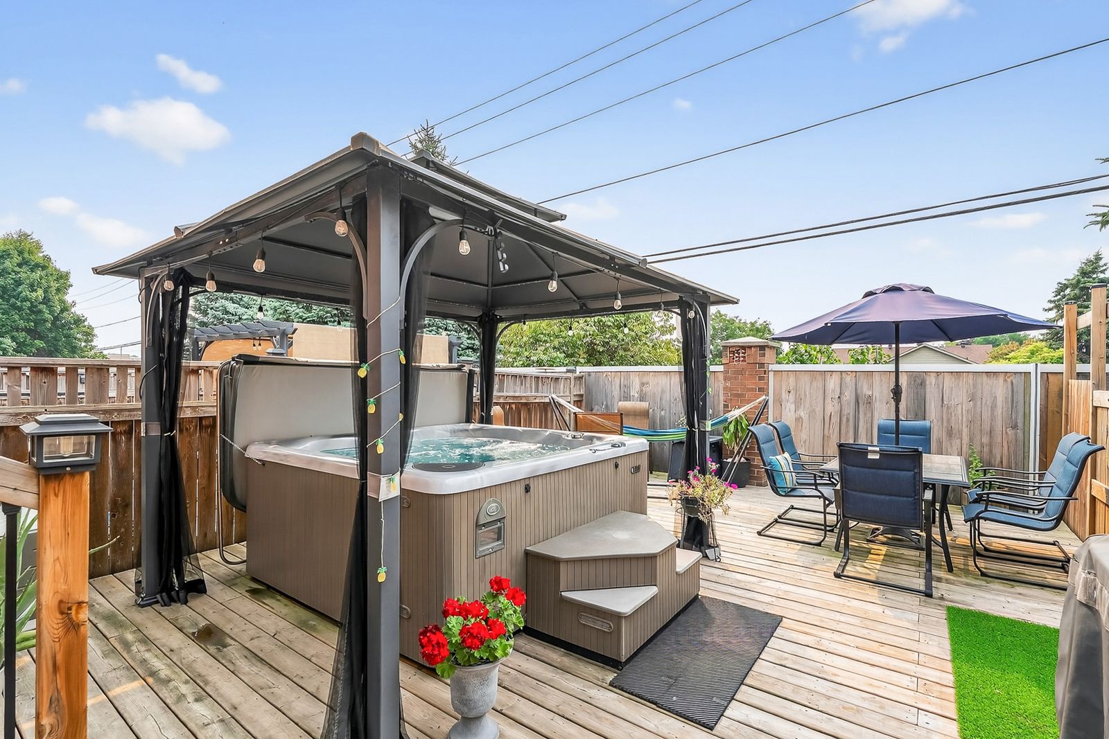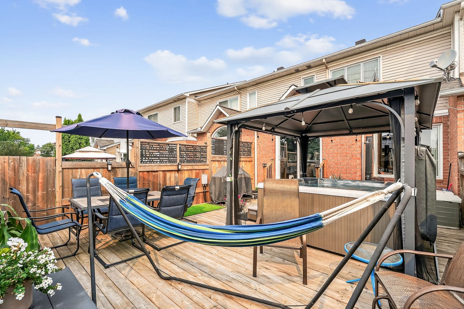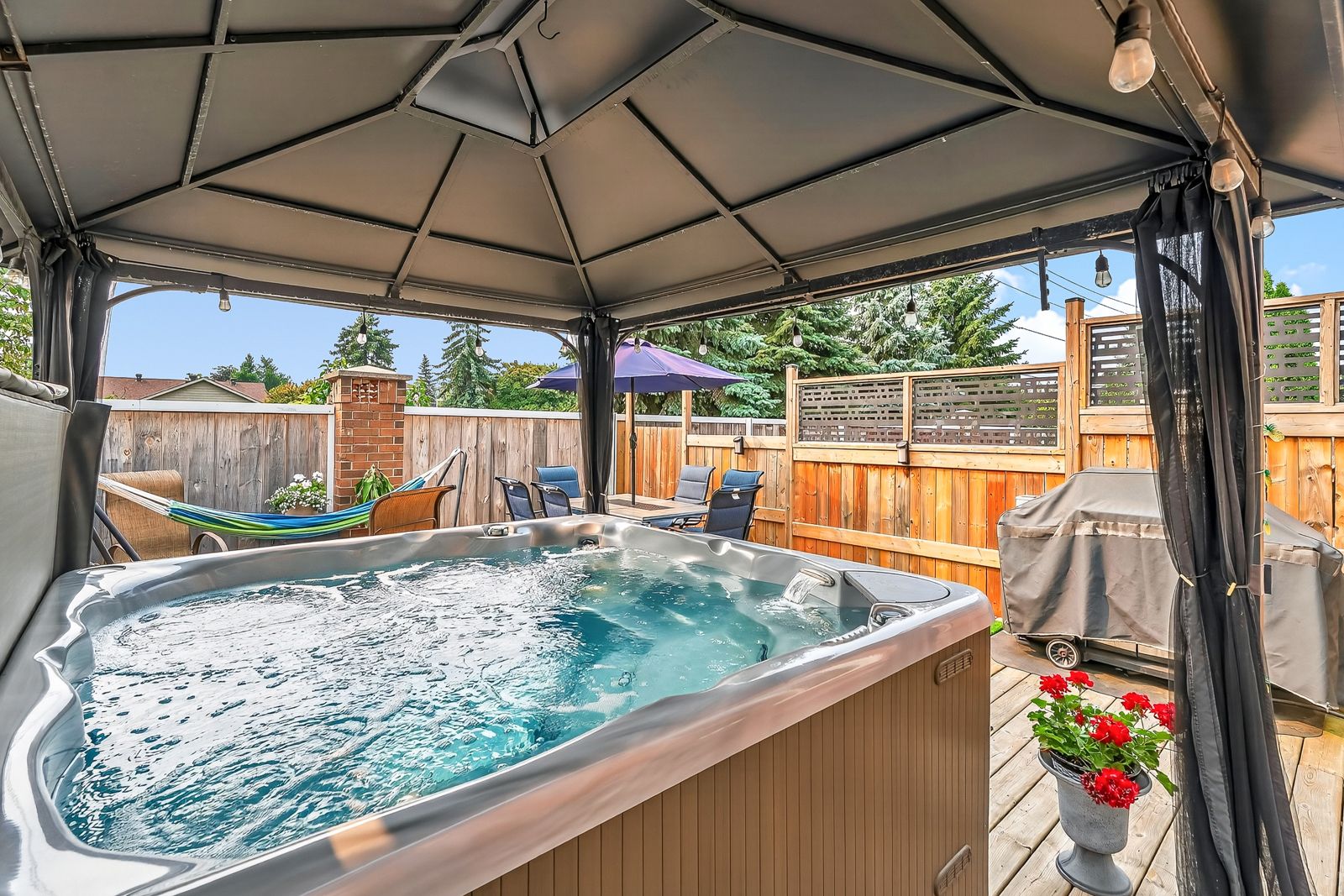 • Maintenance-free backyard with a hot tub, gazebo, and BBQ line.
