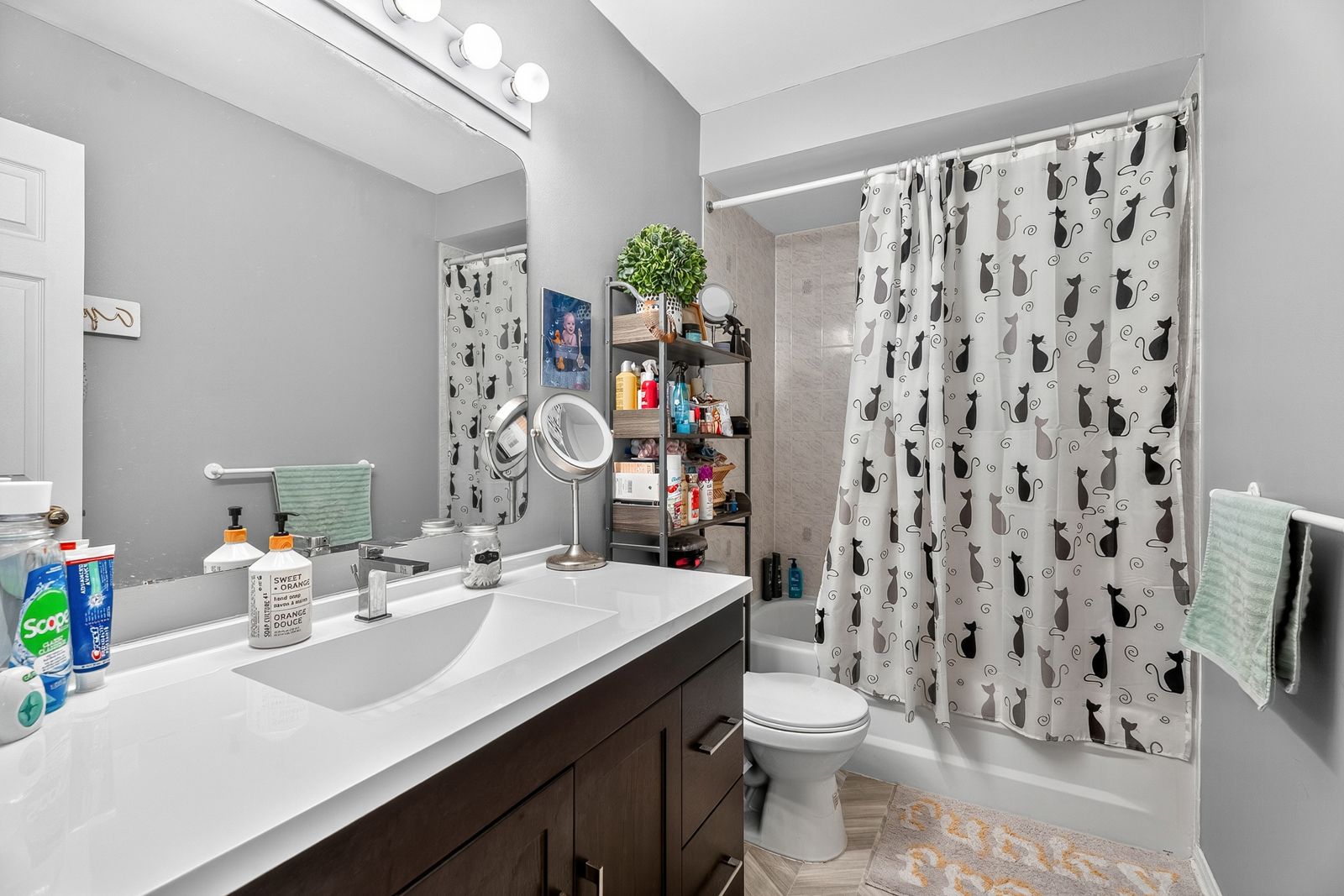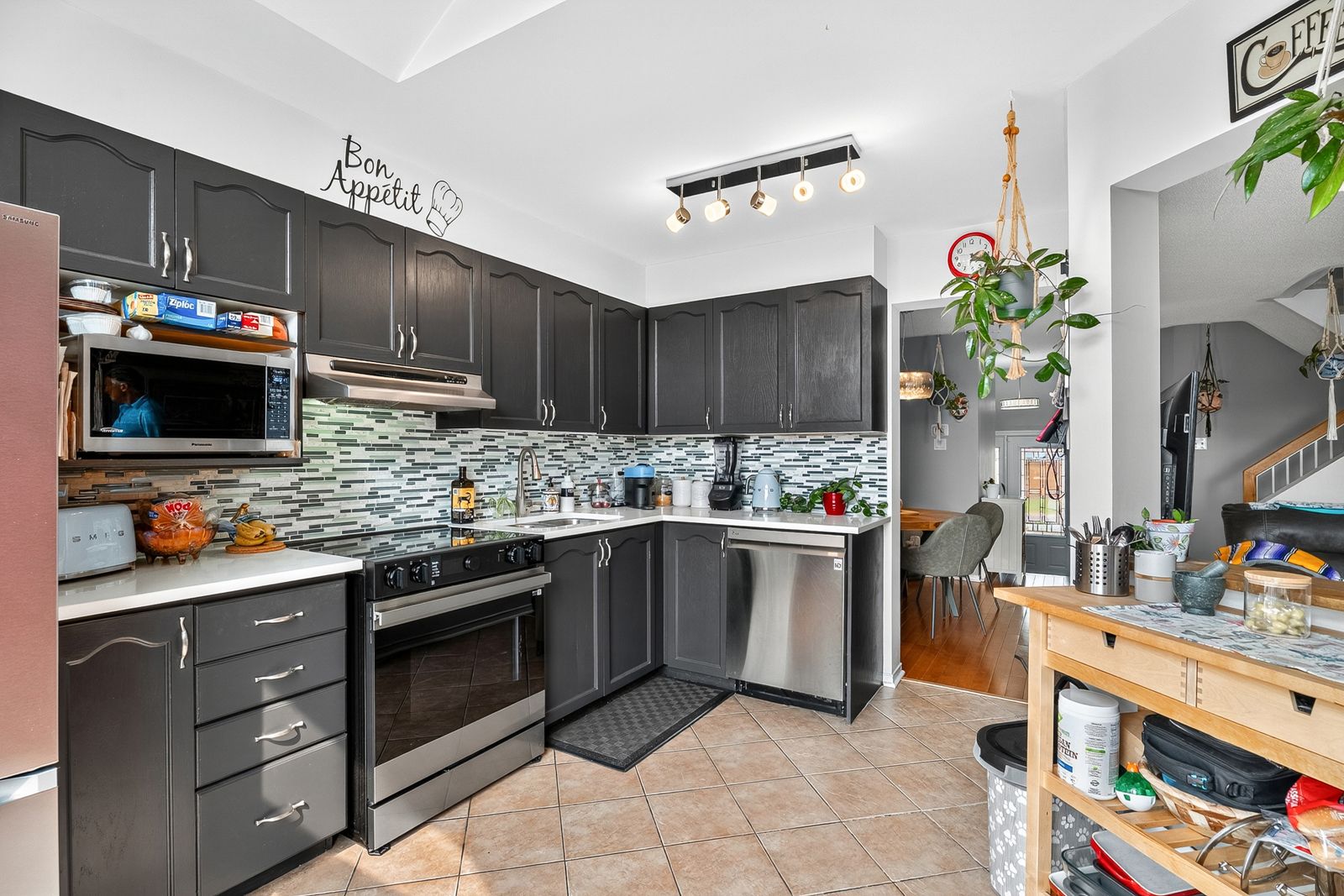 • Modern kitchen features quartz countertops and stainless steel appliances.