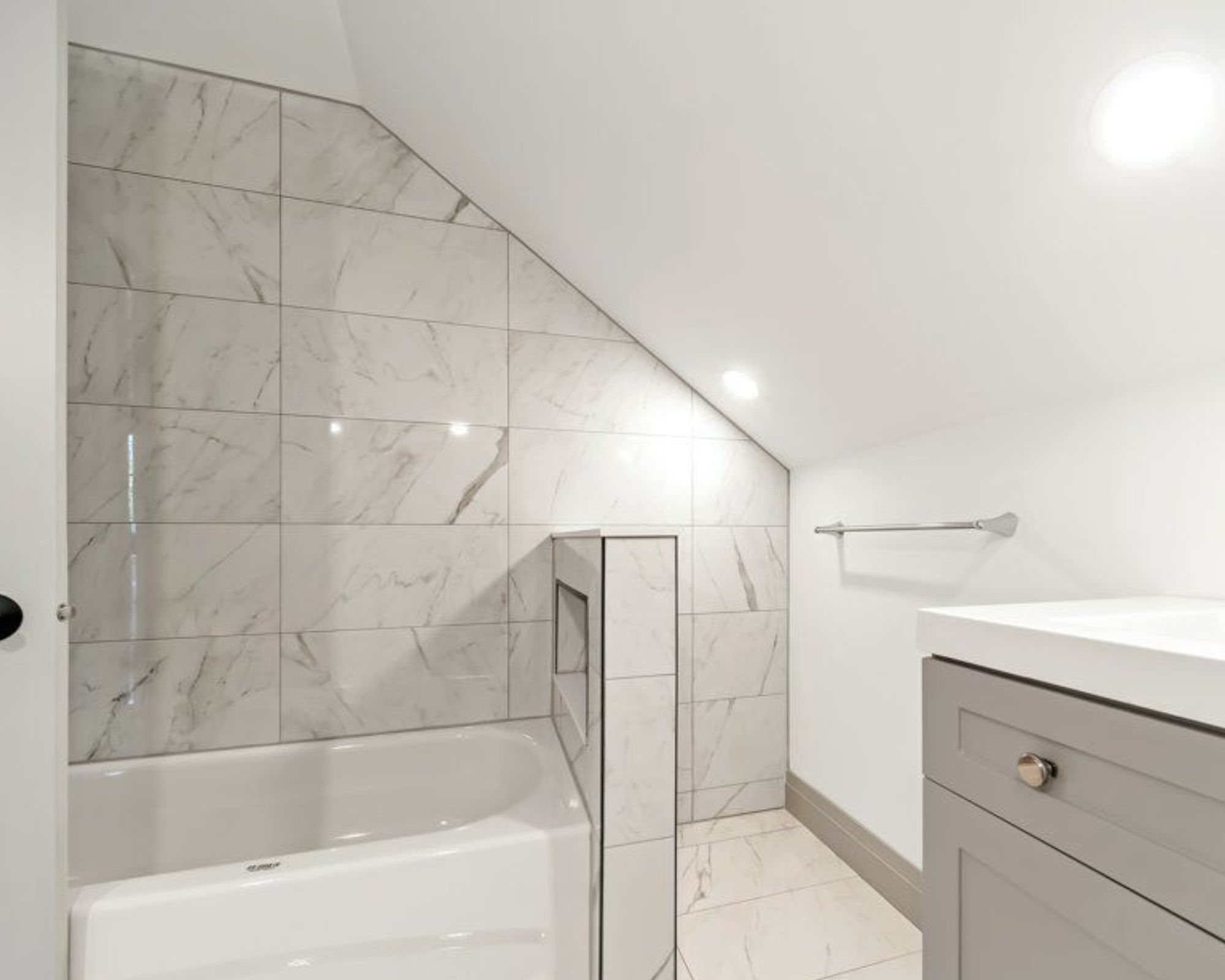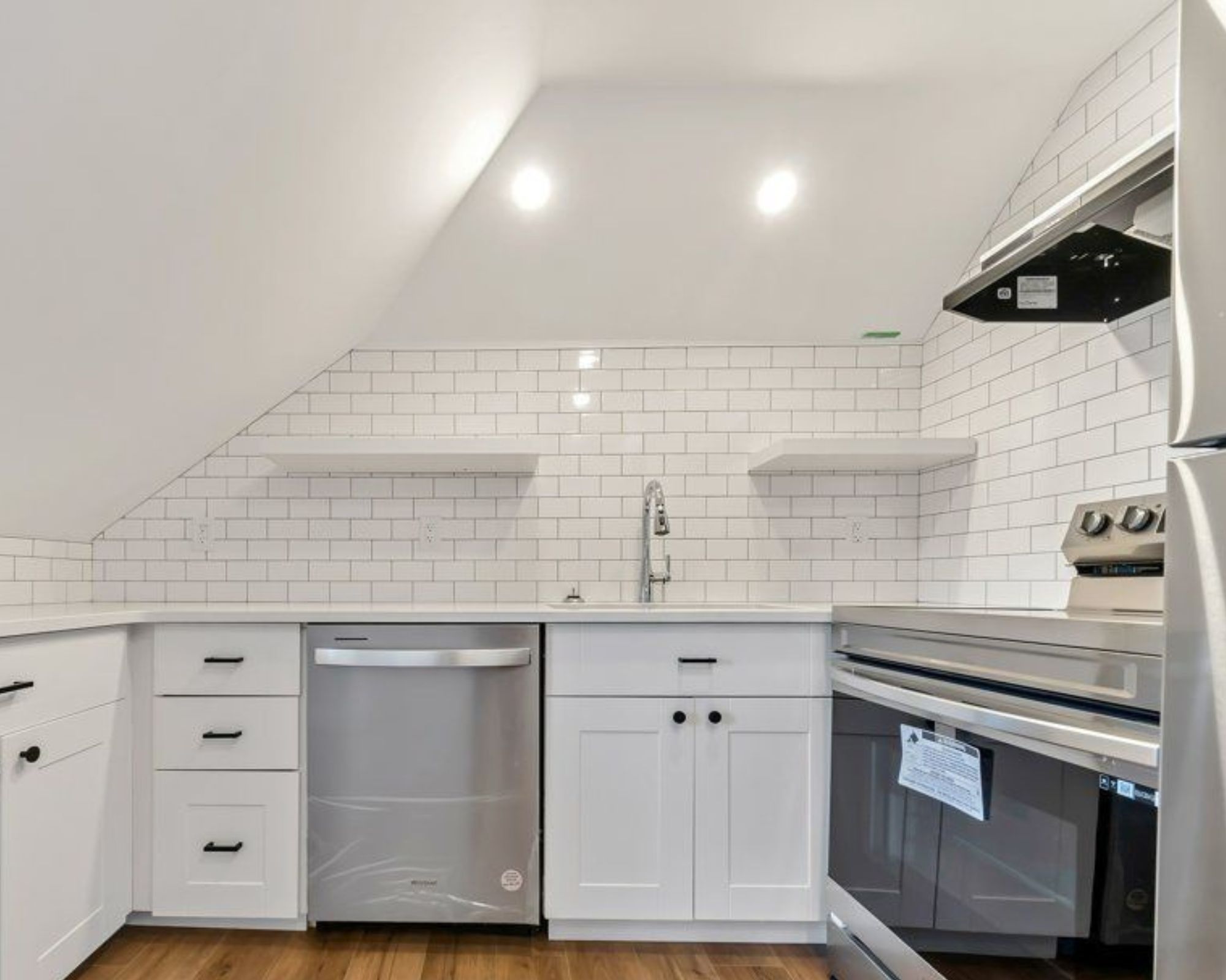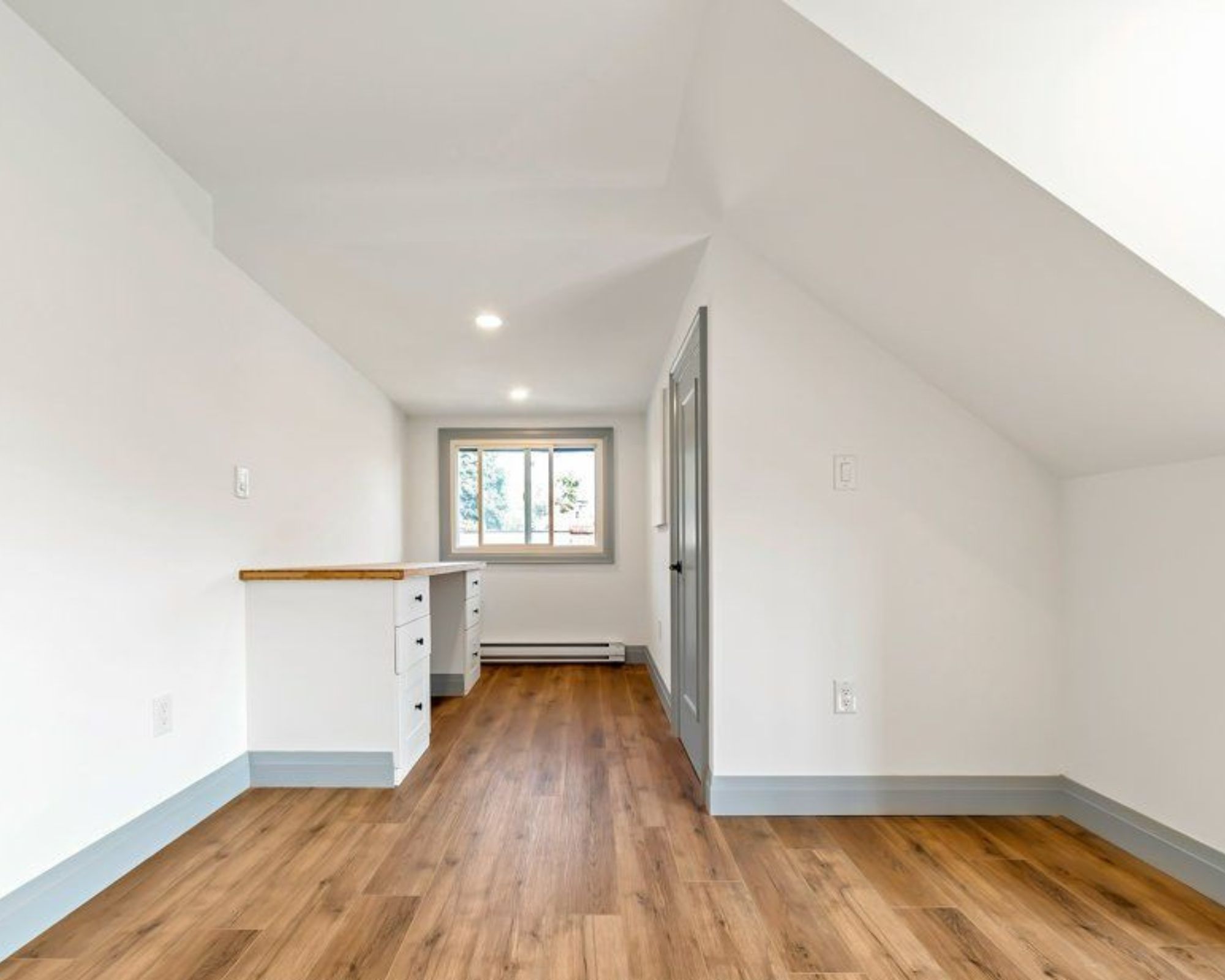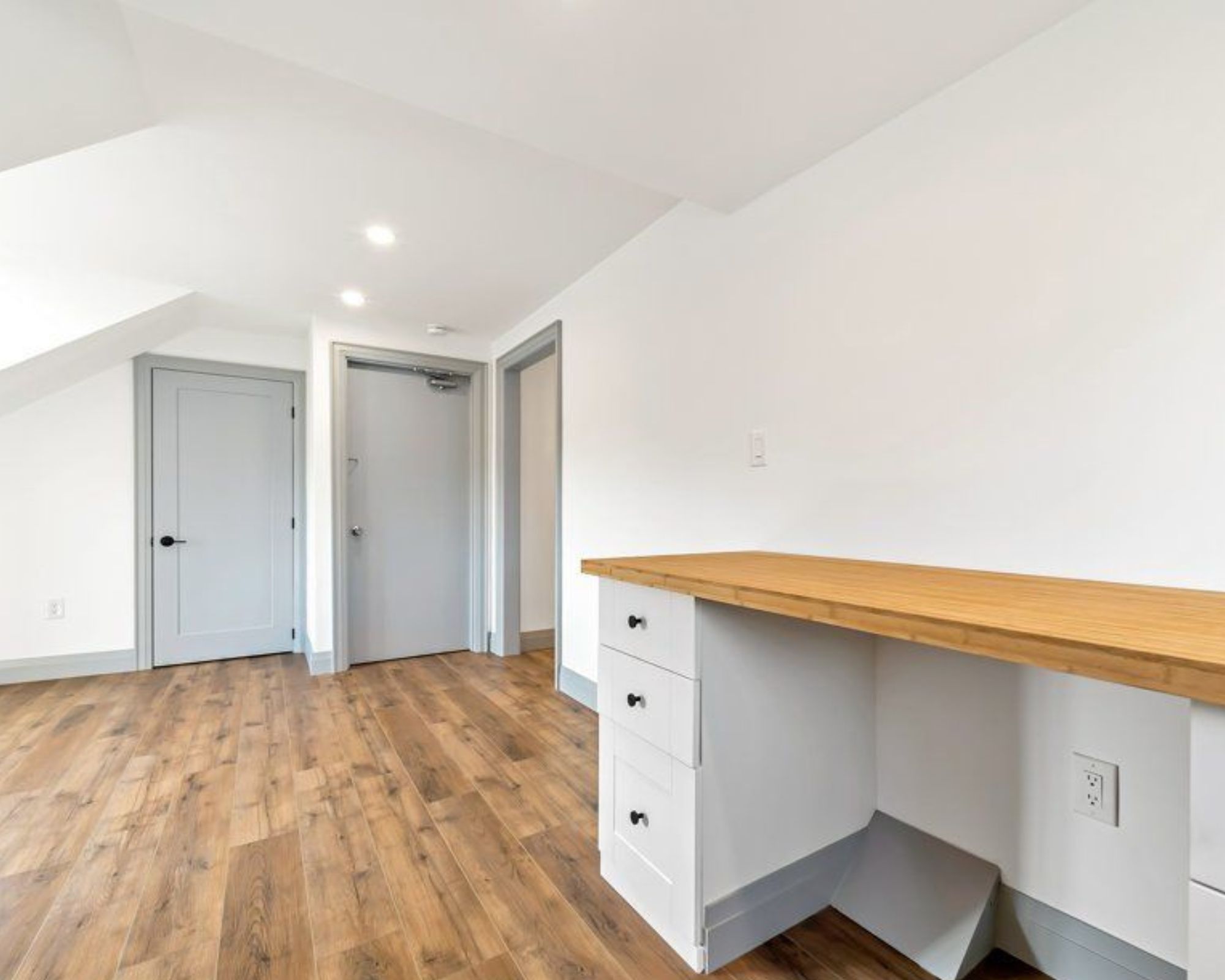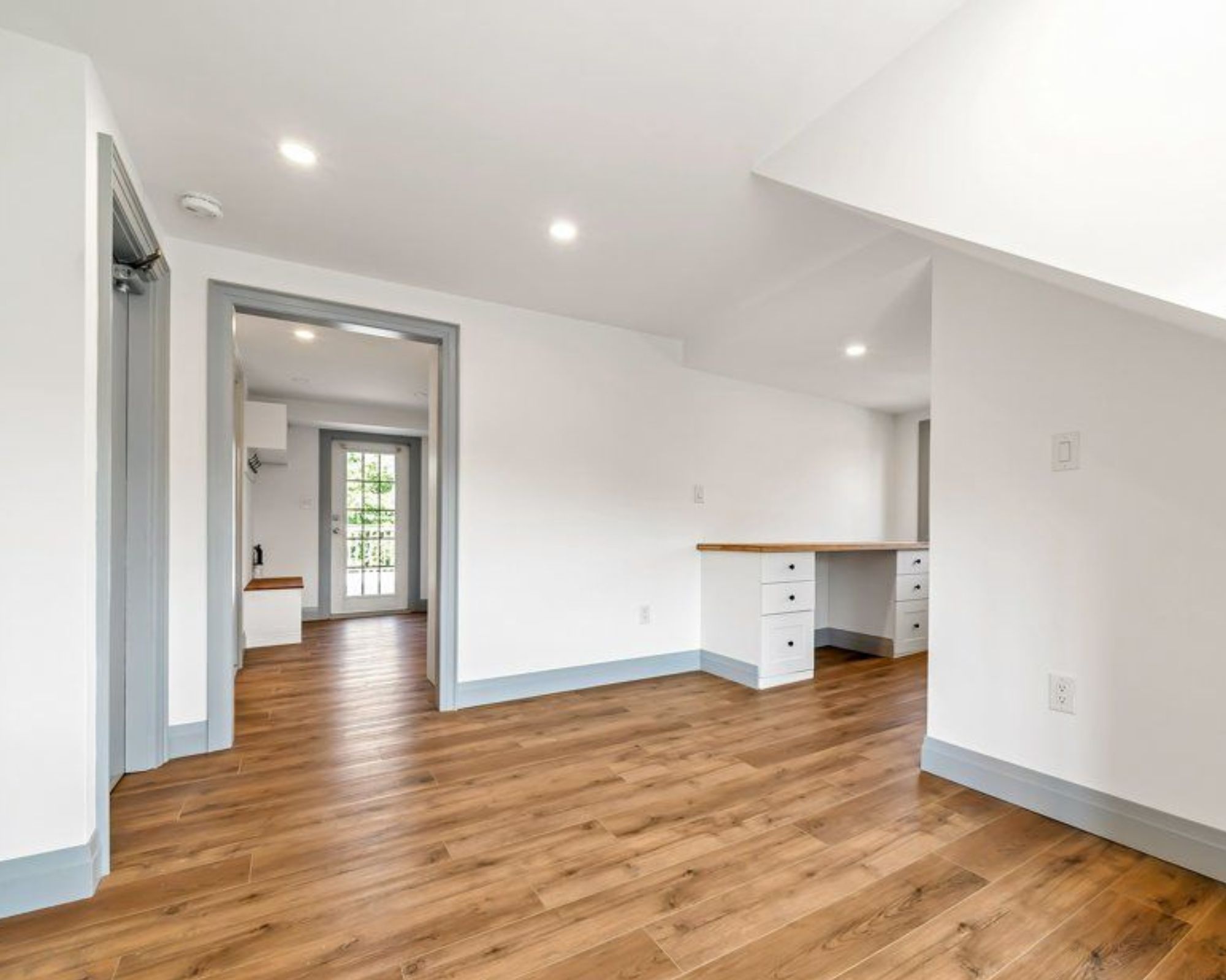 • Convenient built-ins include a desk for work-from-home and custom shelving for organization.