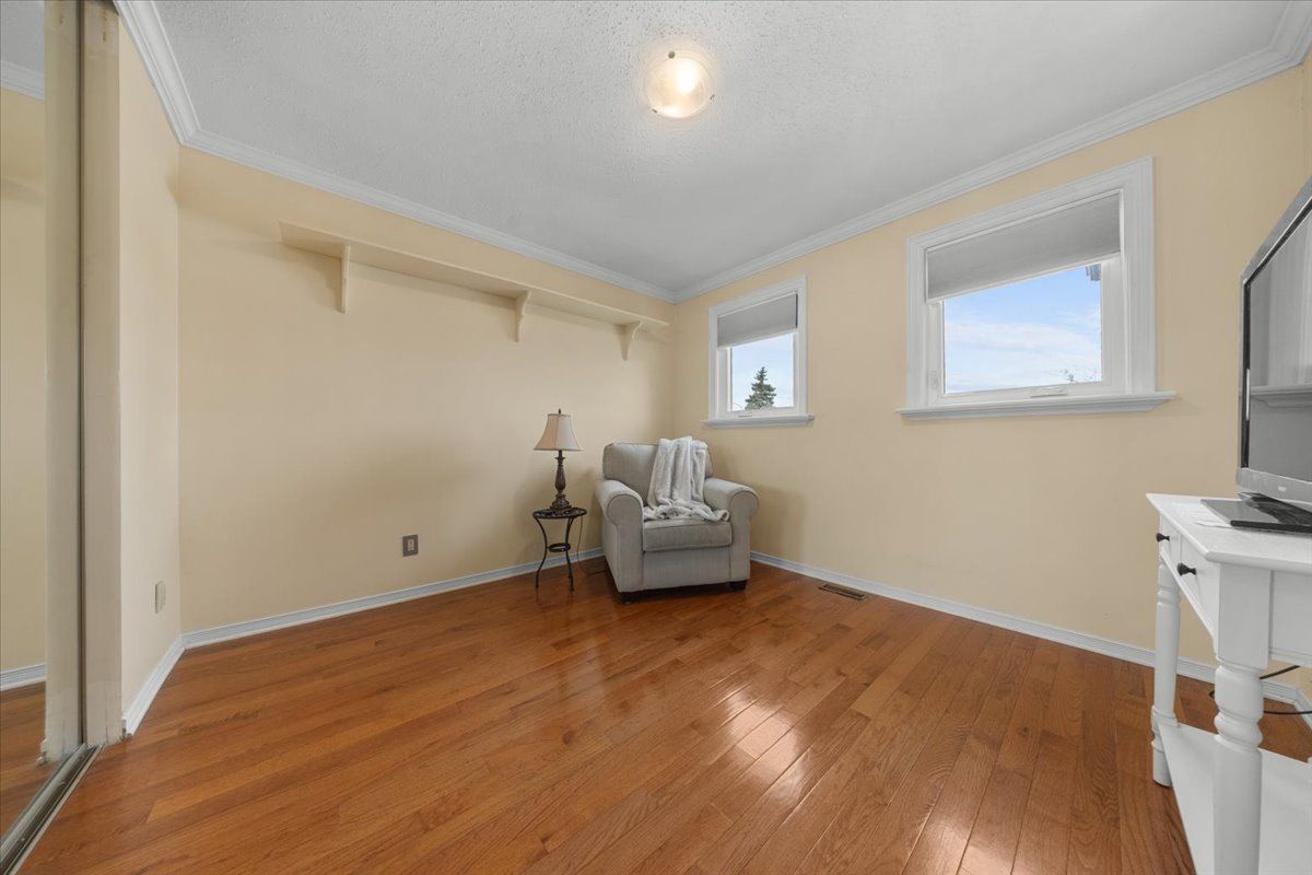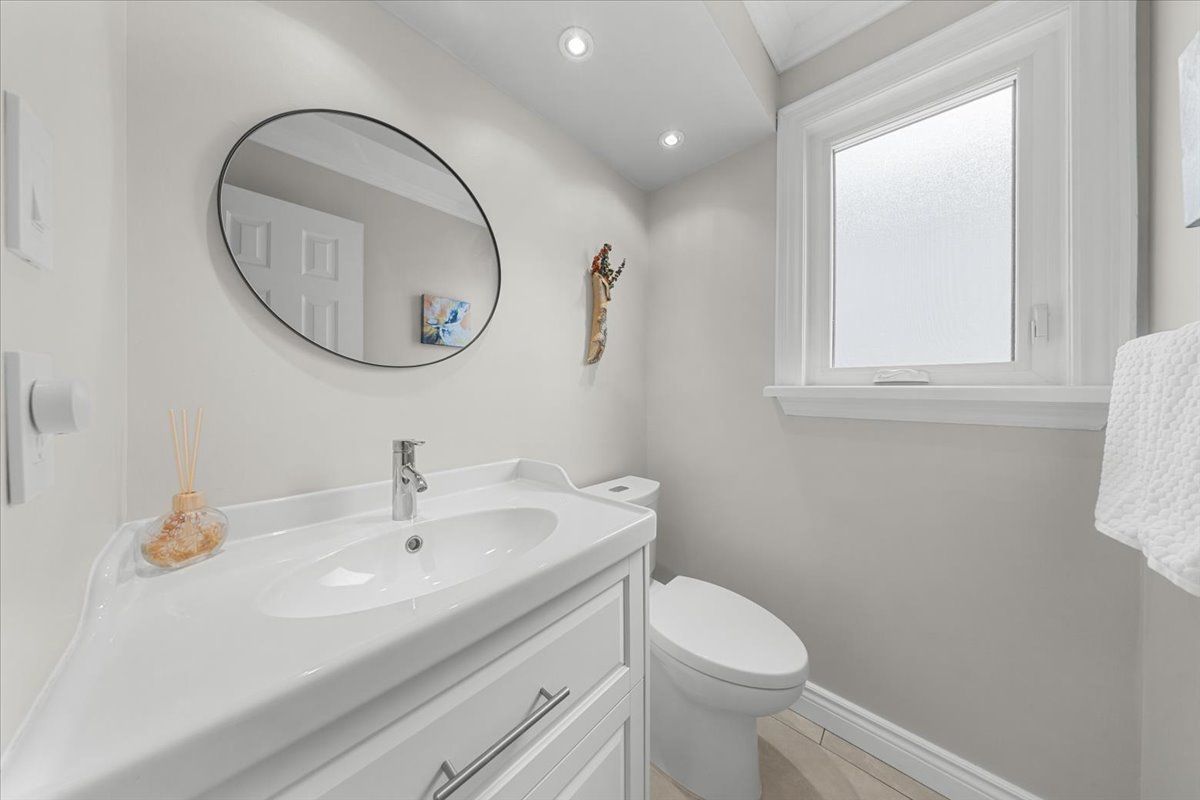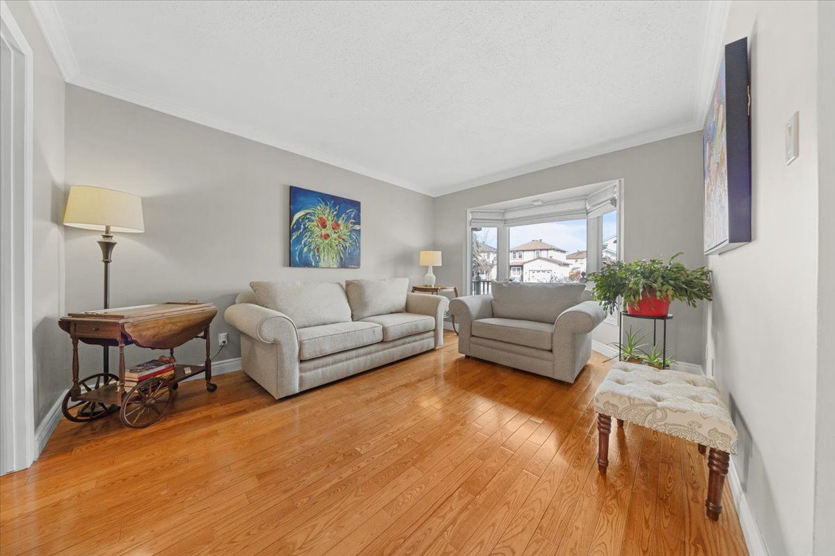 Four-bedroom detached residence featuring a double-wide driveway, interlock walkway & covered front veranda creating a welcoming presence. The front door w/decorative glass sidelights opens to a bright foyer w/ceramic tile flooring & mirrored closet. Hardwood flooring, high baseboards & crown mouldings extend through the principal rms, establishing a refined interior. The centre island kitchen is designed for functionality & entertaining, featuring quartz countertops, a five-stool breakfast bar & two-tone shaker cabinetry w/glass accents, spice rack, drawers & a 24-inch pantry w/pull-outs. Upper/lower mouldings w/valance lighting, led pot lights and a horizontal tile backsplash. Appliances include a gas cooktop w/fluted hood fan, built-in oven & microwave, fisher & paykel refrigerator & wine fridge. Oversized ceramic tile flooring leads to patio doors opening to the rear deck and gazebo. The sunken family rm is anchored by a wood-burning fireplace & southern-facing bay window w/built-in speakers. The living room features a second bay window & is separated from the dining room by an architectural wall that maintains openness. A rear hallway w/side entrance connects to a powder room, laundry & pantry. A hardwood staircase w/post spindles leads to the second level w/ hardwood flooring & linen closet. The primary bedroom features crown moulding, bay window w/window seat and walk-in closet. The updated ensuite offers twin vanities, heated tile floors, water closet, oversized double shower w/european fixtures & rainforest head, and a corner soaker tub framed by windows. Three additional bedrooms feature hardwood flooring w/generous closets. The main bathroom includes a custom vanity, raised sink, moulded tub & ceramic tile surround. The finished lower level offers a recreation rm w/wide plank flooring & twin windows, open den, hobby rm w/french glass door & built-in workbench. The backyard features interlock patios, deck and gazebo w/pvc fencing & side gate. 24 hr irrev.
