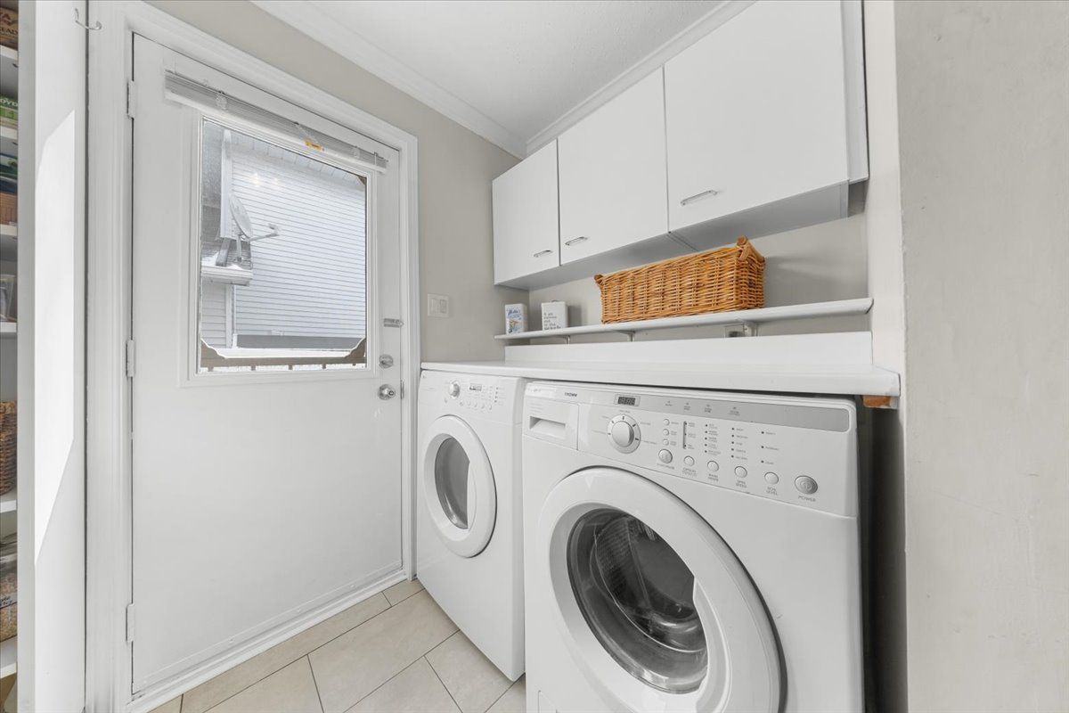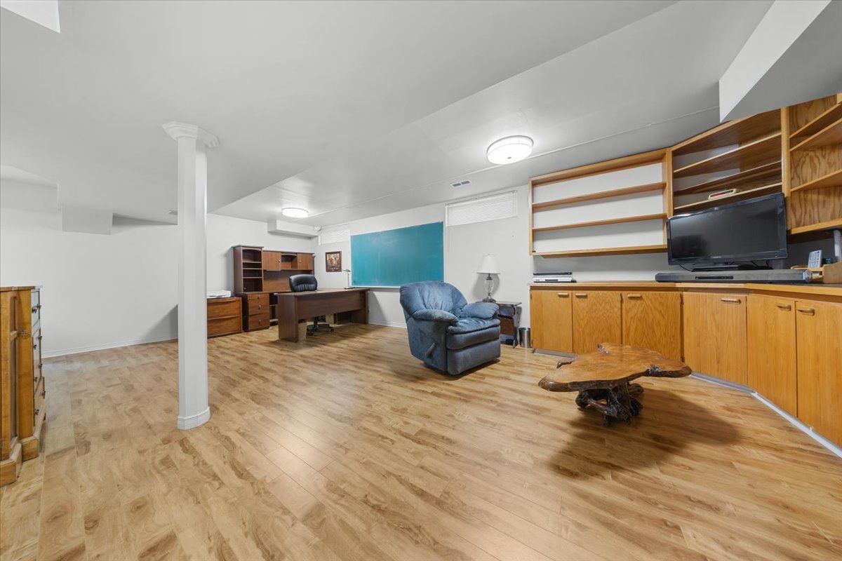 • Finished lower level includes a recreation room and hobby room with built-in workbench.