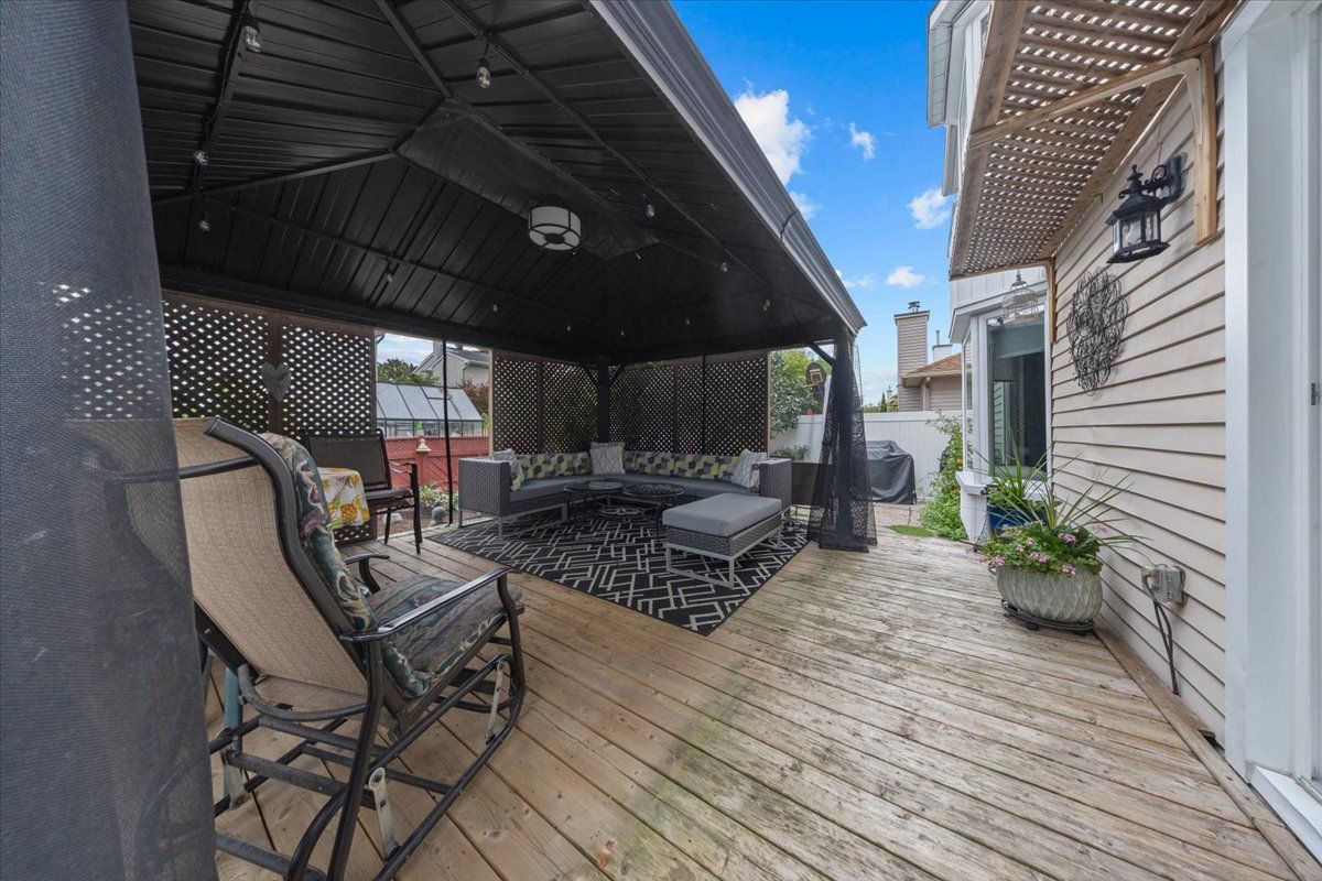 • Backyard features interlock patios, deck, and gazebo for outdoor enjoyment.