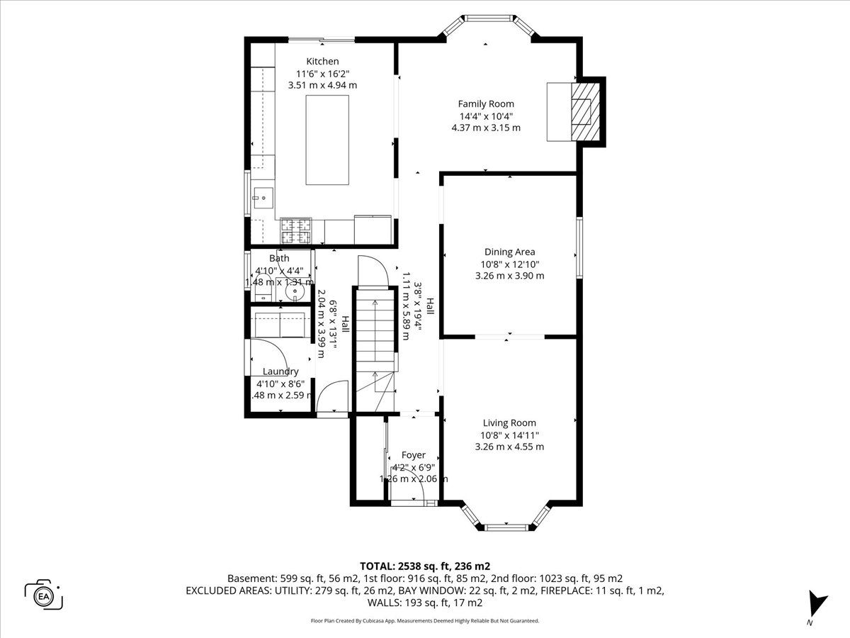 • Sunken family room with a wood-burning fireplace and southern-facing bay window.
