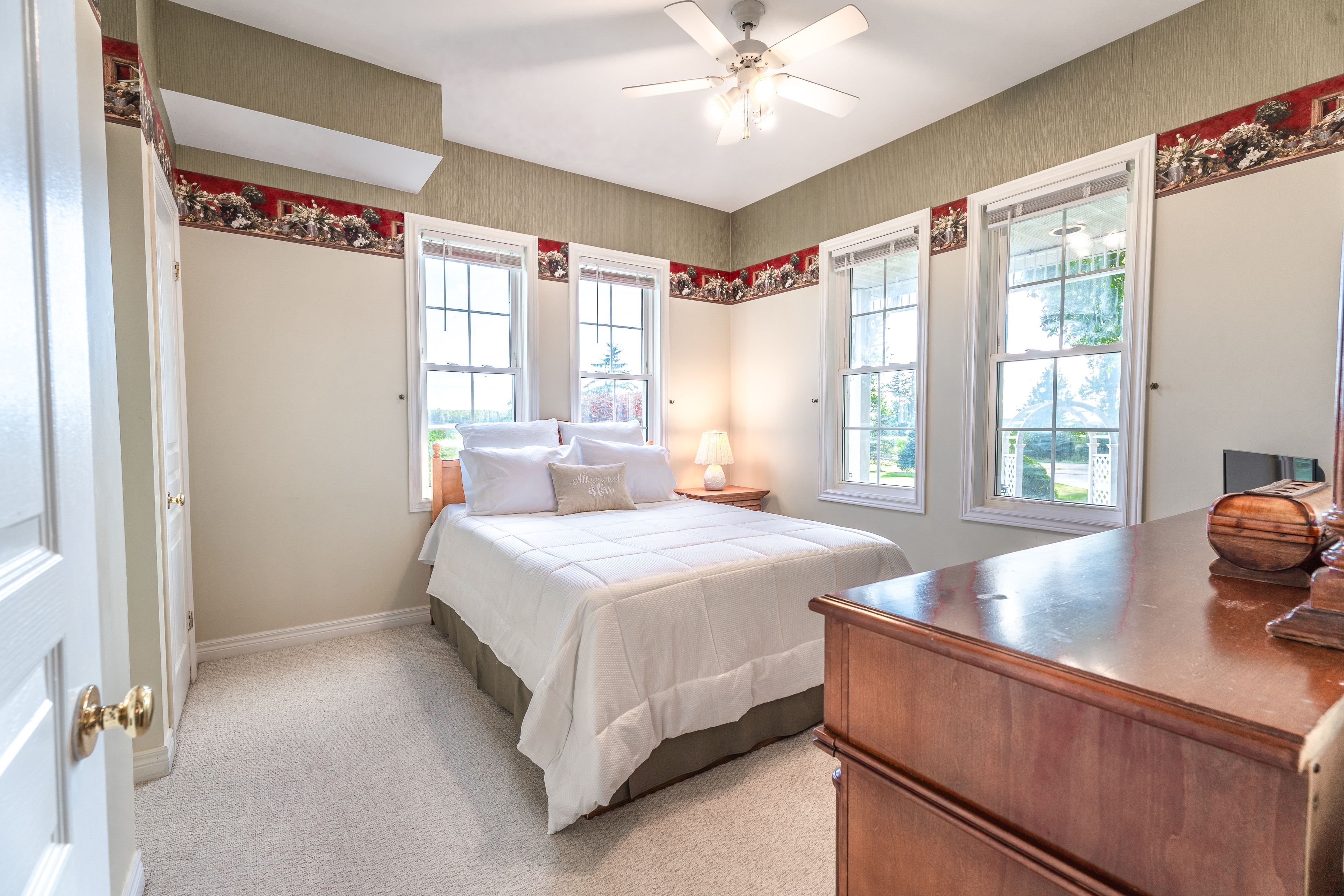 Stunning 4-bed, 3-bath cape cod-style home sitting on a private 1-acre lot that offers convenience and tranquility! The curb appeal of this home is unmatched with its sprawling footprint, double car garage, gabled roof, inviting front porch and stone patio. Step inside to experience the ultimate in open-concept living with a breathtaking double-height living room, where soaring ceilings and expansive windows flood the space with light. The upper mezzanine features an open-air railing overlooking the first story making it the perfect spot for a bright and airy home office. The secondary upper bedroom is spacious enough to serve as a large second living room. The primary suite is a true retreat, complete with a private terrace, walk-in closet, and an ensuite updated in 2022 featuring a walk-in shower and soaker tub. Outdoor living is a dream with a covered back deck overlooking the treed, private yard with neighbouring farmer's fields. Enjoy getting back outdoors or letting the kids play worry-free on the unused gravel road that offers the perfect setting for uninterrupted running, biking, and more. The expansive driveway with a turnaround provides ample space for trucks, campers, or extra vehicles during gatherings. Pride of ownership is evident throughout the home. Ask your realtor for the long list of upgrades - including a new lennox furnace (2021). Don't miss your chance to call this peaceful retreat home!