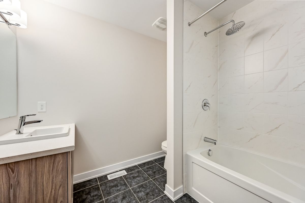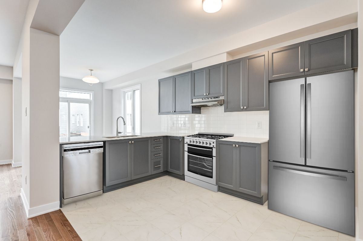 • Modern kitchen features quartz countertops and stainless steel appliances.