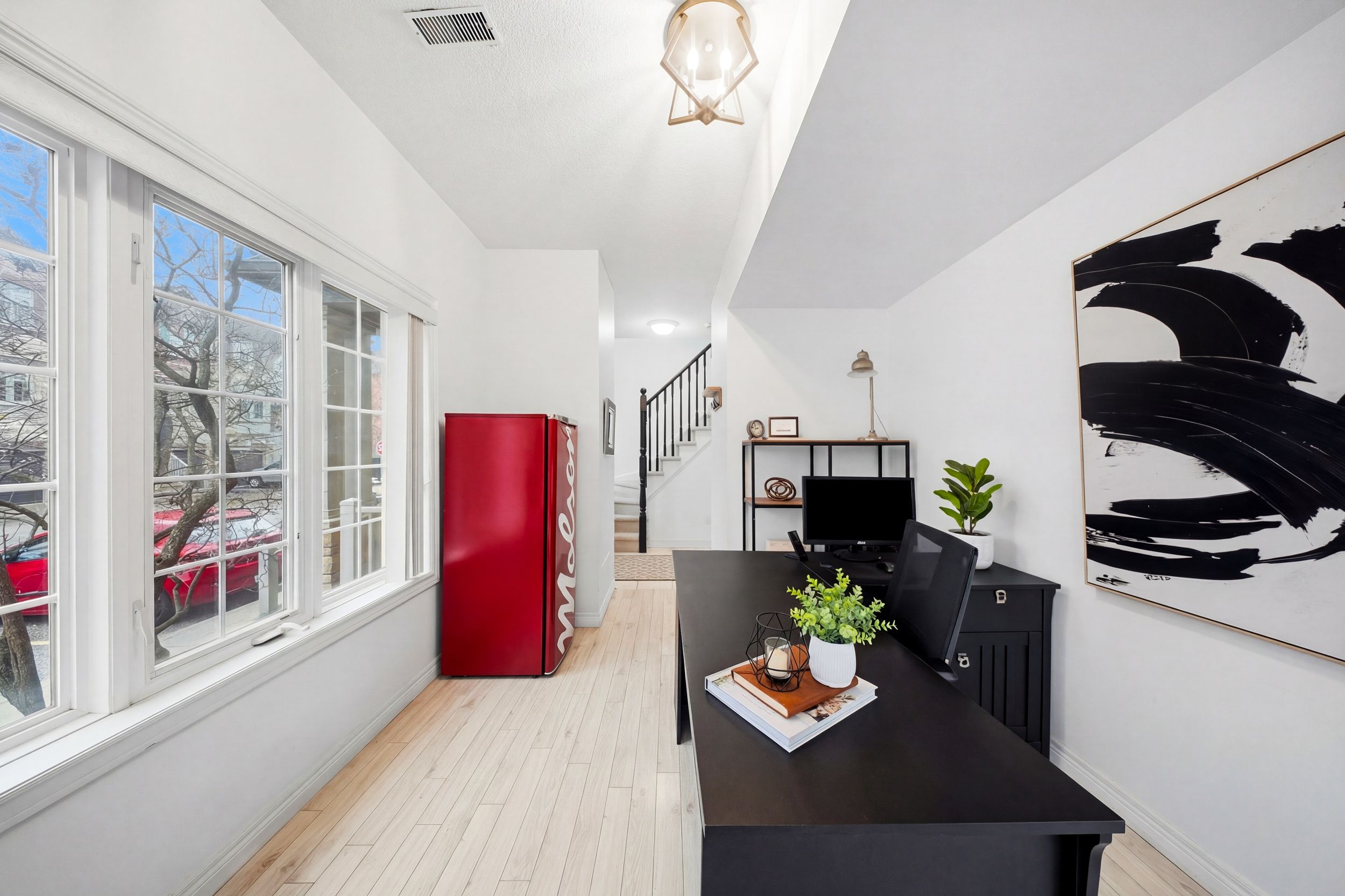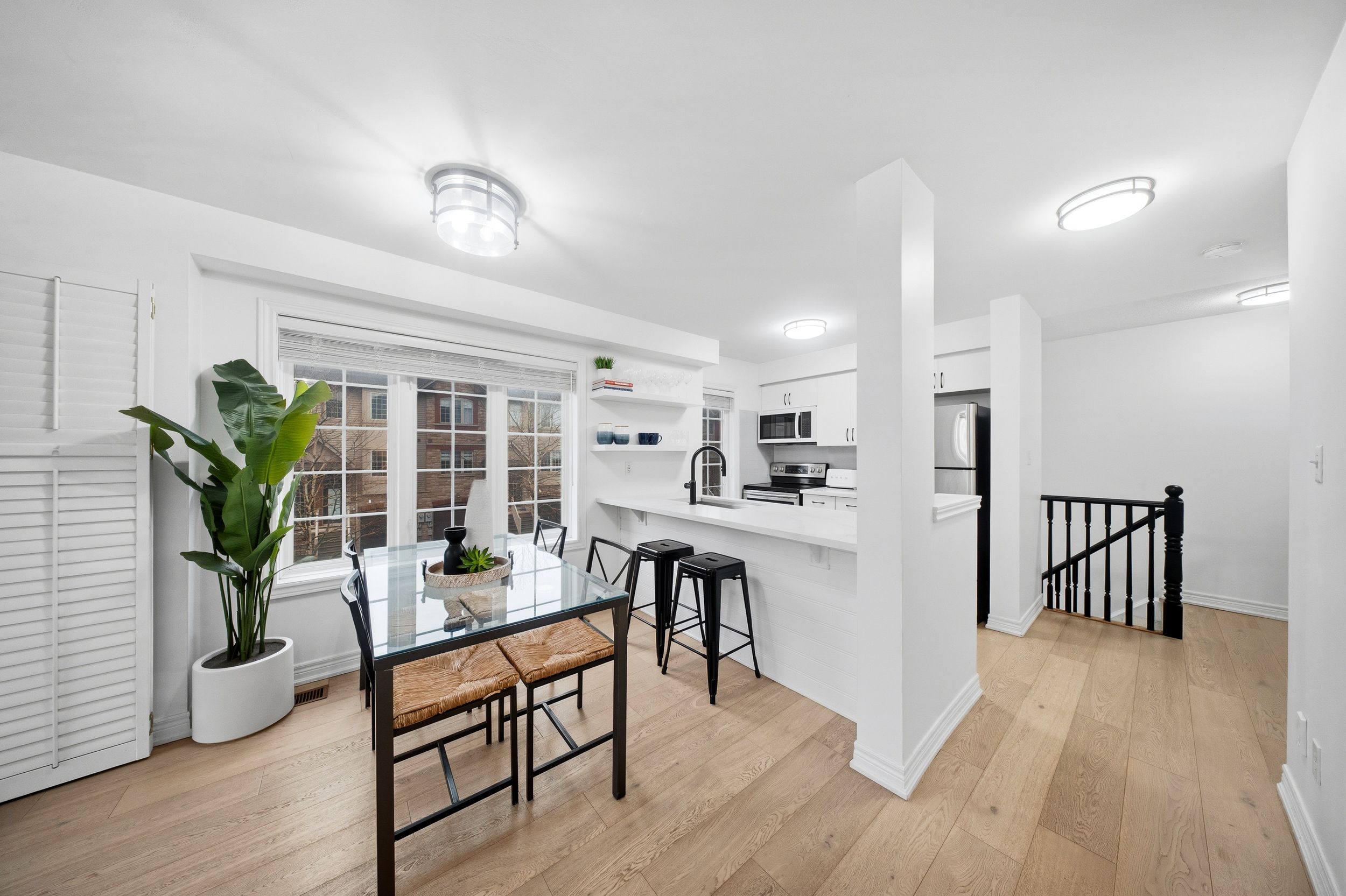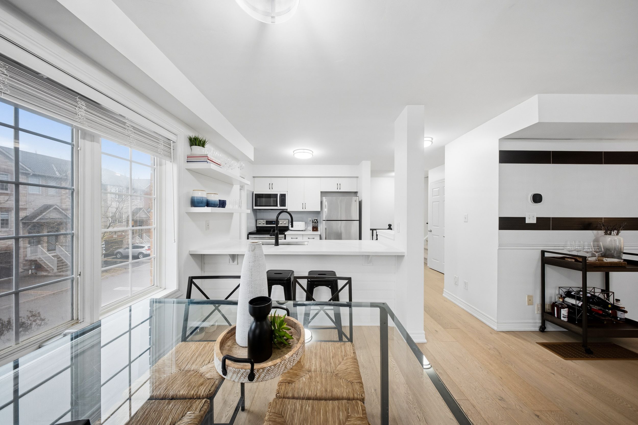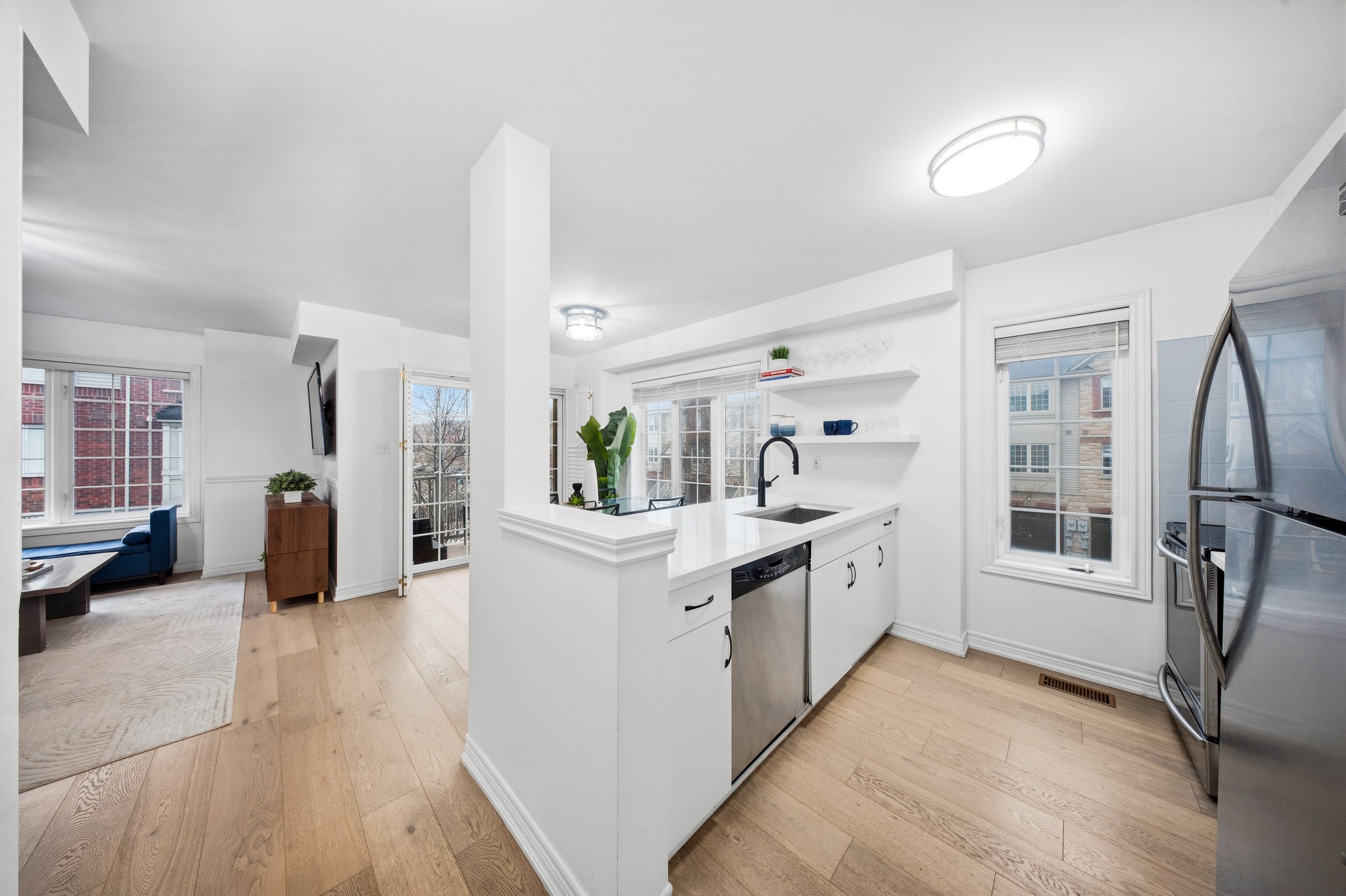 • Bright open-concept layout with large windows and modern kitchen.