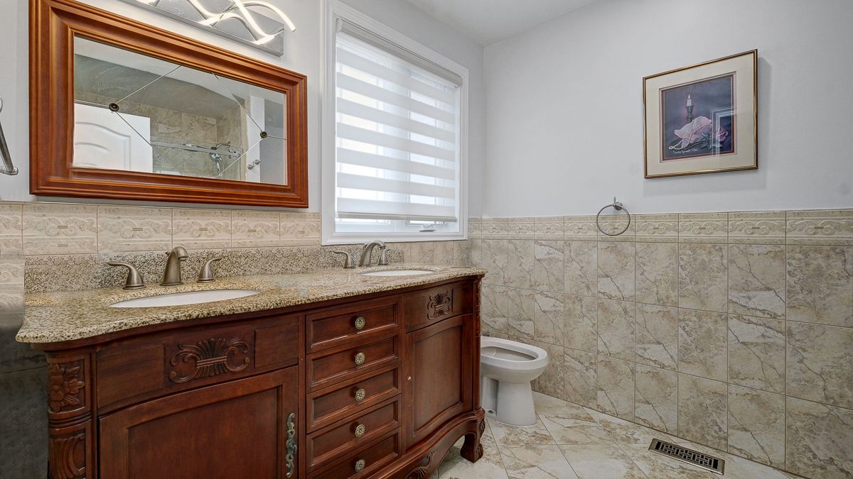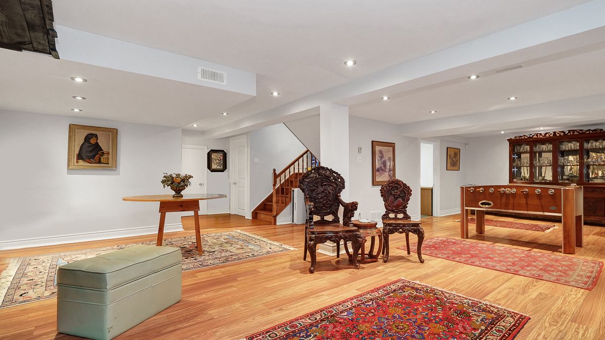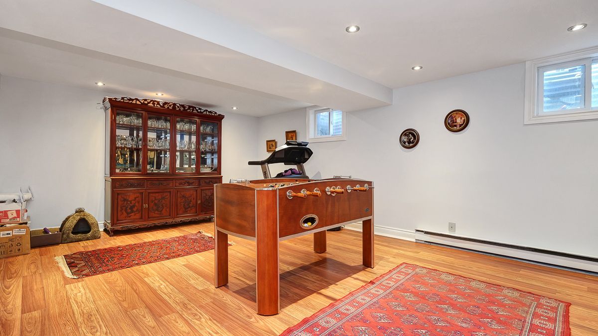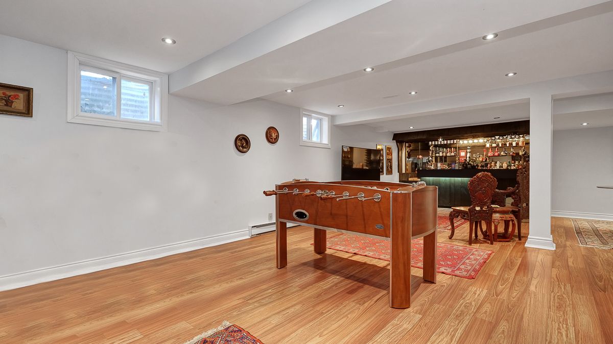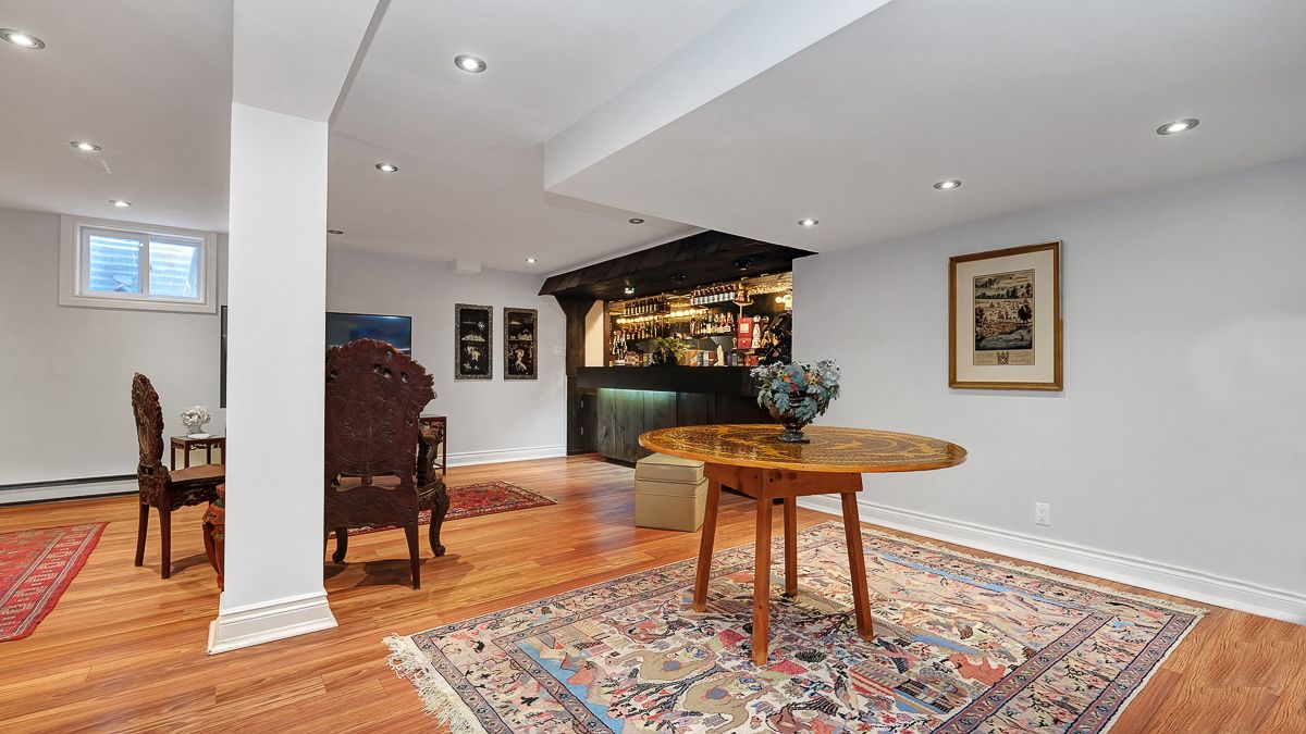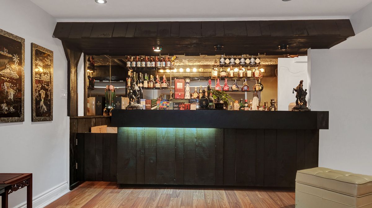 • Fully finished basement includes a bar, office space, and bathroom.