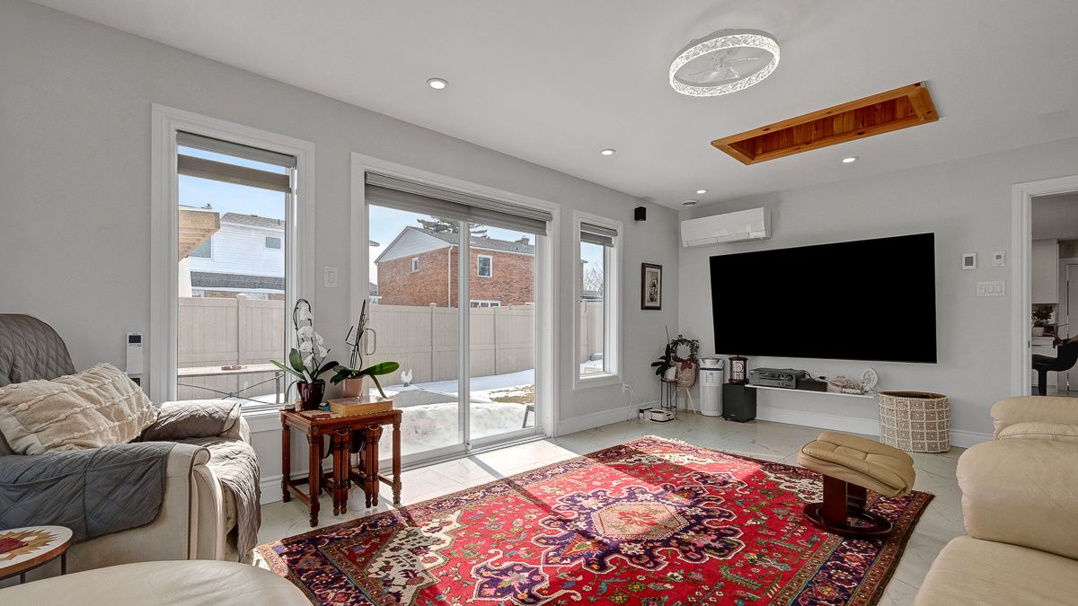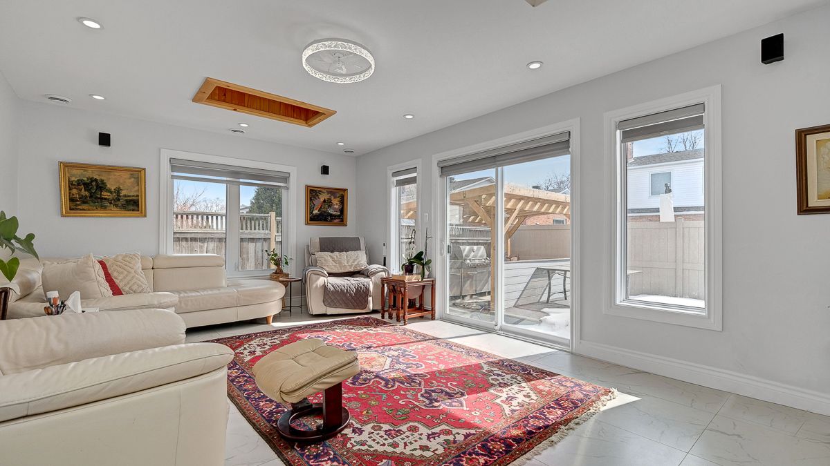 • Bright family room with skylights, built-in speakers, and scenic backyard views.