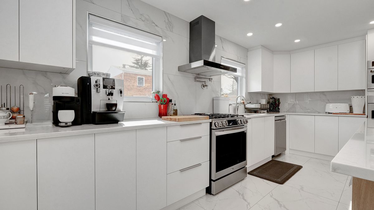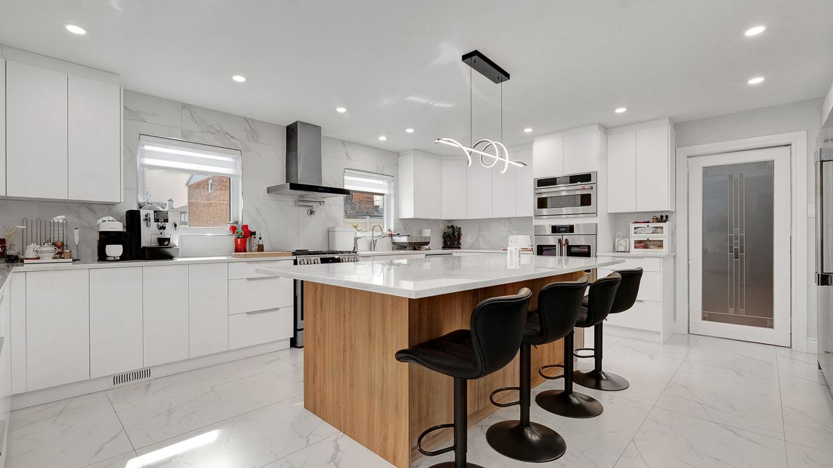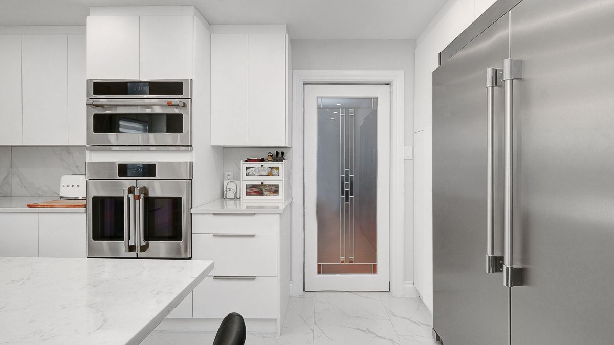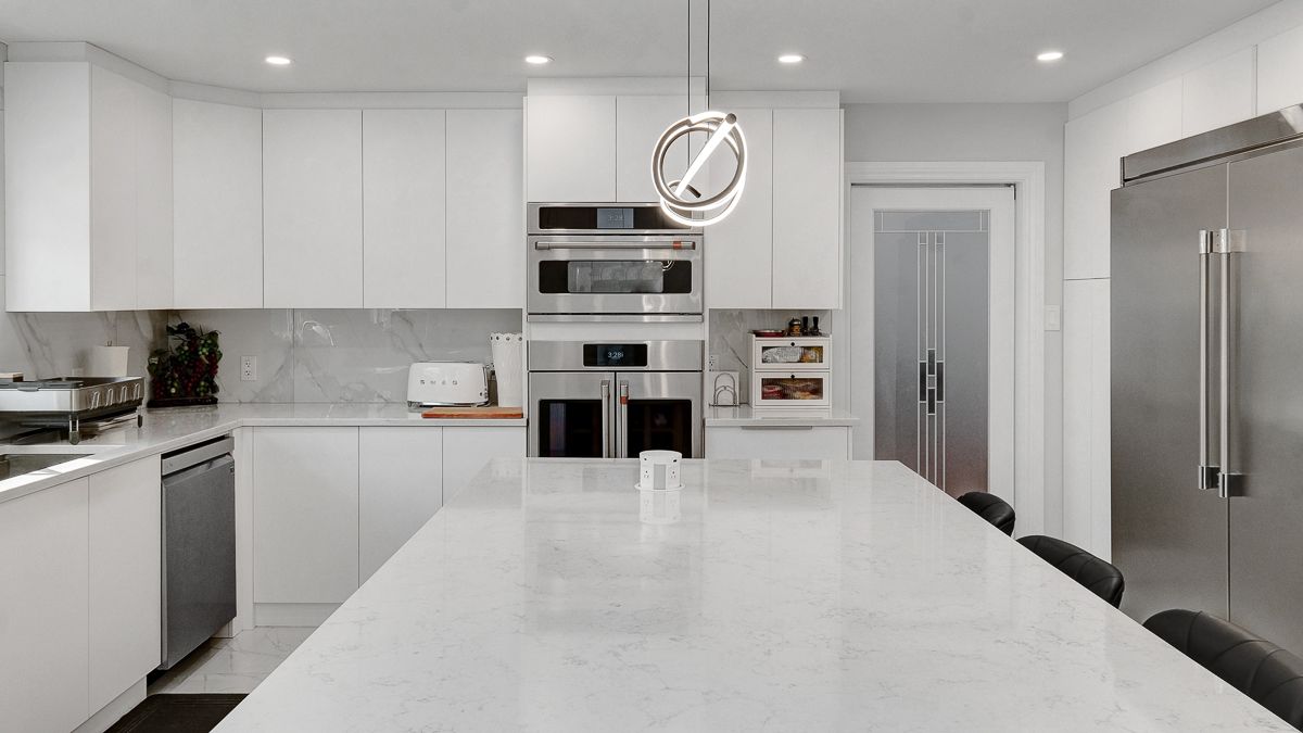 • Modern chef's kitchen featuring ample counter space and top-quality appliances.