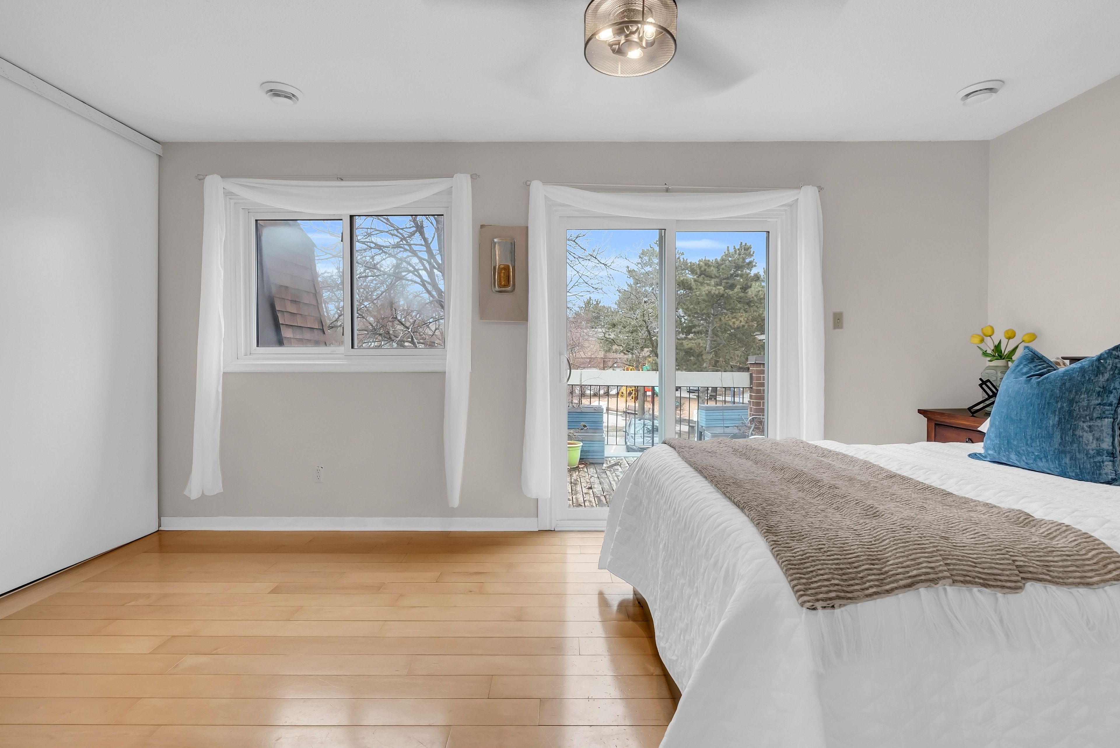 Welcome to this gorgeous move-in ready and affordable townhouse in the heart of meadowvale, offering comfort, style, and exceptional convenience. Freshly painted and featuring hardwood flooring throughout, this well-maintained home offers 3 spacious bedrooms and an open-concept living and dining area with direct access to the backyard-perfect for entertaining or relaxing with family. The kitchen boasts a stylish backsplash and a large breakfast area ideal for everyday meals. The finished basement adds valuable living space with an additional bedroom, perfect for a recreation room, home office, or guest suite. The primary bedroom features a 4-piece semi-ensuite and a walkout to a private balcony, creating a peaceful retreat. Enjoy direct access to scenic trails and parks right from your backyard. Furnance new (2023) new deck 2020, renovated washrooms, fridge, microwave (2018) new stove (2026). Ideally located steps from highways 401 and 407, meadowvale town centre, meadowvale go station, schools, parks, and recreation facilities.