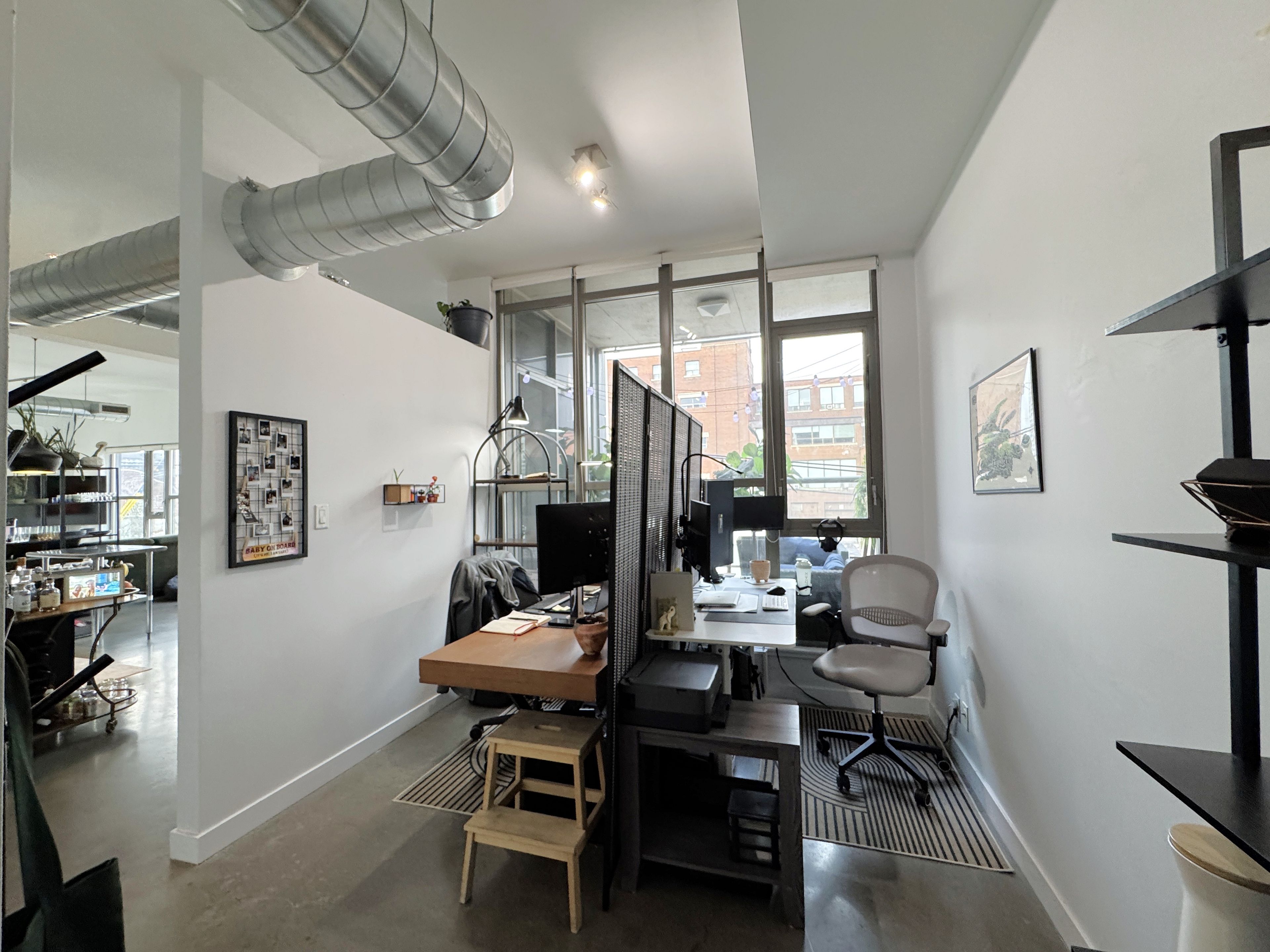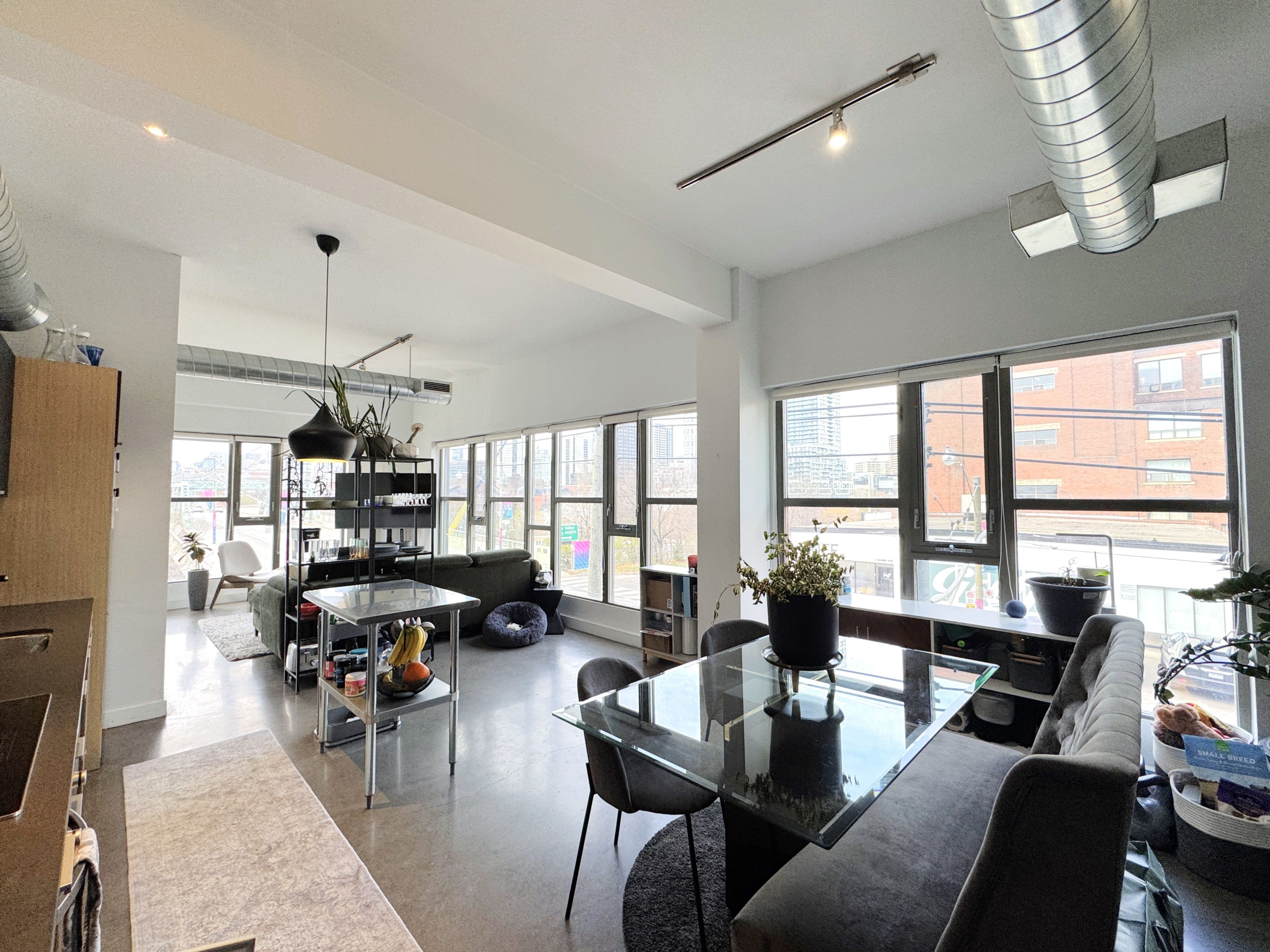 • Spacious corner loft with an industrial feel and high 10' ceilings.