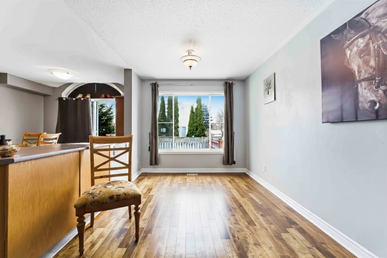 Charming 3-bedroom, 2. 5-bath townhome nestled on a quiet crescent lined with mature trees. Ideally located just minutes from parks, schools, everyday amenities, and public transit, this home offers the perfect blend of comfort and convenience. Step inside to a welcoming foyer featuring a large closet, convenient inside access to the garage, and a main-level powder room. The bright and open living and dining area showcases beautiful hardwood flooring and flows seamlessly into the kitchen with a cozy breakfast area, perfect for everyday living. Upstairs, you'll find three spacious bedrooms and a full family bath, including a generous primary suite complete with a walk-in closet and private en-suite. The finished lower level adds valuable living space, including a comfortable family room, a laundry area, and ample storage. Enjoy the fully fenced backyard-an ideal spot for summer bbqs, relaxing evenings, or family fun. A warm, well-maintained home in a sought-after setting-this is one you won't want to miss. Roof 2015, a/c and furnace 2020.
