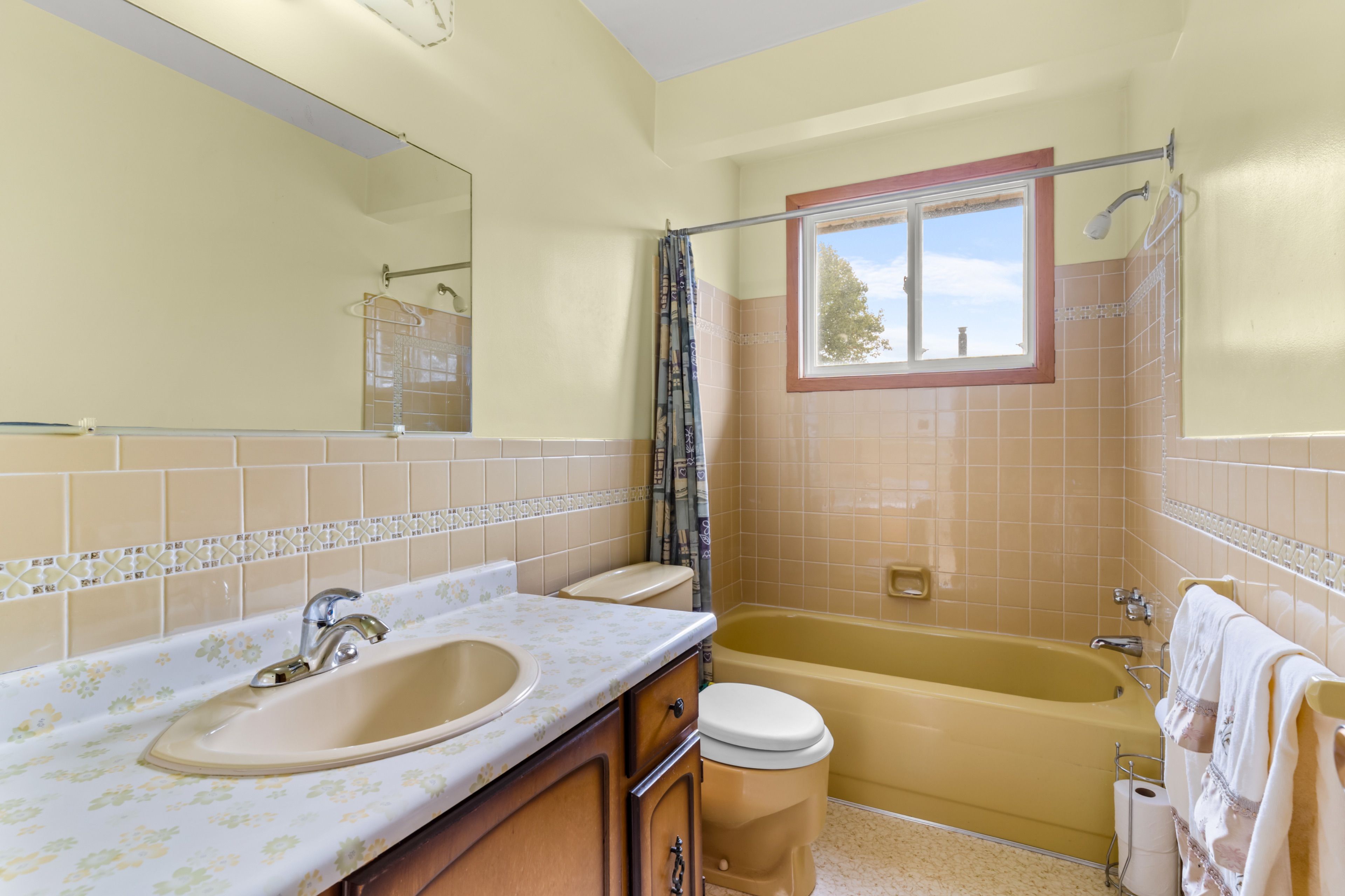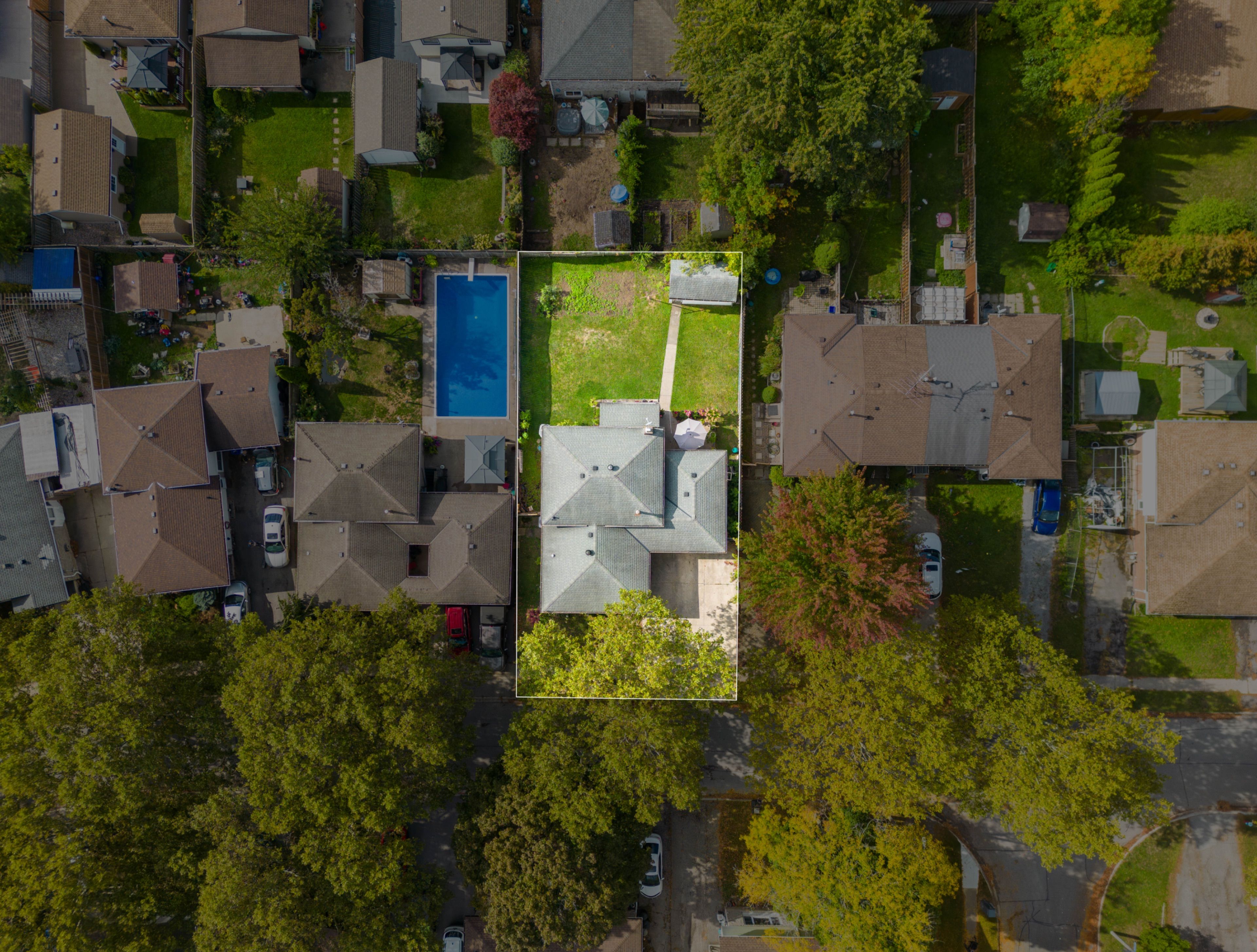• Fully fenced backyard with mature trees in a quiet neighborhood.