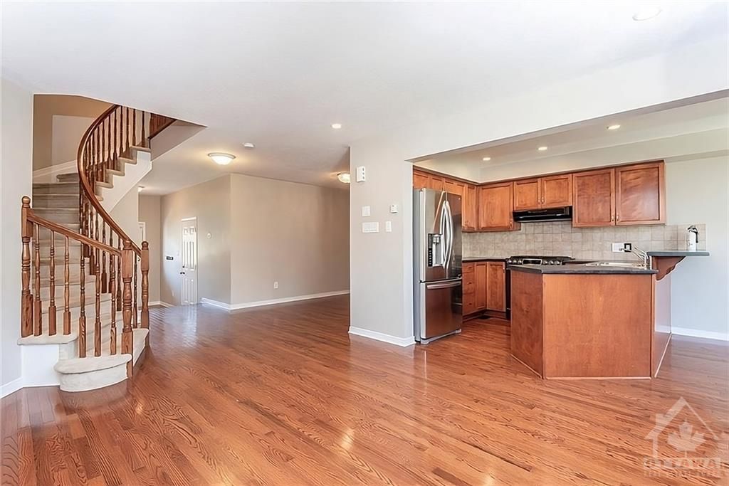 Beautiful 3 bed 3 bath townhouse for rent in the highly desirable morgan's grant community, in kanata north hi-tech district! Close to great trails, playgrounds, restaurants, shopping, public transit and few min to dnd! Bright open concept main level features living, dining, eating area. Functional kitchen with lots of cabinets and appliances. Gorgeous fireplace in the living area and hardwood throughout the main floor. Second level has great size master bed with walk-in closet and en-suite. Other 2 bedrooms, a full bath and laundry complete this level. Basement is finished and has office as well as entertainment/gym space. Private fenced yard for social gatherings! Central air conditioner and 5 appliances are included. This home has many modern features and desirable location, please call to book showing. No smoking and no pets. Rental application required.