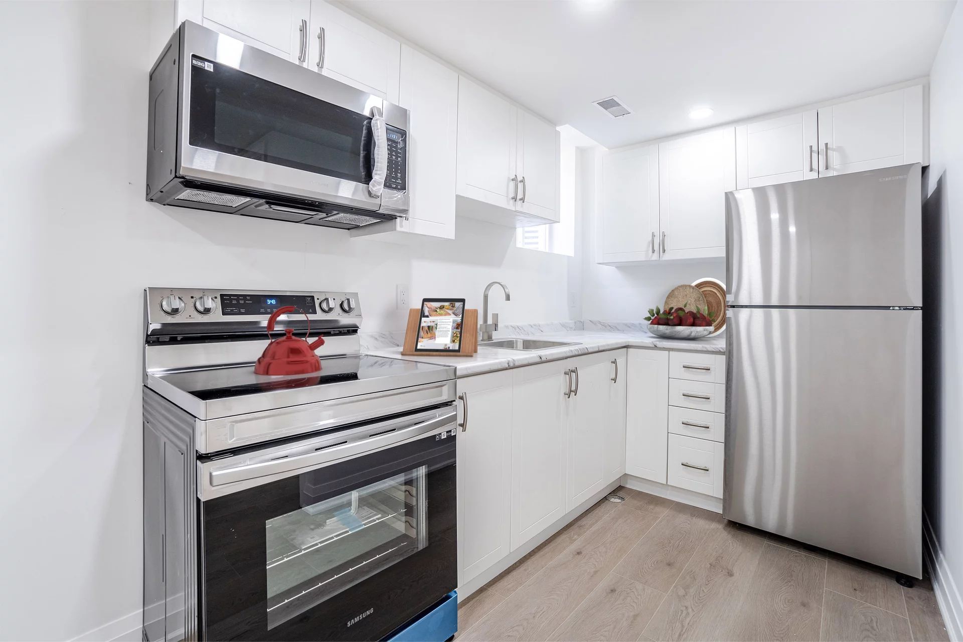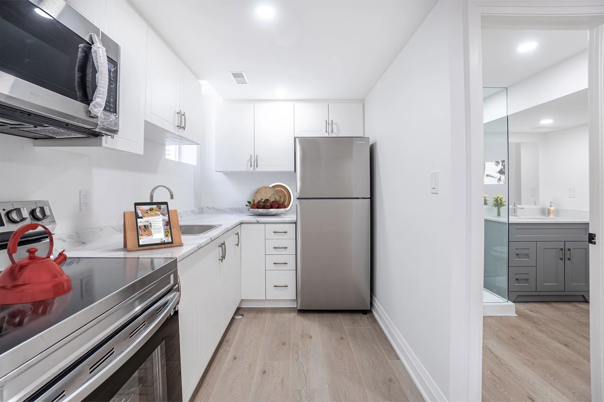 • Functional modern kitchen with ample cabinet and counter space.