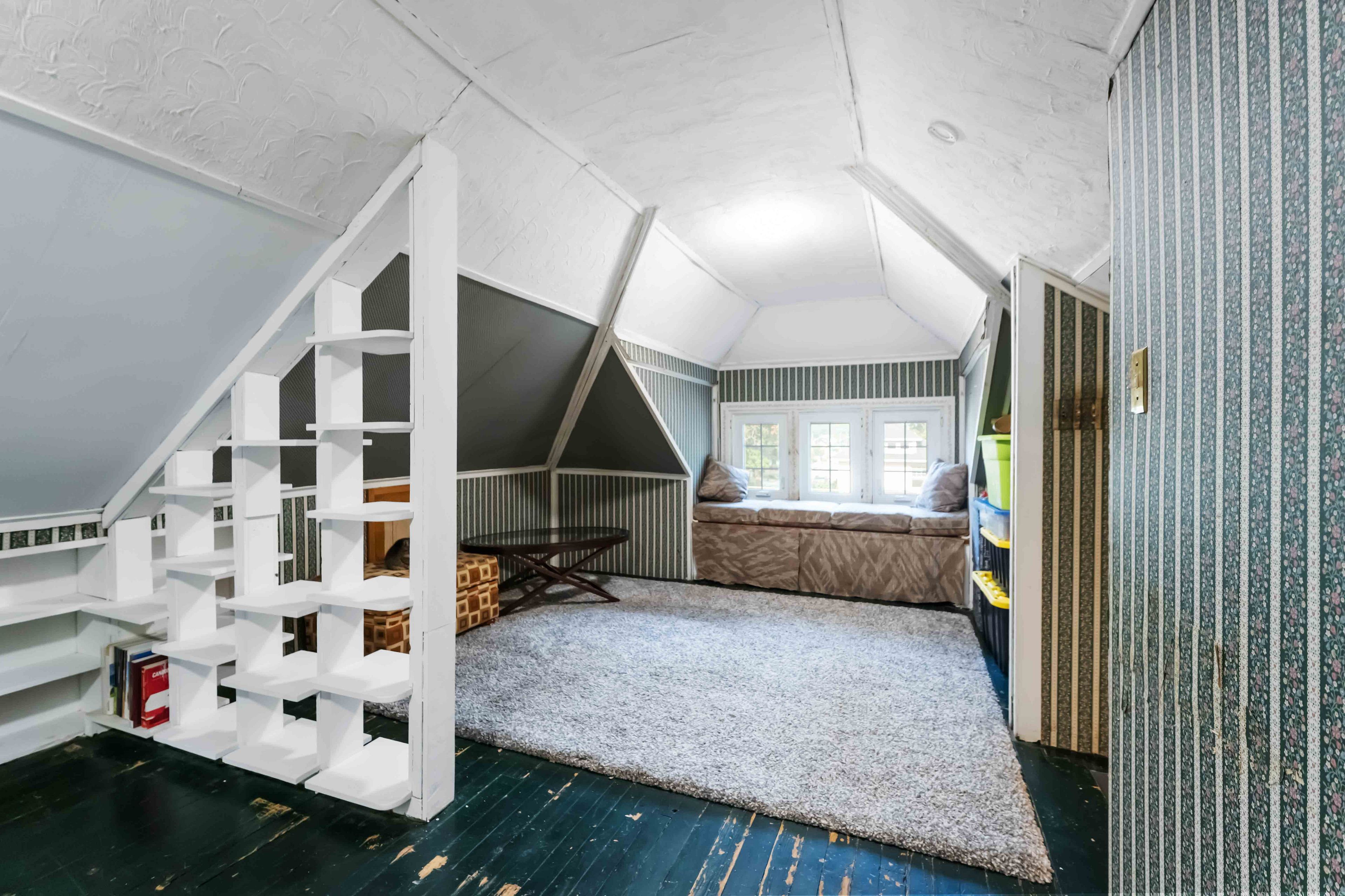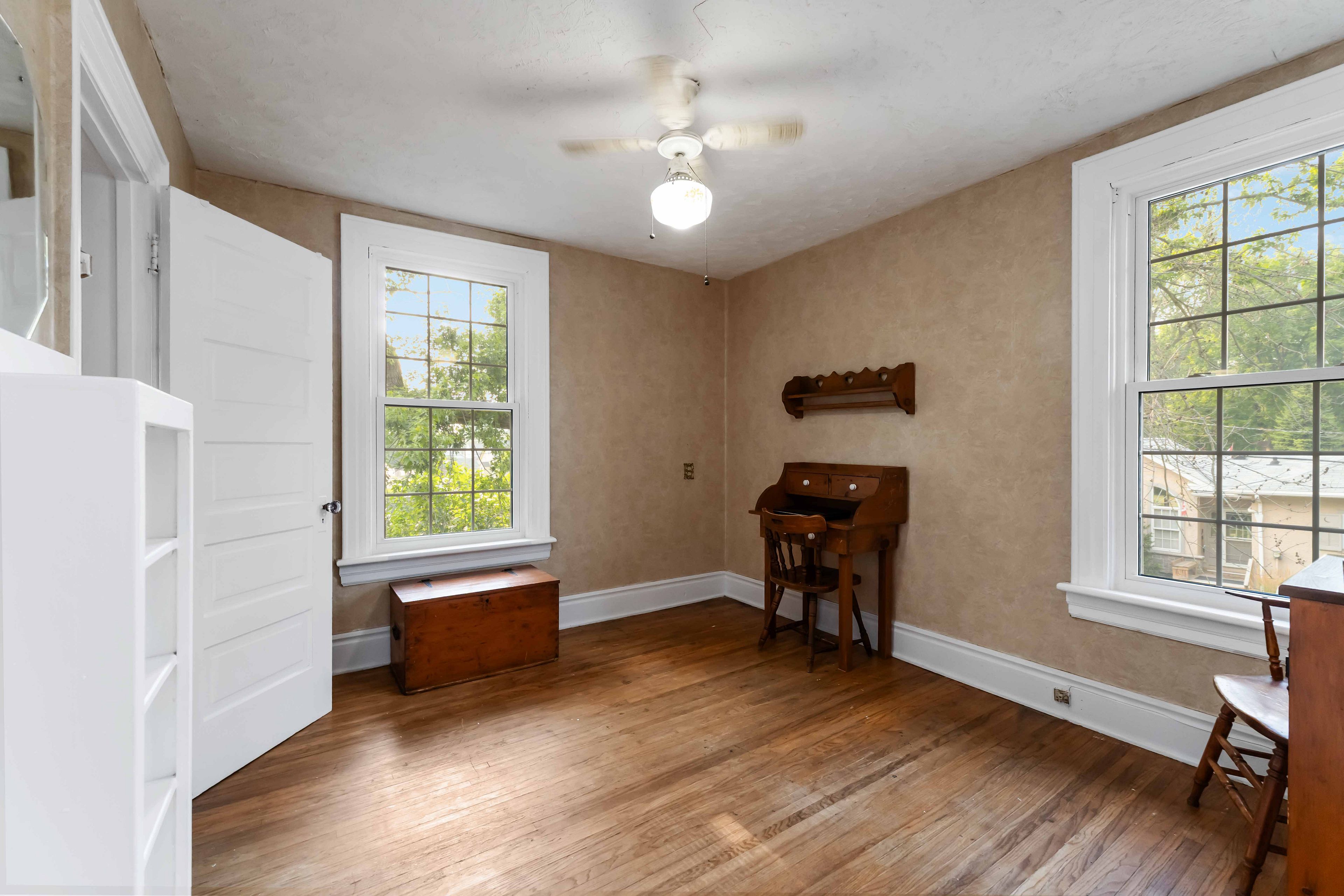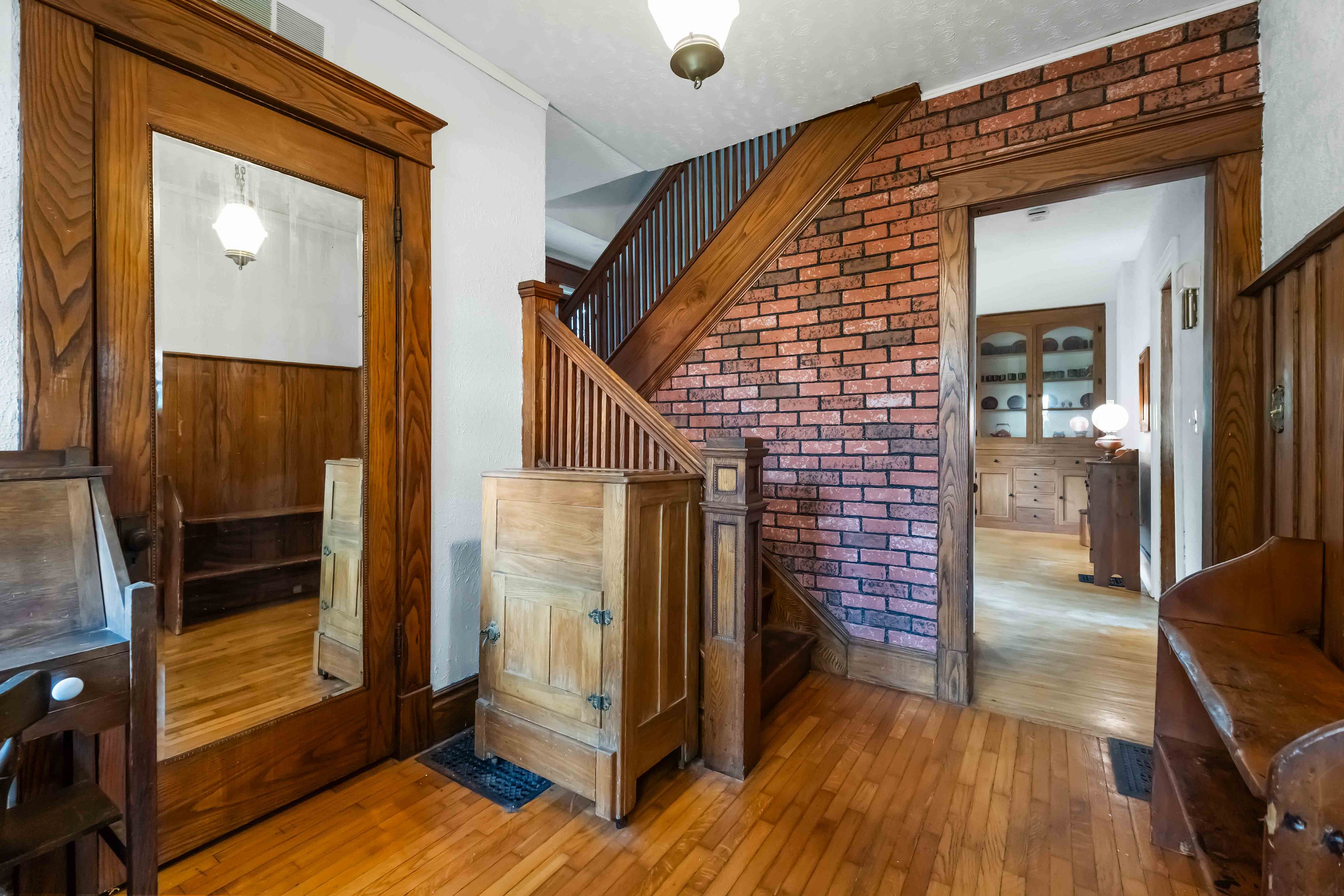 • Original hardwood floors and stained glass highlight unique craftsmanship.