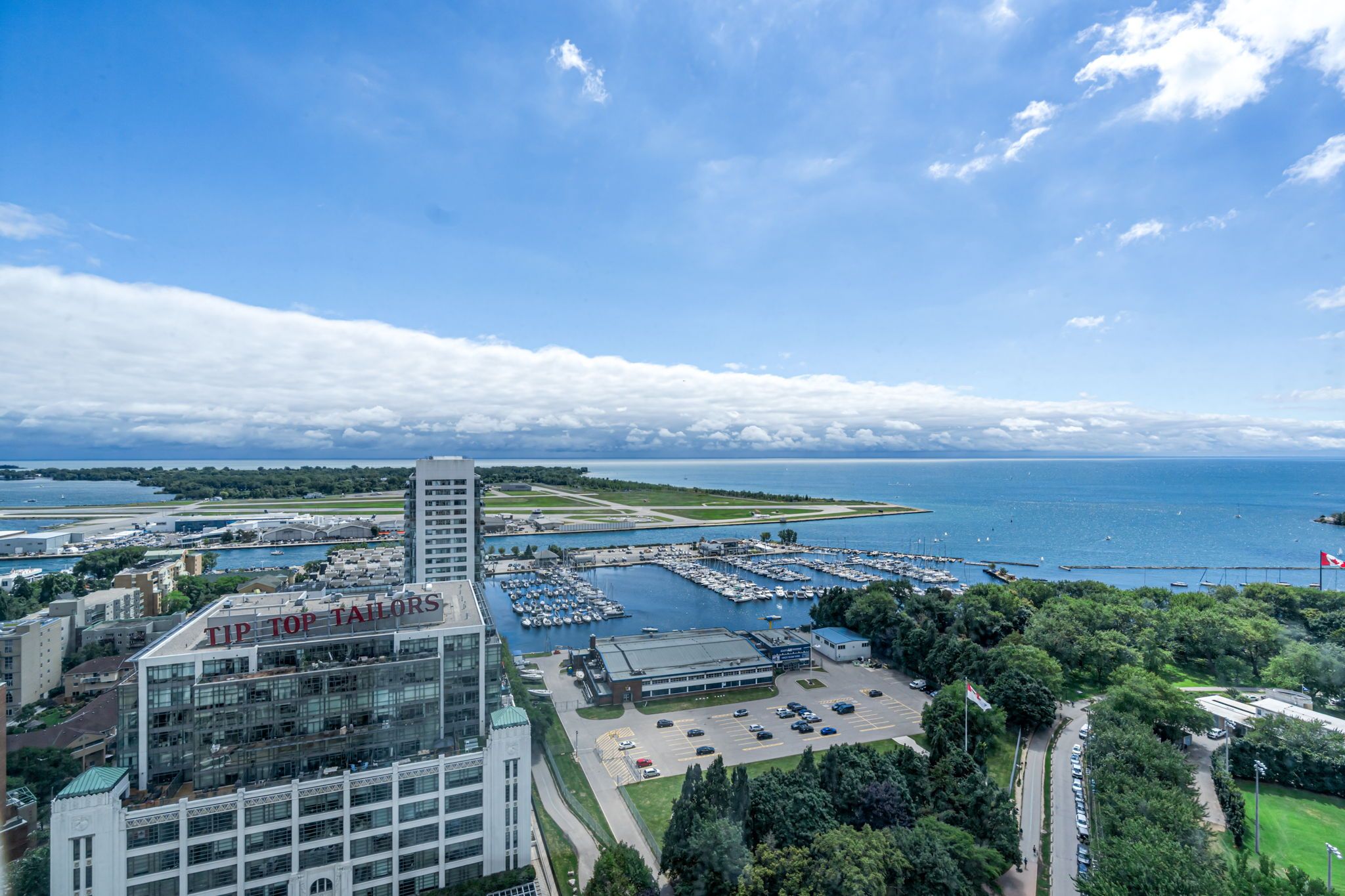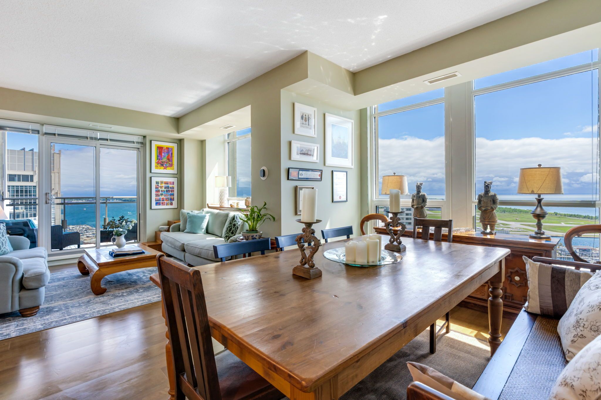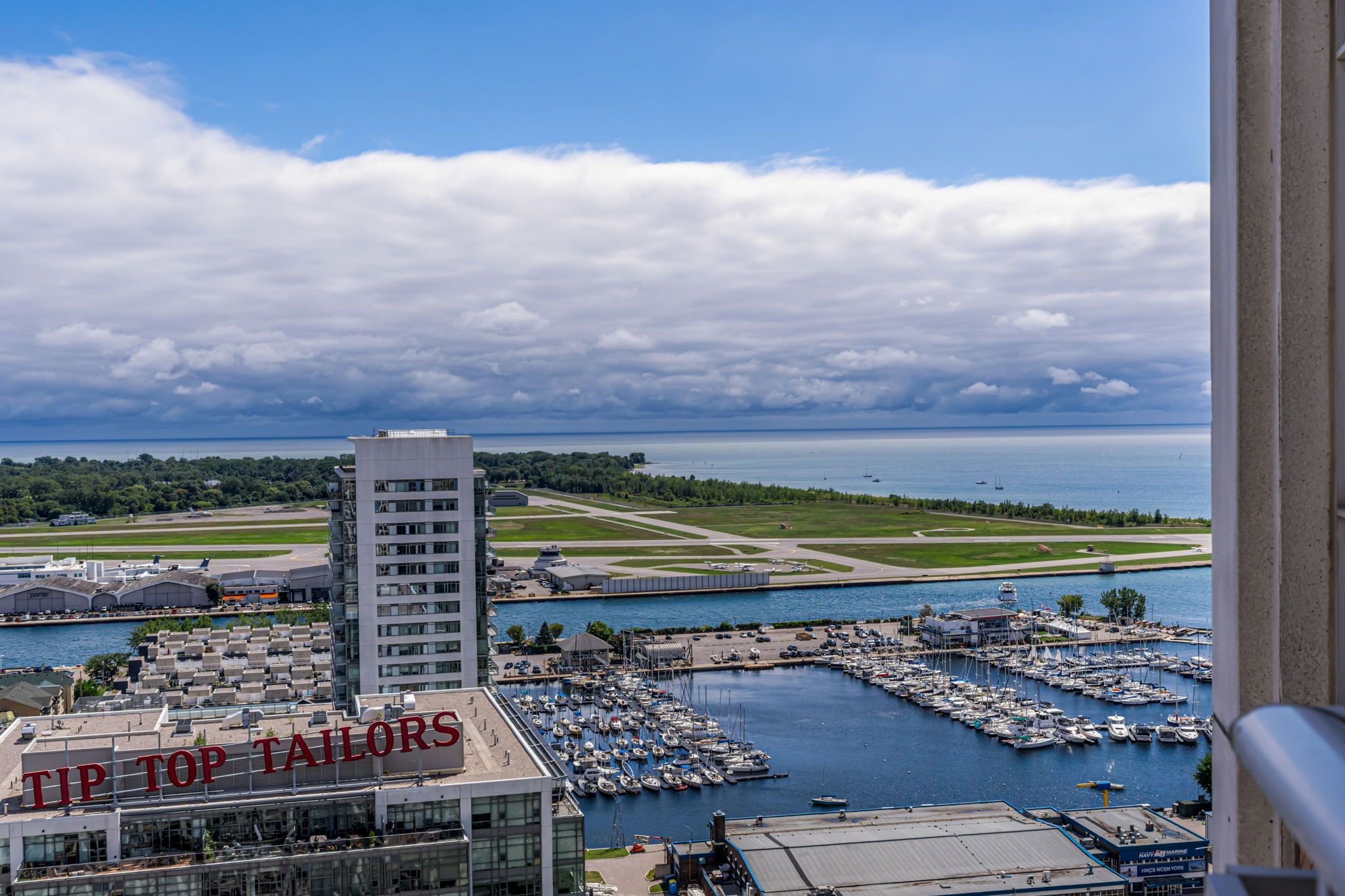 Looking for a large, almost 1400 sq ft condo in downtown toronto with parking and locker? This is the one you want. A beautifully spacious 2 bed+den, two bathrooms, two balconies (110 sq ft total), se corner unit with stunning uninterrupted panoramic views of lake ontario, toronto islands, coronation park and the cn tower. Designed by quadrangle architects, this building offers high-end living in the popular waterfront district. The site is part of the revitalization of the historic fort york area, offering a great mix of urban energy and waterfront proximity. Engineered hardwood floors, floor-ceiling windows, 9 ft ceilings, granite countertops, marble bathroom vanity and floor tiles, upgraded ac / ecobee thermostats, and quality farrow & ball paint in 2024 all make this a well-maintained and luxurious home. The primary bedroom includes a generous walk-in closet and 4 pc ensuite bathroom. The second bedroom is adjacent to the second bathroom for your guests' convenience. If you need to use the den as a home office, or as an additional guest room, the french doors will give you privacy. Every single room has windows and natural light, and two south exposure balconies complete the picture. The harbour club, located on the 11th floor is for the exclusive use of residents and their guests and features an indoor pool with 12 ft high floor-to-ceiling windows offering panoramic views, a whirlpool hot tub, wrap-around promenade deck and terrace with loungers, bbq area, cardio room, weight training room, yoga room, theatre room and party room. Guest suites and a library are on the 2nd floor and a landscaped courtyard garden is available for residents' use. With ample visitor parking and fob-controlled, secure bike lockers on the ground level, this building has it all!