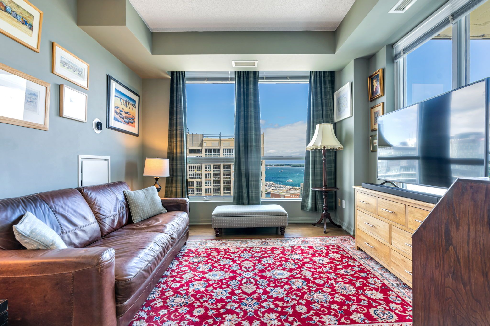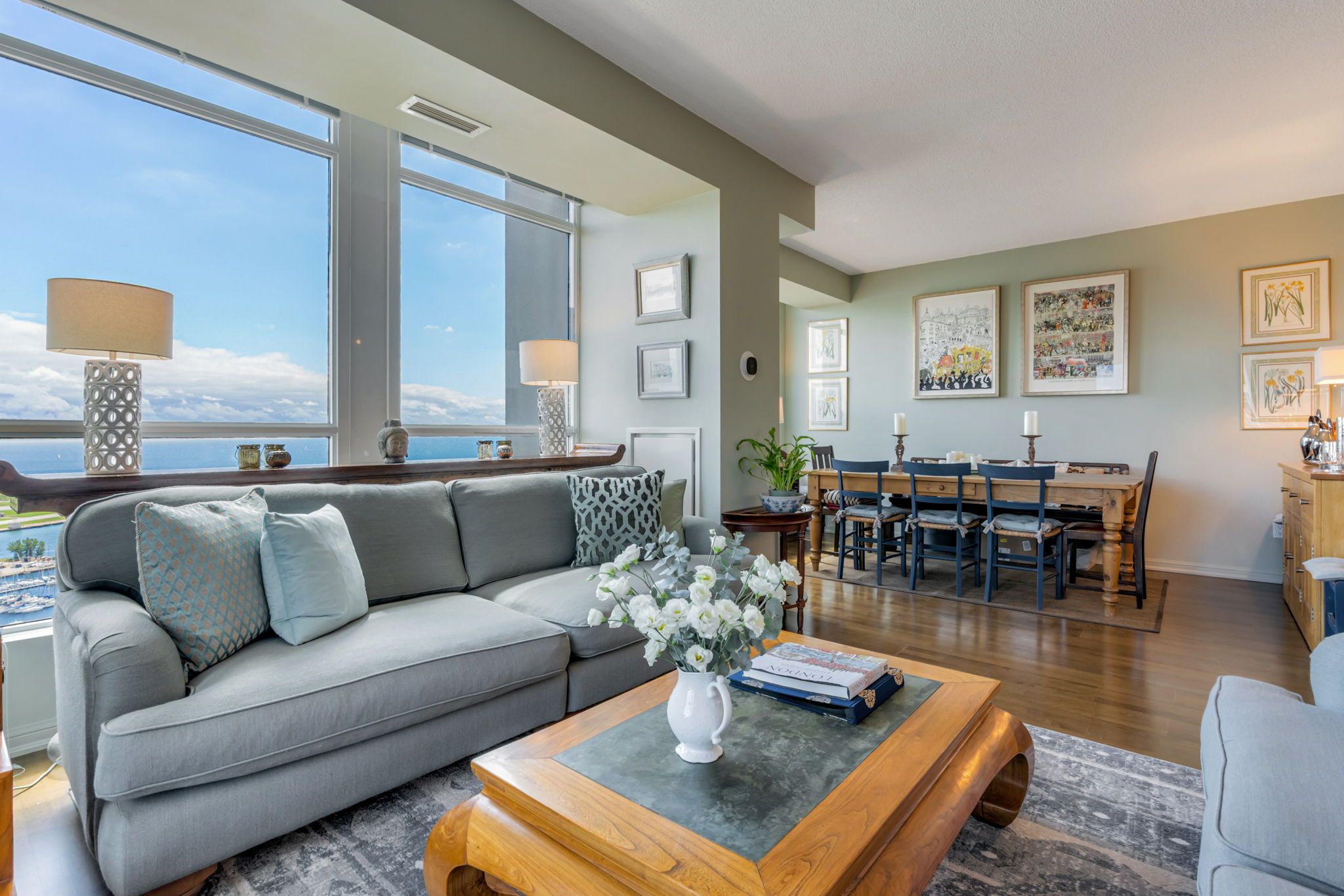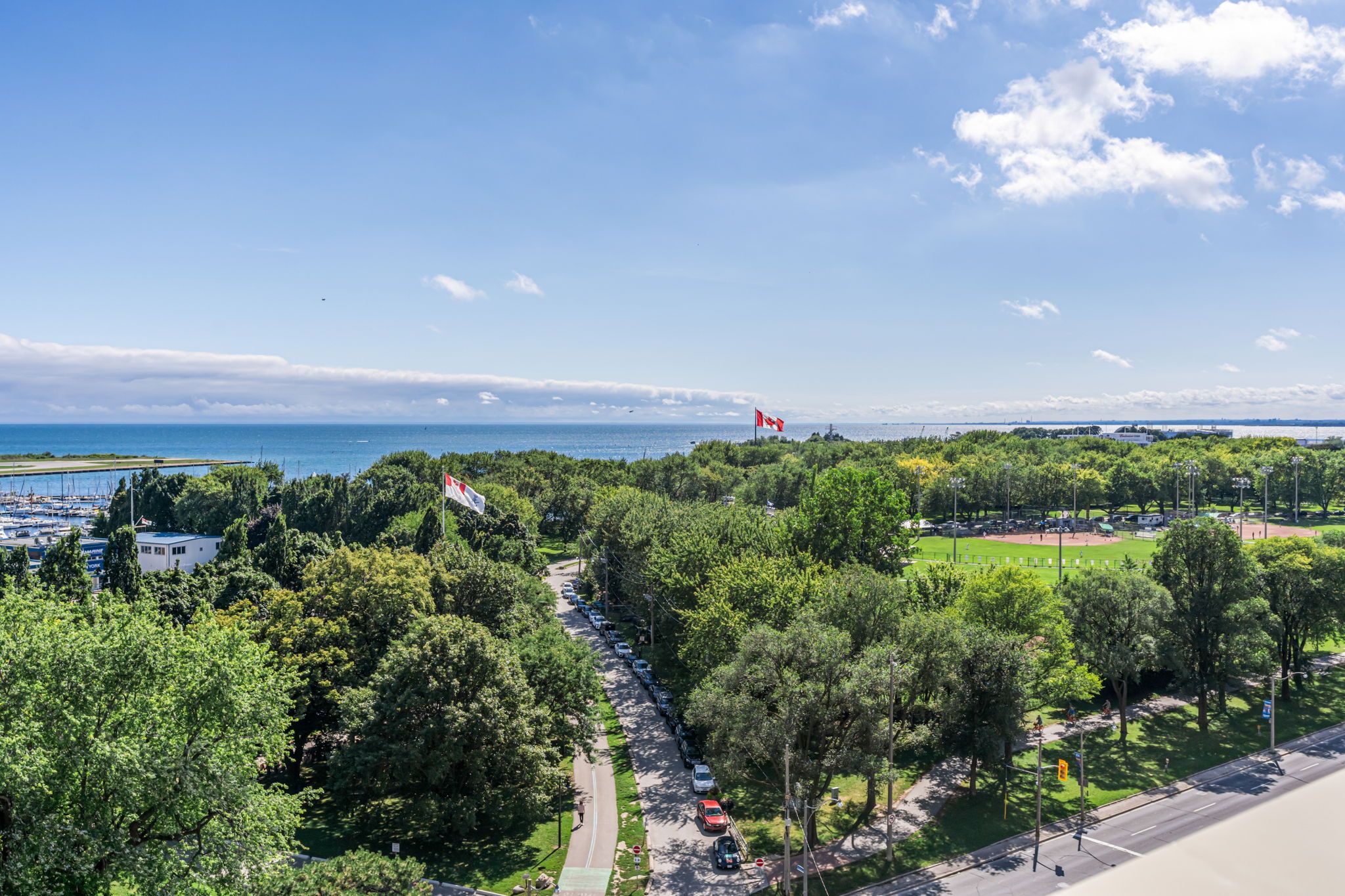 Looking for a large, almost 1400 sq ft condo in downtown toronto with parking and locker? This is the one you want. A beautifully spacious 2 bed+den, two bathrooms, two balconies (110 sq ft total), se corner unit with stunning uninterrupted panoramic views of lake ontario, toronto islands, coronation park and the cn tower. Designed by quadrangle architects, this building offers high-end living in the popular waterfront district. The site is part of the revitalization of the historic fort york area, offering a great mix of urban energy and waterfront proximity. Engineered hardwood floors, floor-ceiling windows, 9 ft ceilings, granite countertops, marble bathroom vanity and floor tiles, upgraded ac / ecobee thermostats, and quality farrow & ball paint in 2024 all make this a well-maintained and luxurious home. The primary bedroom includes a generous walk-in closet and 4 pc ensuite bathroom. The second bedroom is adjacent to the second bathroom for your guests' convenience. If you need to use the den as a home office, or as an additional guest room, the french doors will give you privacy. Every single room has windows and natural light, and two south exposure balconies complete the picture. The harbour club, located on the 11th floor is for the exclusive use of residents and their guests and features an indoor pool with 12 ft high floor-to-ceiling windows offering panoramic views, a whirlpool hot tub, wrap-around promenade deck and terrace with loungers, bbq area, cardio room, weight training room, yoga room, theatre room and party room. Guest suites and a library are on the 2nd floor and a landscaped courtyard garden is available for residents' use. With ample visitor parking and fob-controlled, secure bike lockers on the ground level, this building has it all!