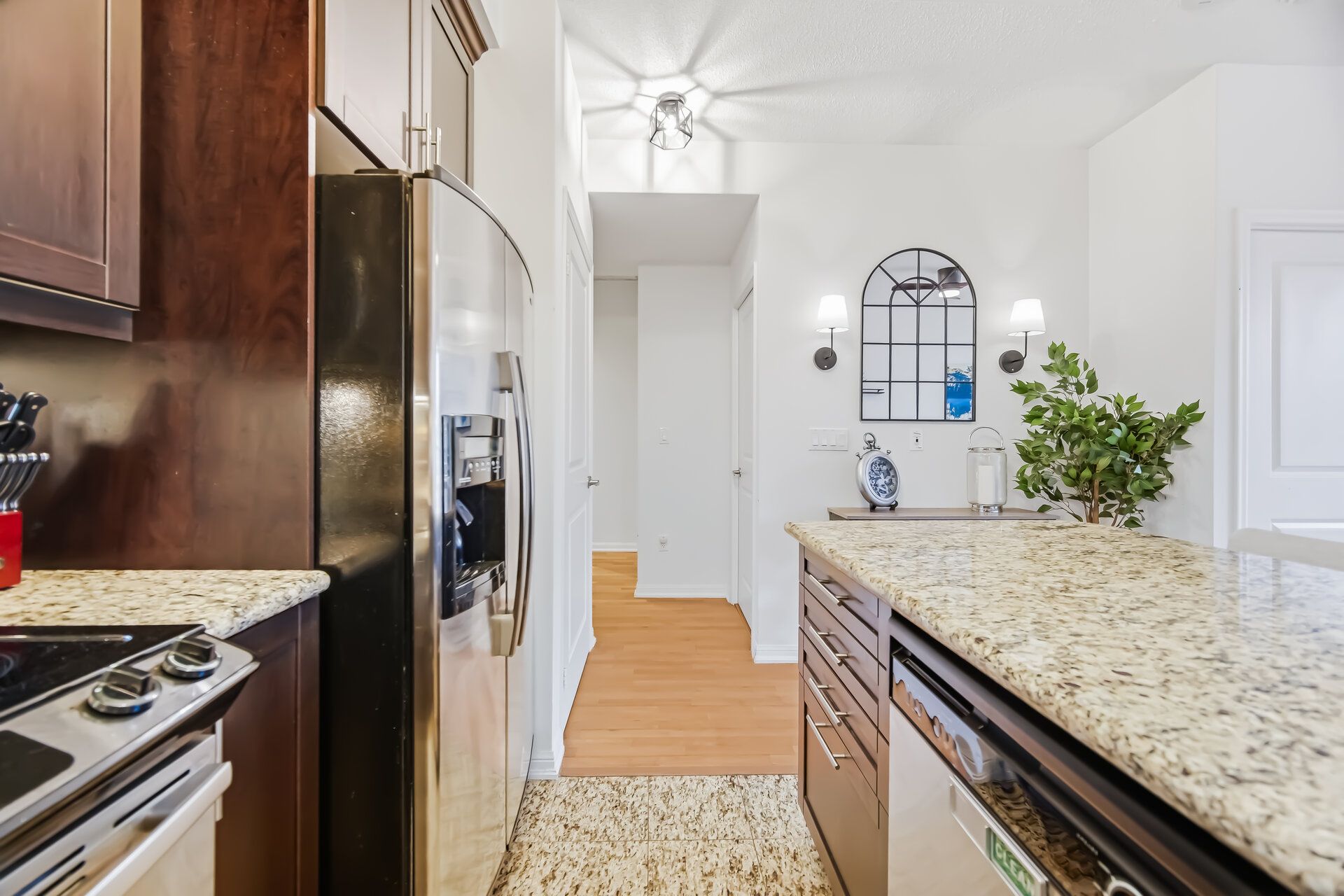 • Modern kitchen featuring granite countertops and premium appliances for convenience.