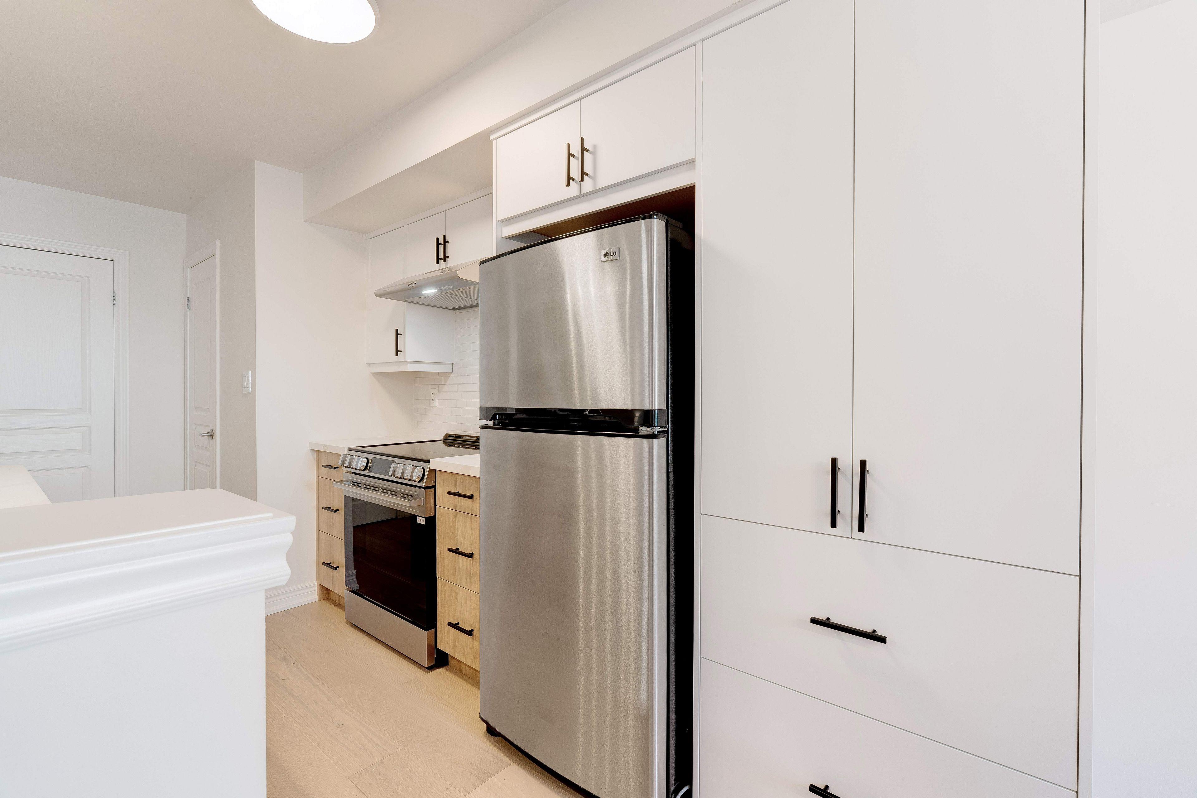 • White oak floors throughout enhance the stylish living space.