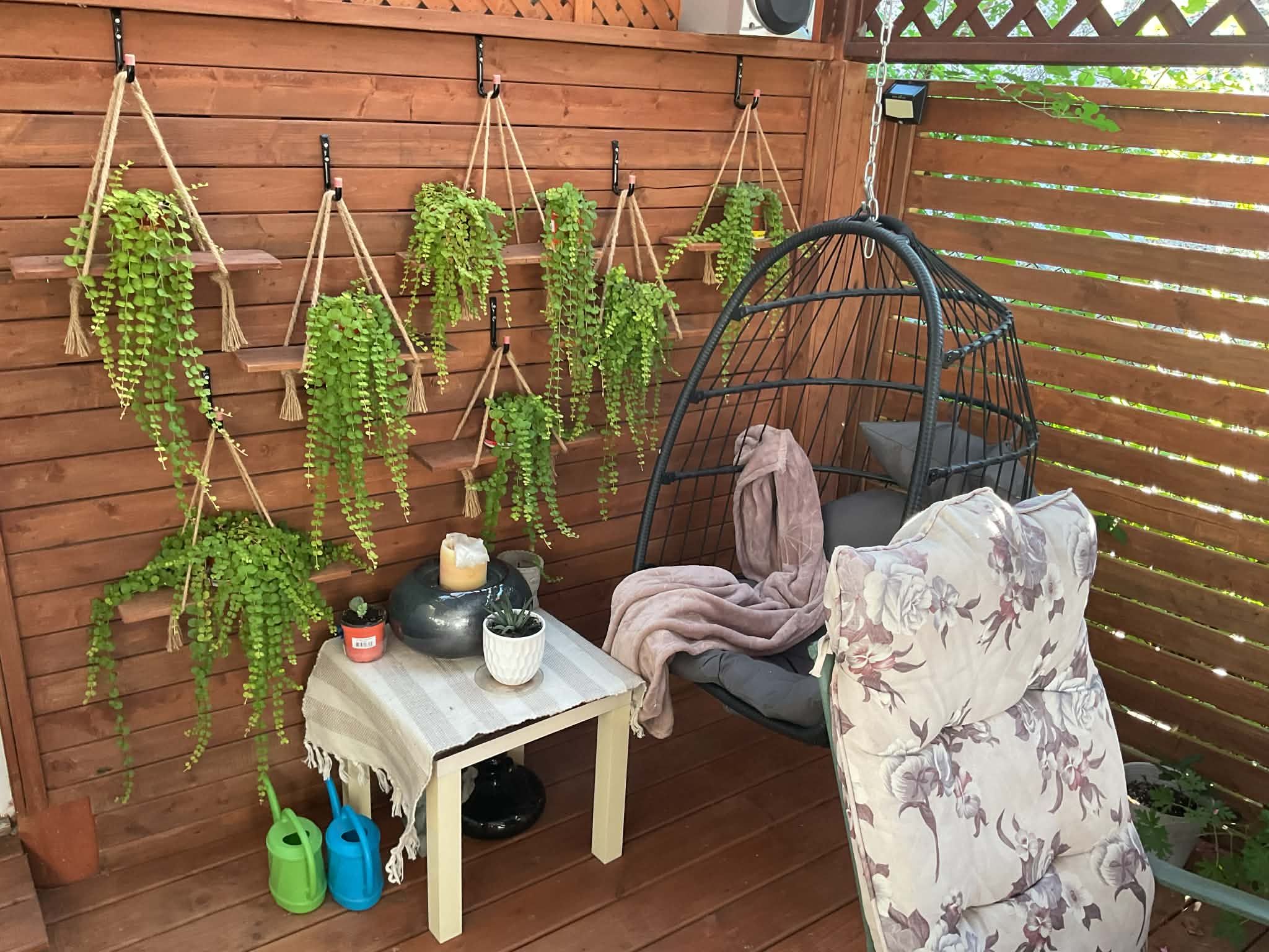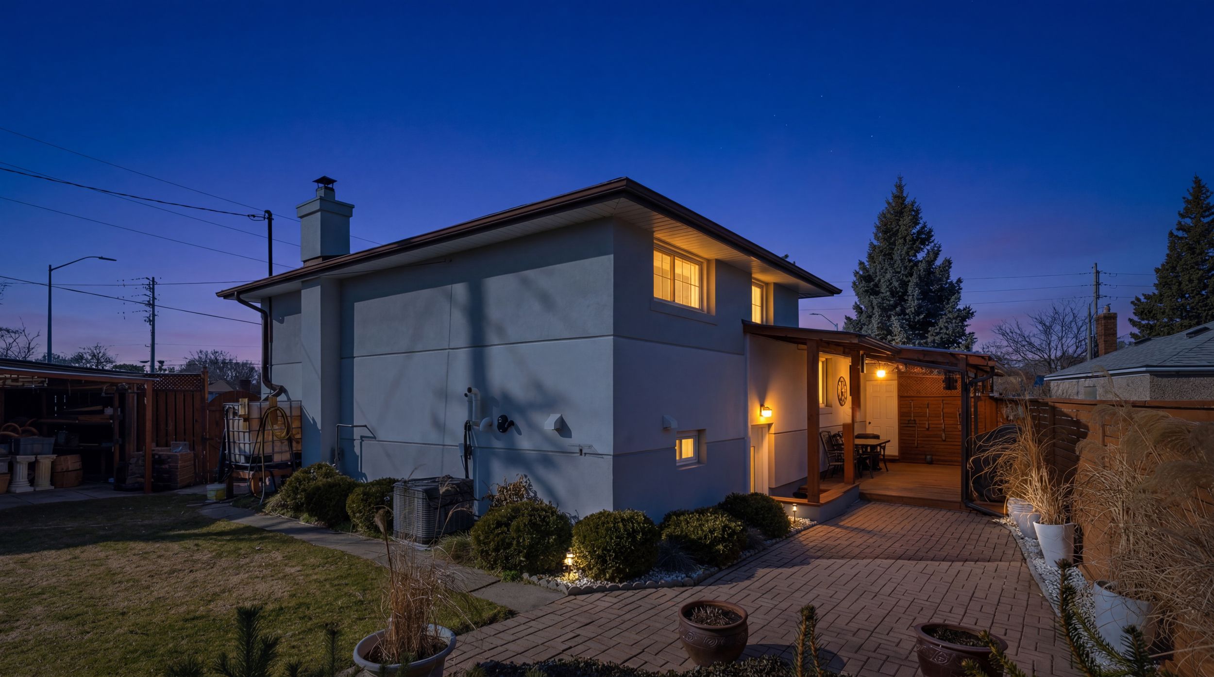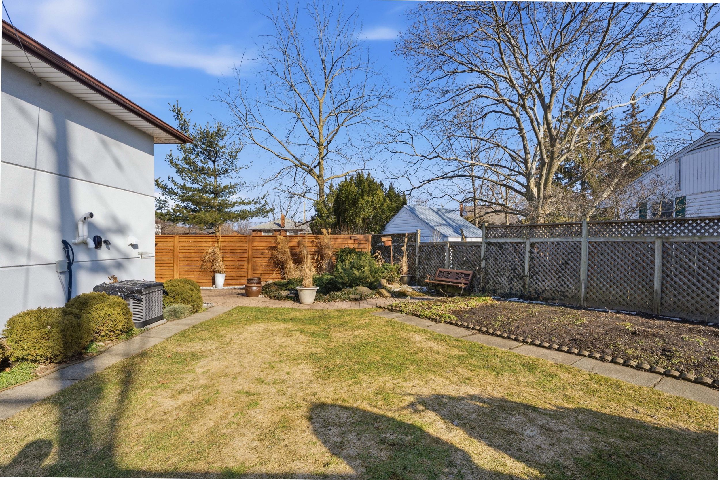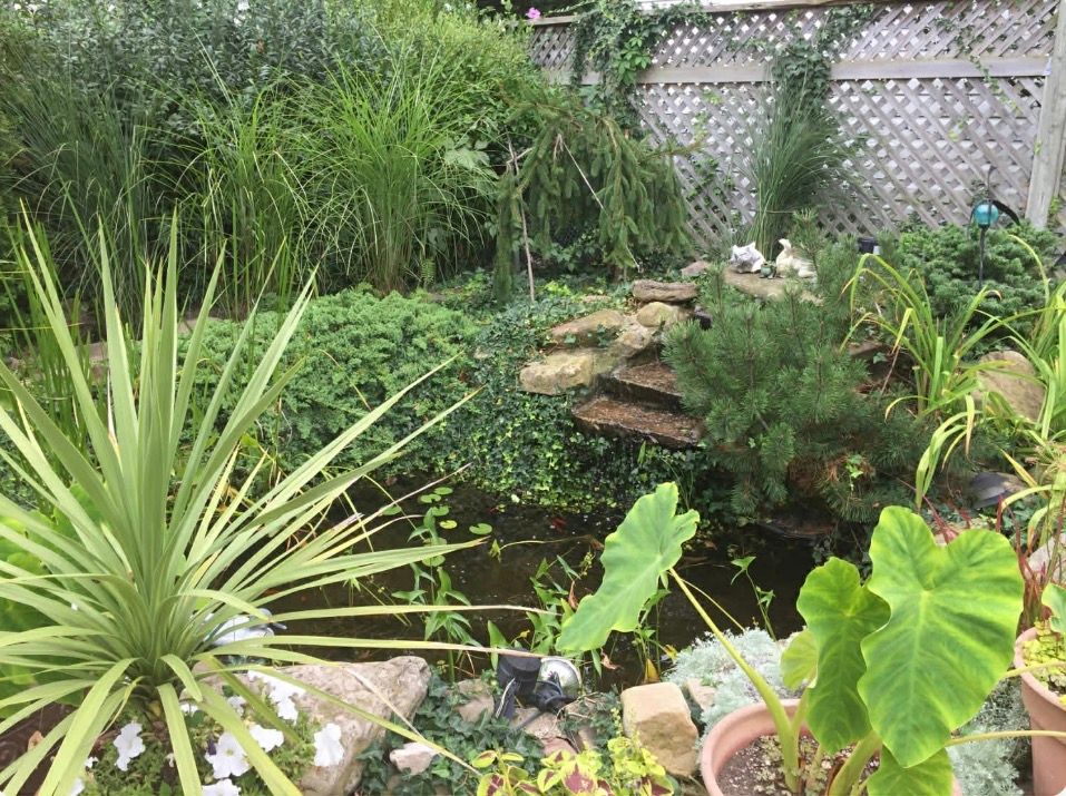 • Private backyard with covered porch, pond, and vegetable garden.