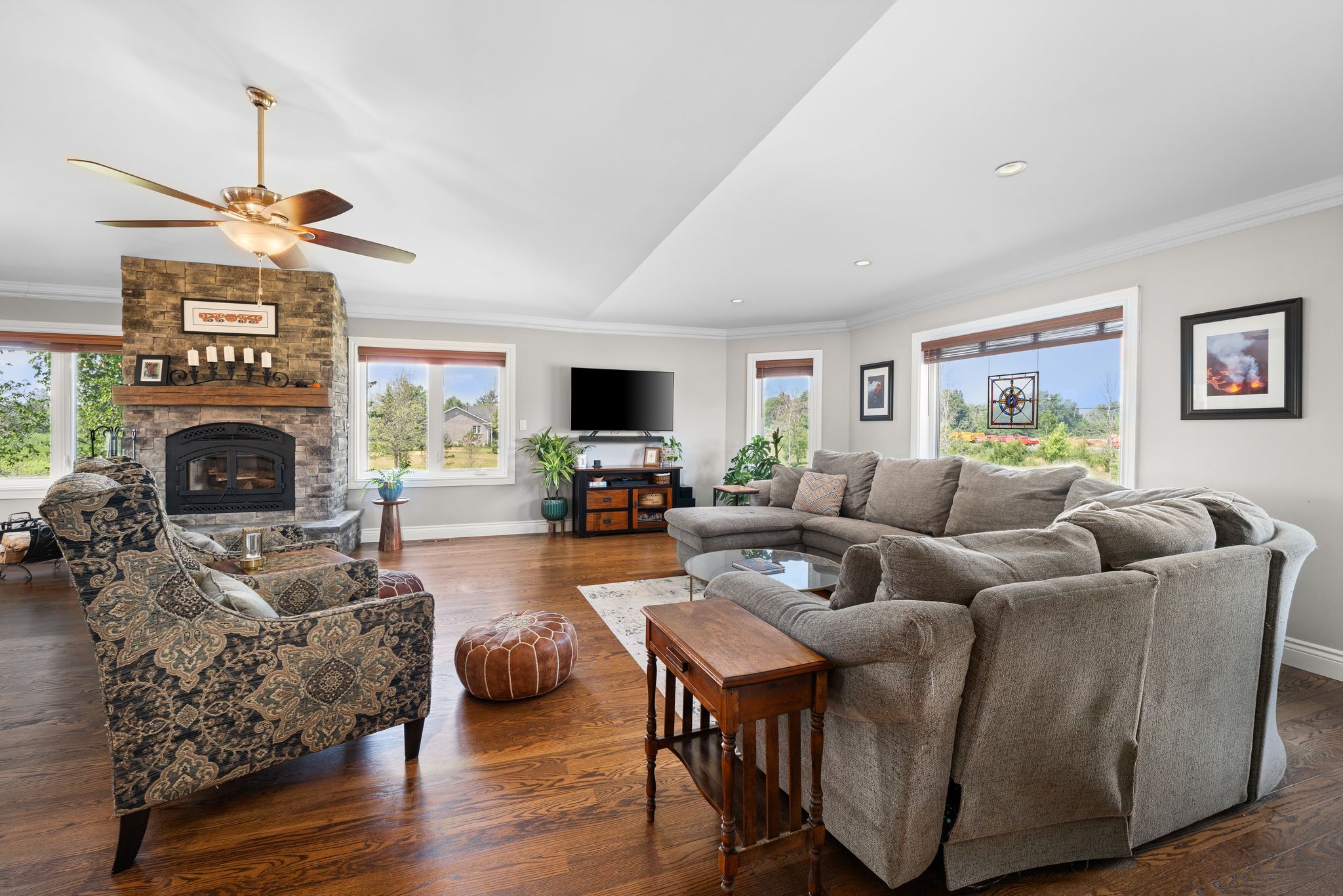 Welcome to this stunning 20-year-old brick bungalow, meticulously set on a sprawling 3-acre lot. Boasting 3,322 square feet of luxurious living space, this home features a fully finished walk-out basement, offering ample room for relaxation and entertainment. Over the past five years, this residence has undergone extensive renovations and updates, ensuring modern comfort and style throughout. The exterior is a testament to professional landscaping, creating an inviting and picuresque setting. Inside, you'll find two cozy wood-burning fireplaces, perfect for chilly evenings. The expansive primary bedroom suite is a true retreat, complete with a newly renovated ensuite bathroom featuring state-of-the-art touchscreen mirrors. Custom wet bar with built-ins in spacious made for entertaining recreation and games room. Separate entrance to large office, perfect for the work at home professional. Outside, enjoy the large paved drive leading to an attached three-car garage. Unwind in the hot tub, surrounded by the beauty of your professionally landscaped grounds. This home must be seen to fully appreciate all that it has to offer!