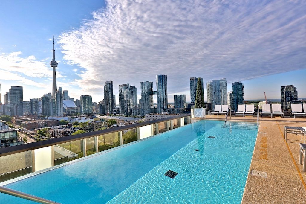 Toronto's finest. Elevated. A rare penthouse perched above the energy of king west at the iconic thompson residences. This beautifully composed, super functional one bed layout boasts over 774 sqf. Of thoughtfully curated interior and exterior space, where design, light, and proportion come together seamlessly. Floor-to-ceiling windows and exposed 9' concrete ceilings create a calm, sunny, architectural backdrop, while the open-concept layout flows effortlessly into a refined scavolini chef's kitchen with a statement island, gas cooktop and integrated stainless-steel appliances including wine fridge, perfect for the wine aficionado! The primary bedroom is a serene retreat, complete with floor to ceiling windows, built-in closet and a spa-inspired four-piece ensuite. Step onto the private 82 sqf. Balcony and take in clear, unobstructed south views - an ideal setting for quiet mornings, evening aperitifs, or intimate bbqs above the city. Residents enjoy premium amenities including a state-of-the-art gym, outdoor pool, rooftop deck/garden, restaurant, party/meeting room, media room and 24-hour concierge service. Just steps from toronto's most coveted dining, nightlife, and transit via the toronto transit commission, this penthouse offers a refined expression of urban living - elevated, composed, and effortlessly chic.