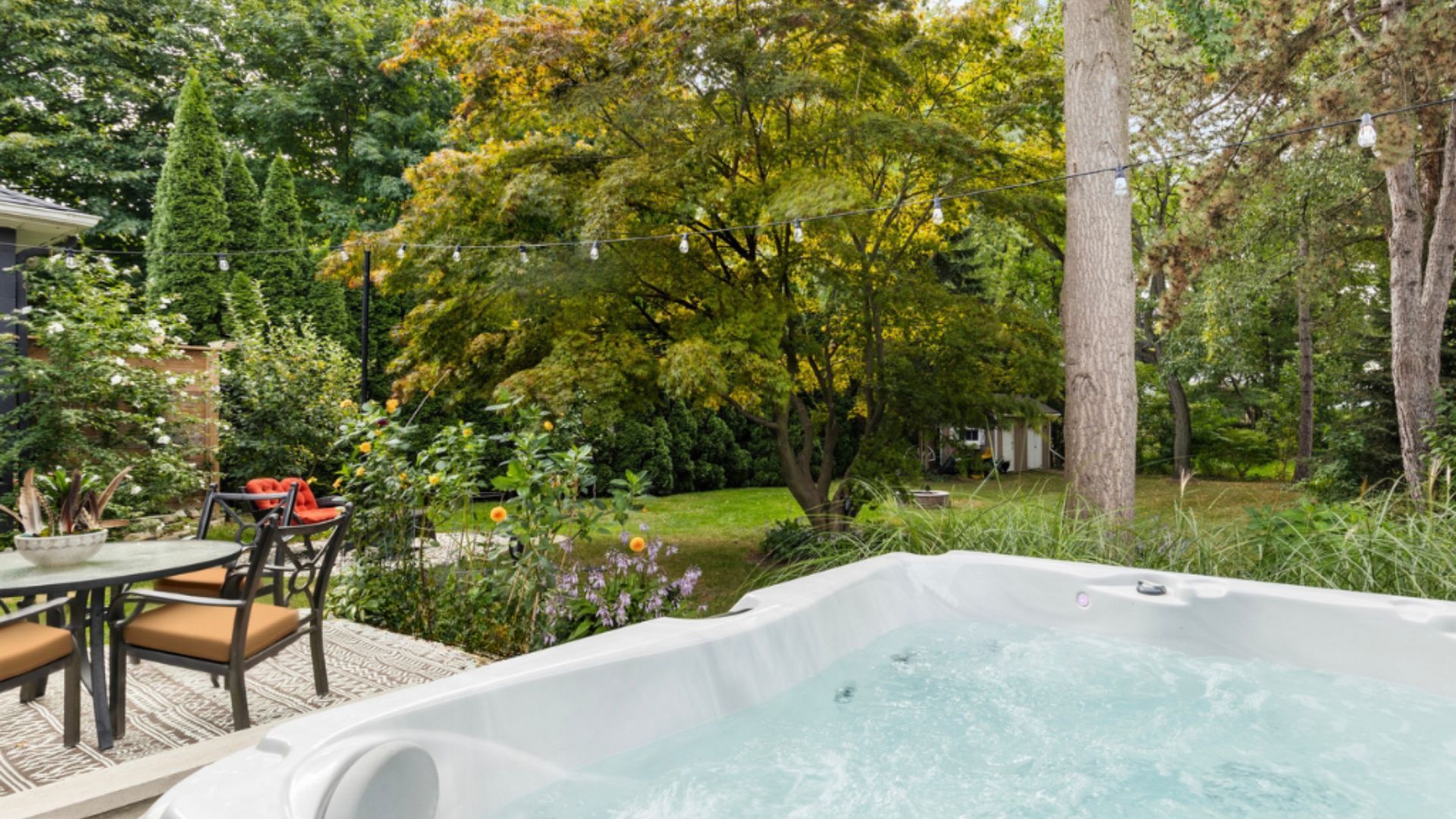 • Private 200-foot lot with mature trees and hot tub.