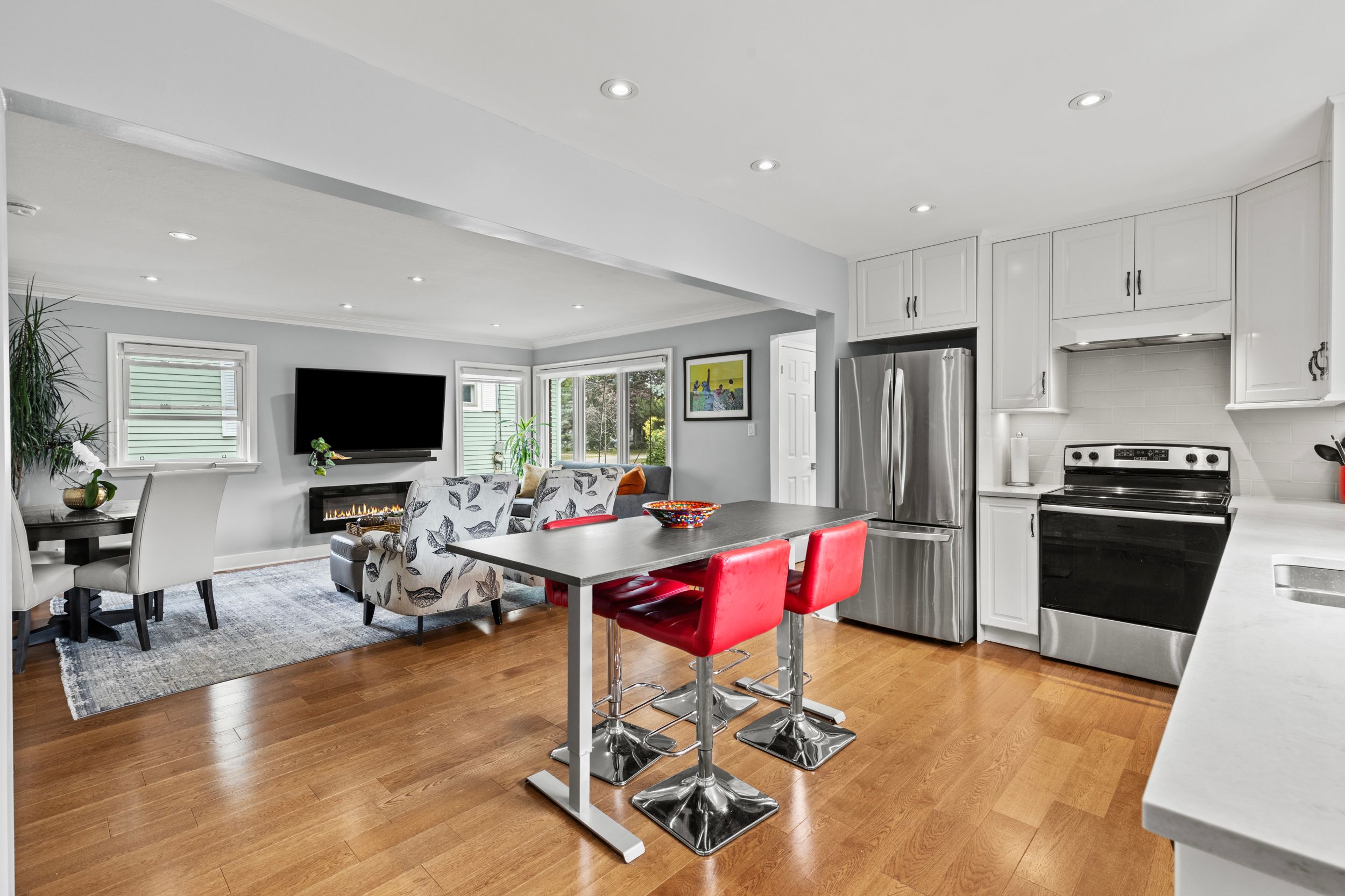 • Open-concept layout with natural light and hardwood floors throughout.
